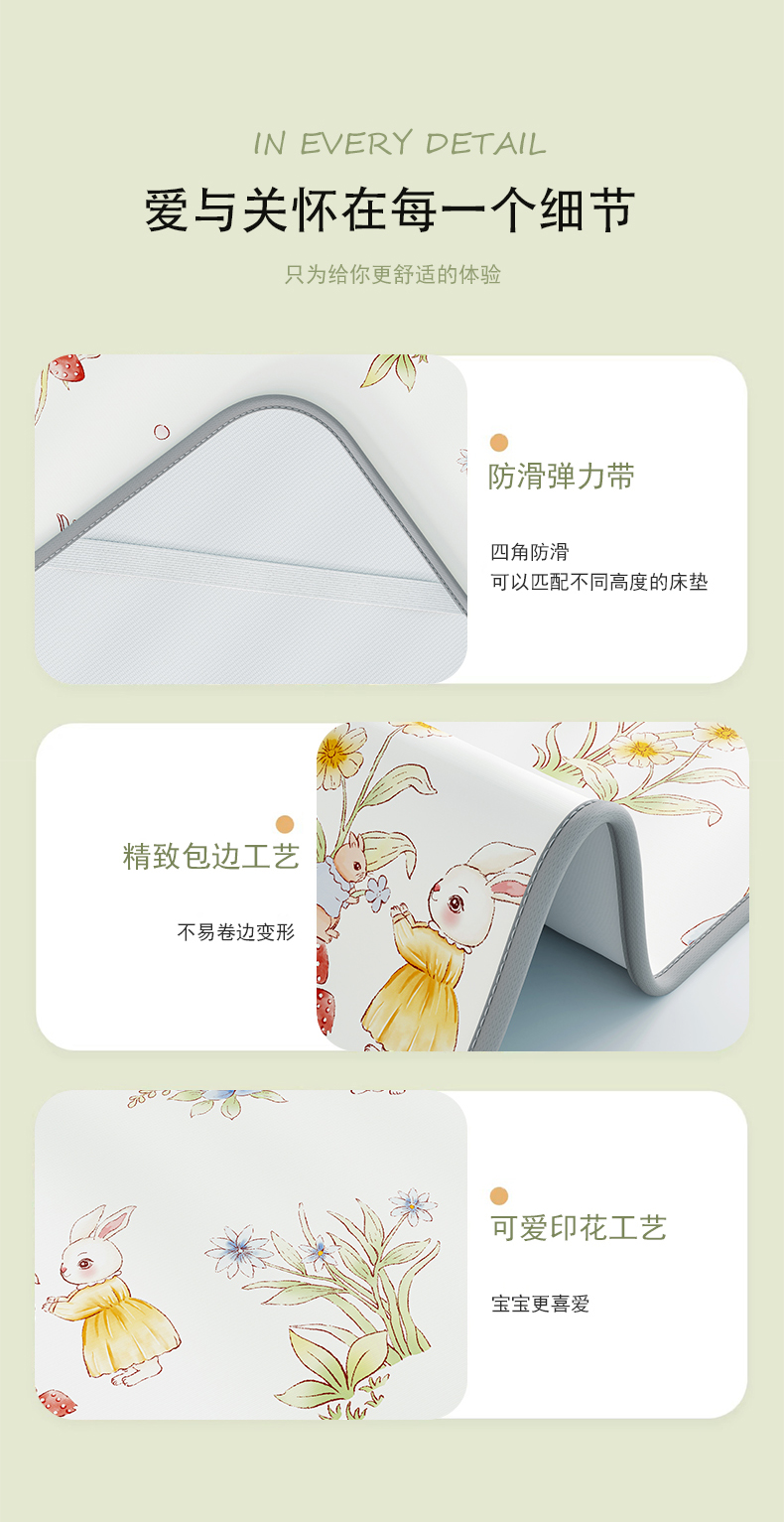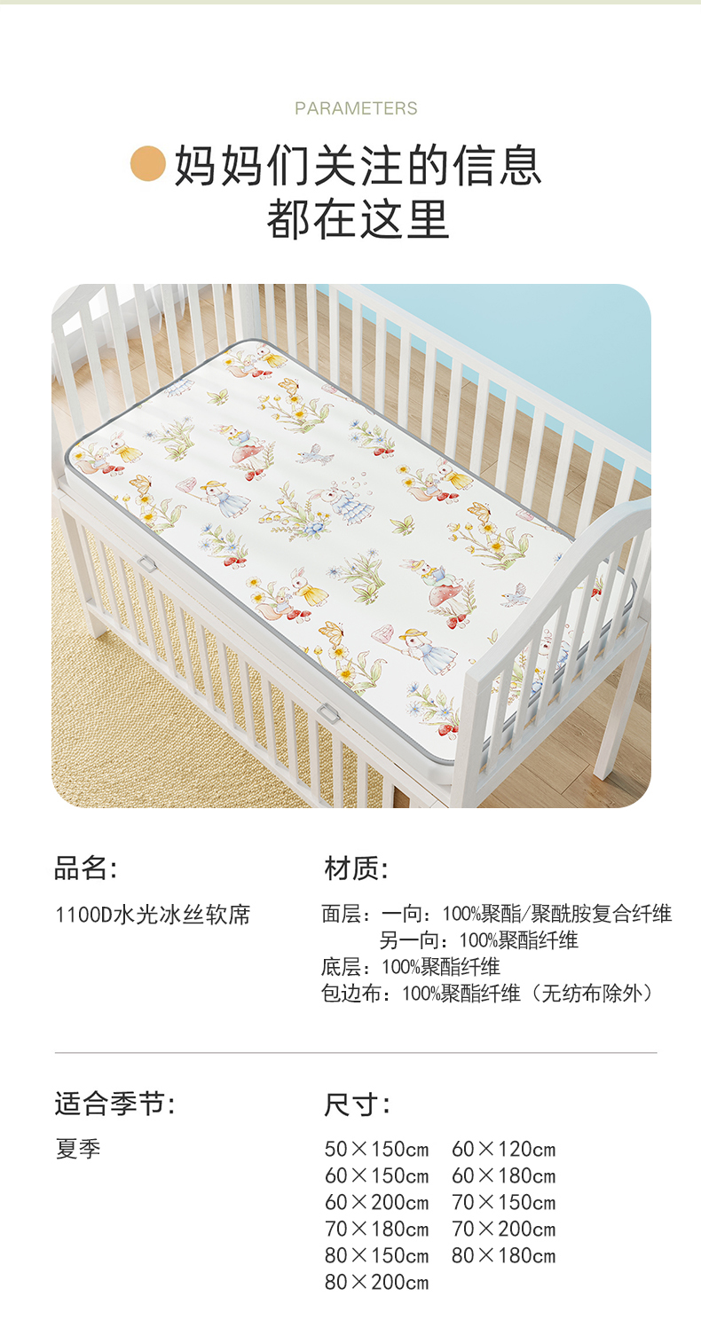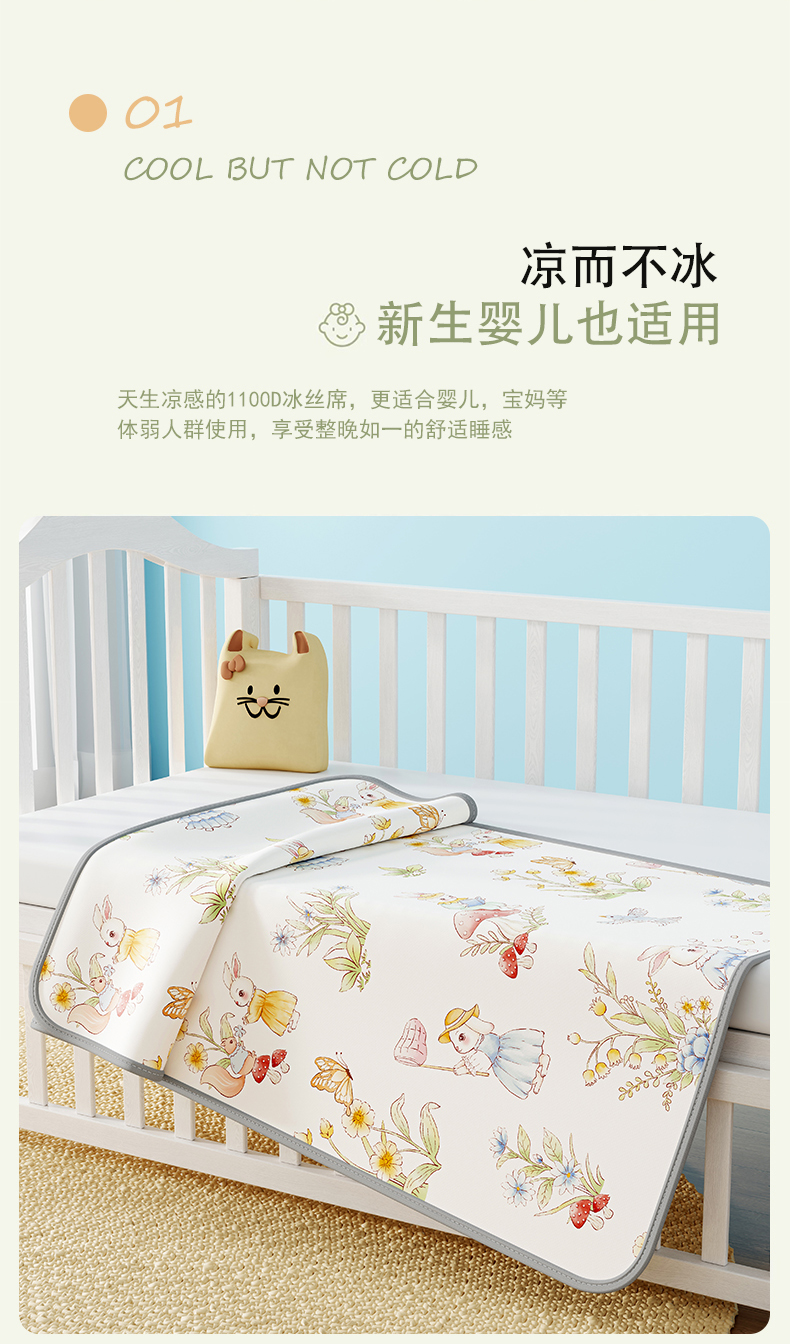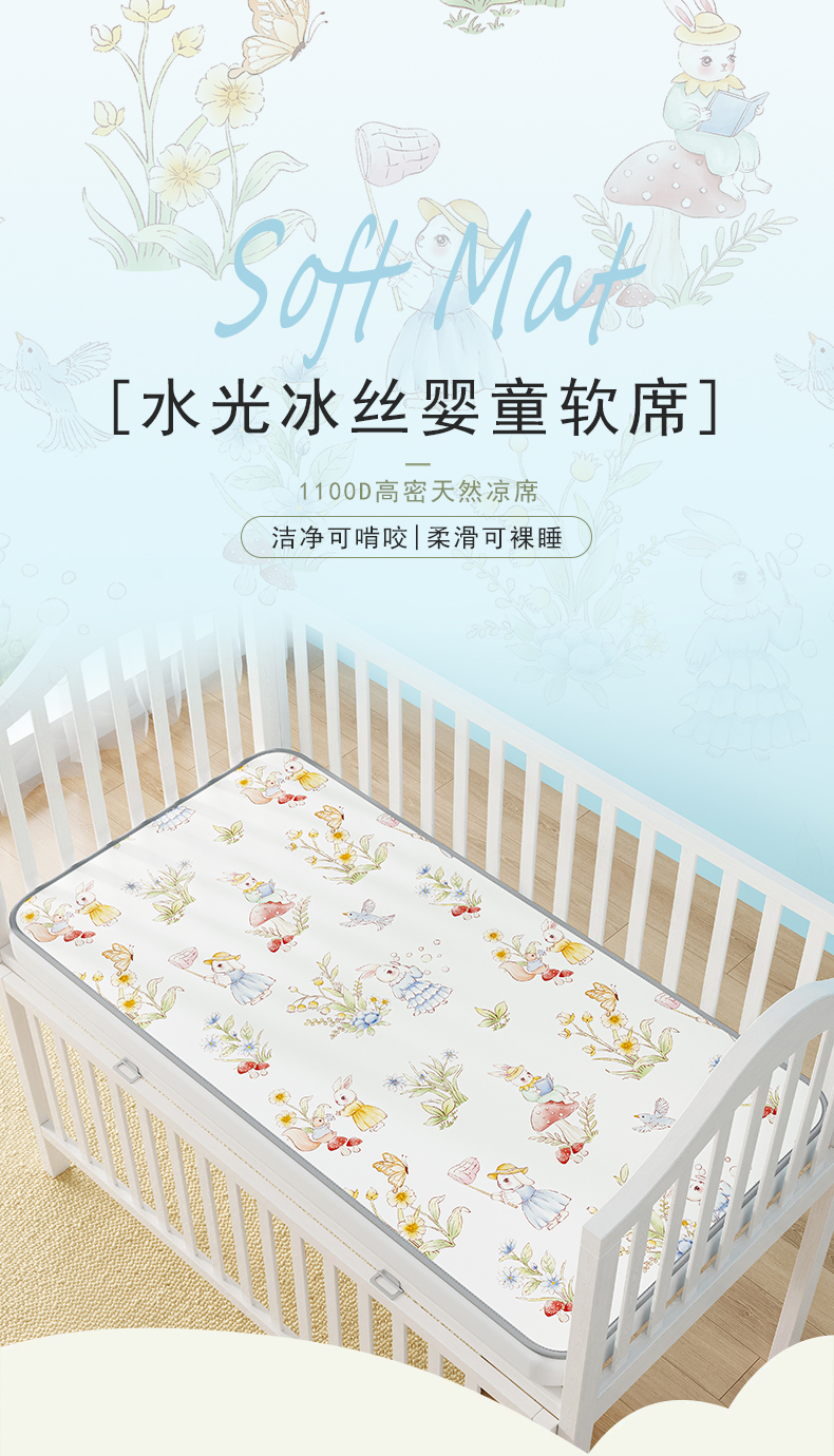 商品名称:奇丝雅 2026新款A类数码印花大版1100D水光冰丝凉席凉席婴儿儿童新生【三明治网底】 精灵小兔【三明治网底】