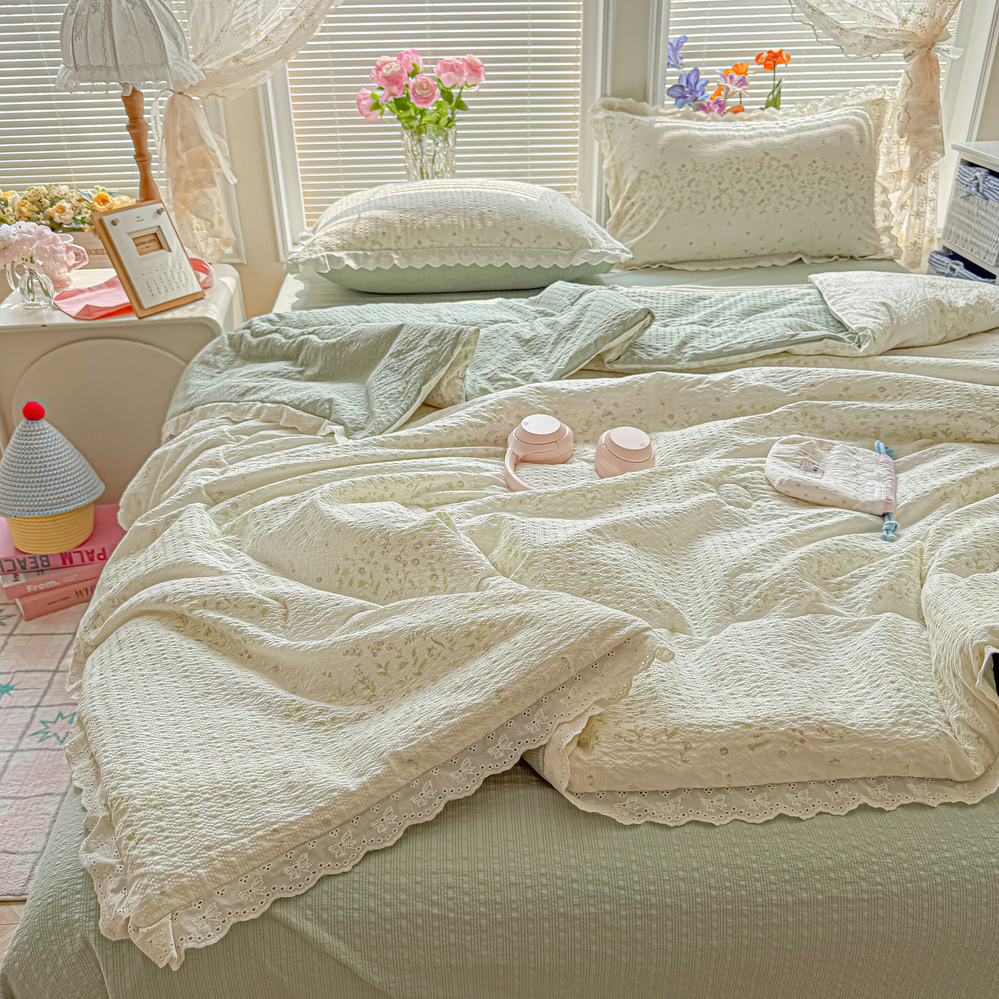 商品名称:玉海棠家纺 2026新款泡芙纱全棉纯棉蕾丝花边夏被-花笺系列(软乎乎的质感,治愈所有疲惫) 花笺-松间茶事
