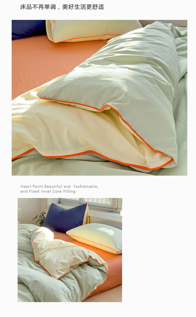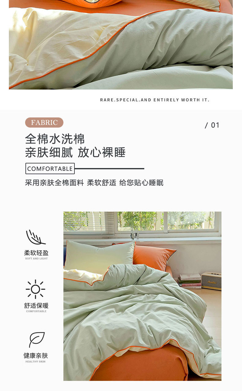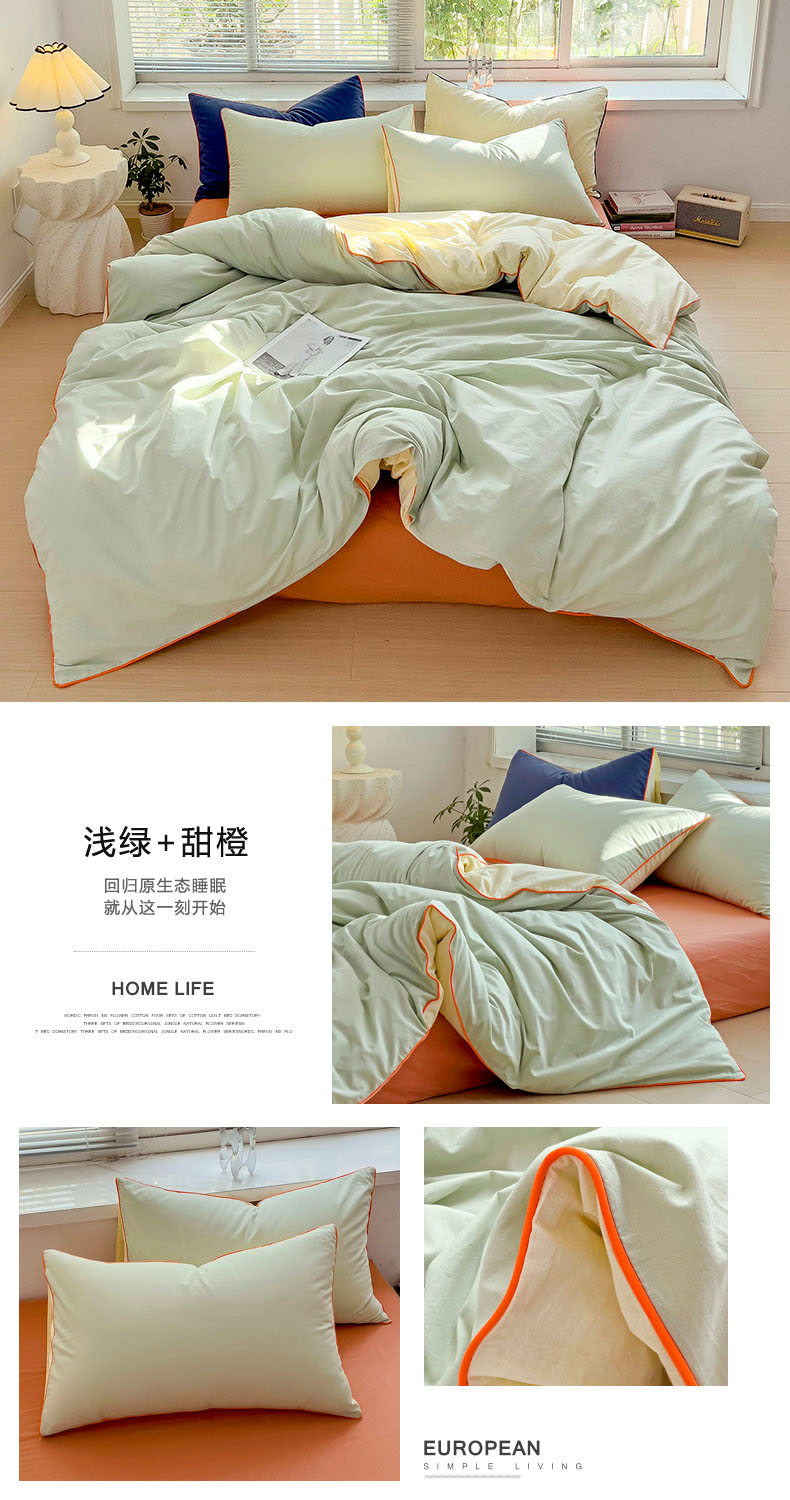 当前位置: 91家纺网 > 商品网购 > 床品套件 > 四件套 > 全棉普通四件套 > 梦家居 2024新款全棉水洗棉纯色滚边四件套 浅绿+甜橙