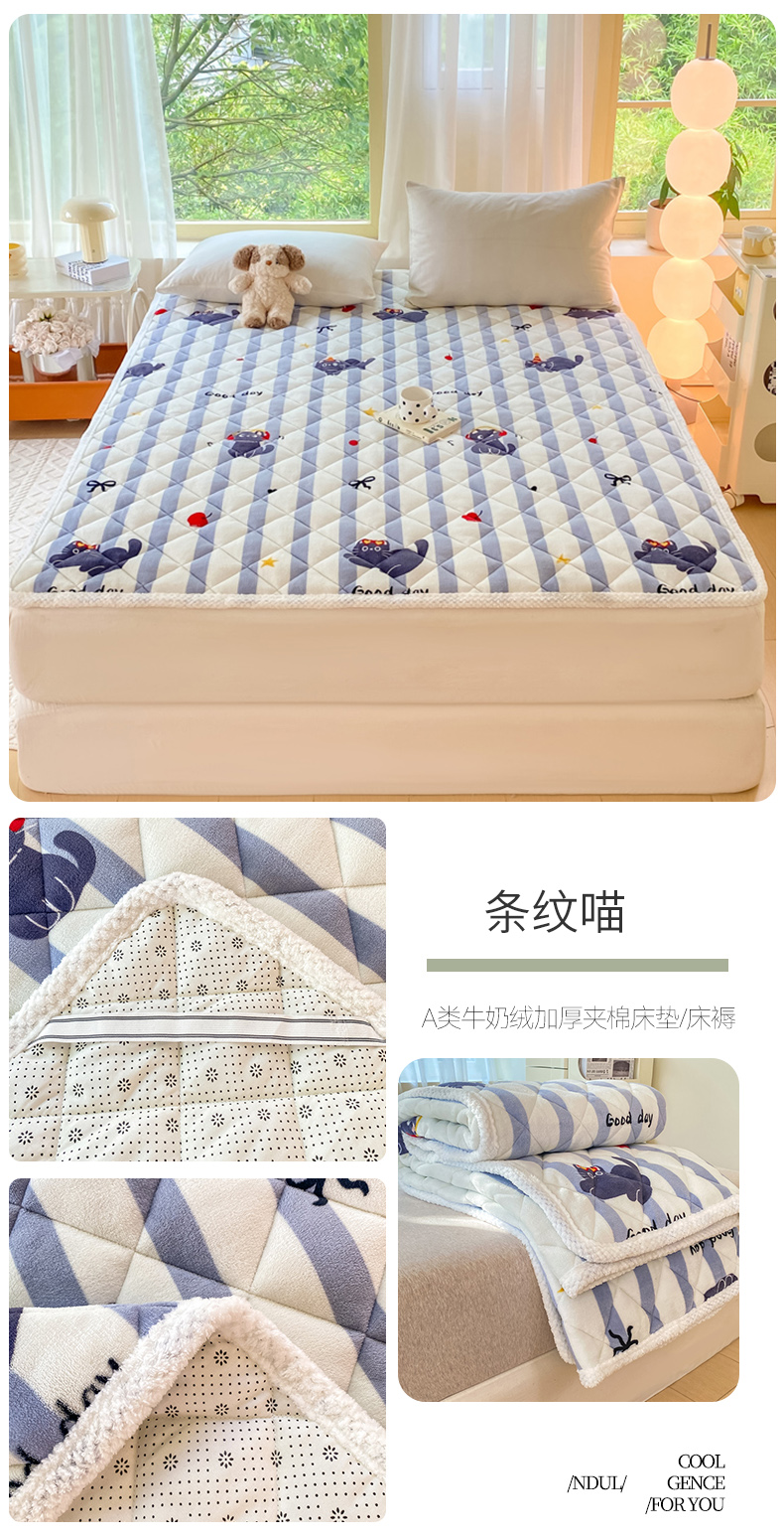 商品名称:正邦家纺 2024新款牛奶绒床垫小清新加厚床褥保暖宽包边可机洗床护垫床褥 条纹喵
