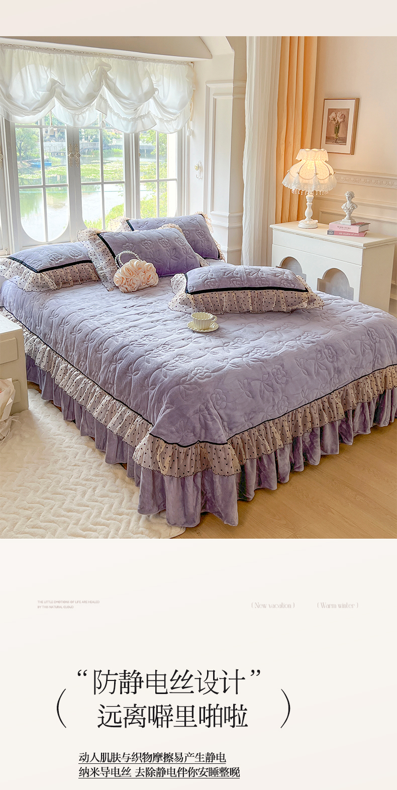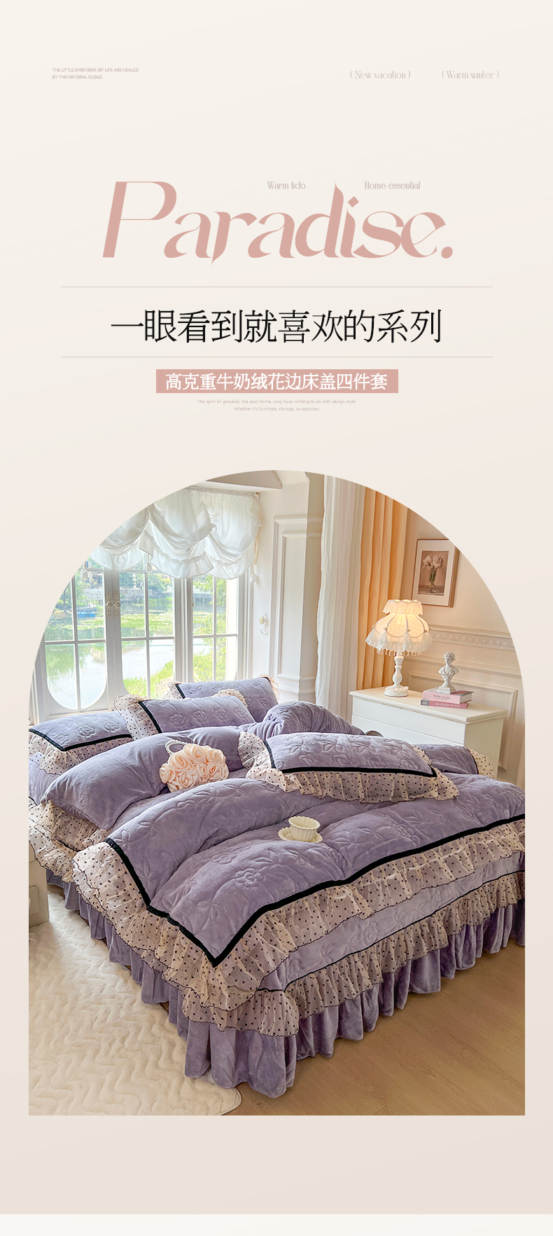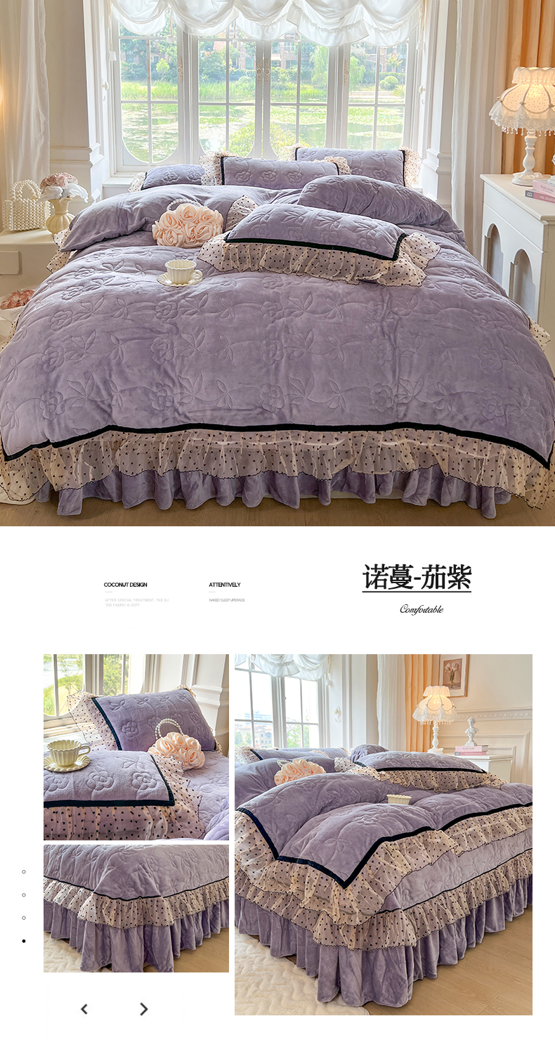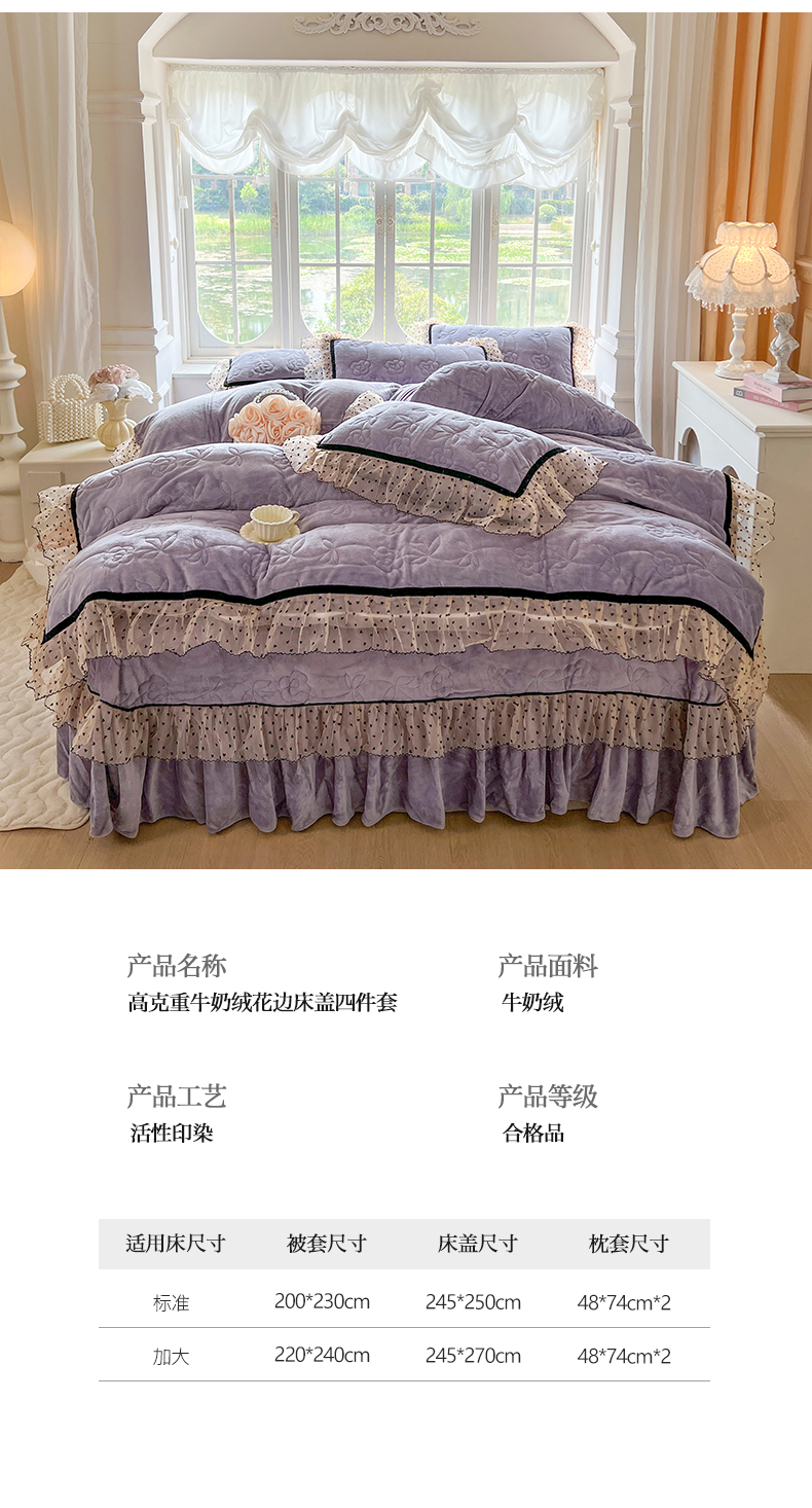 商品名称:麒豆豆 2024新款高克重时尚花边牛奶绒四件套床盖款-诺蔓 诺蔓-茄紫