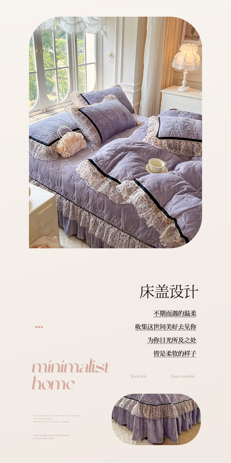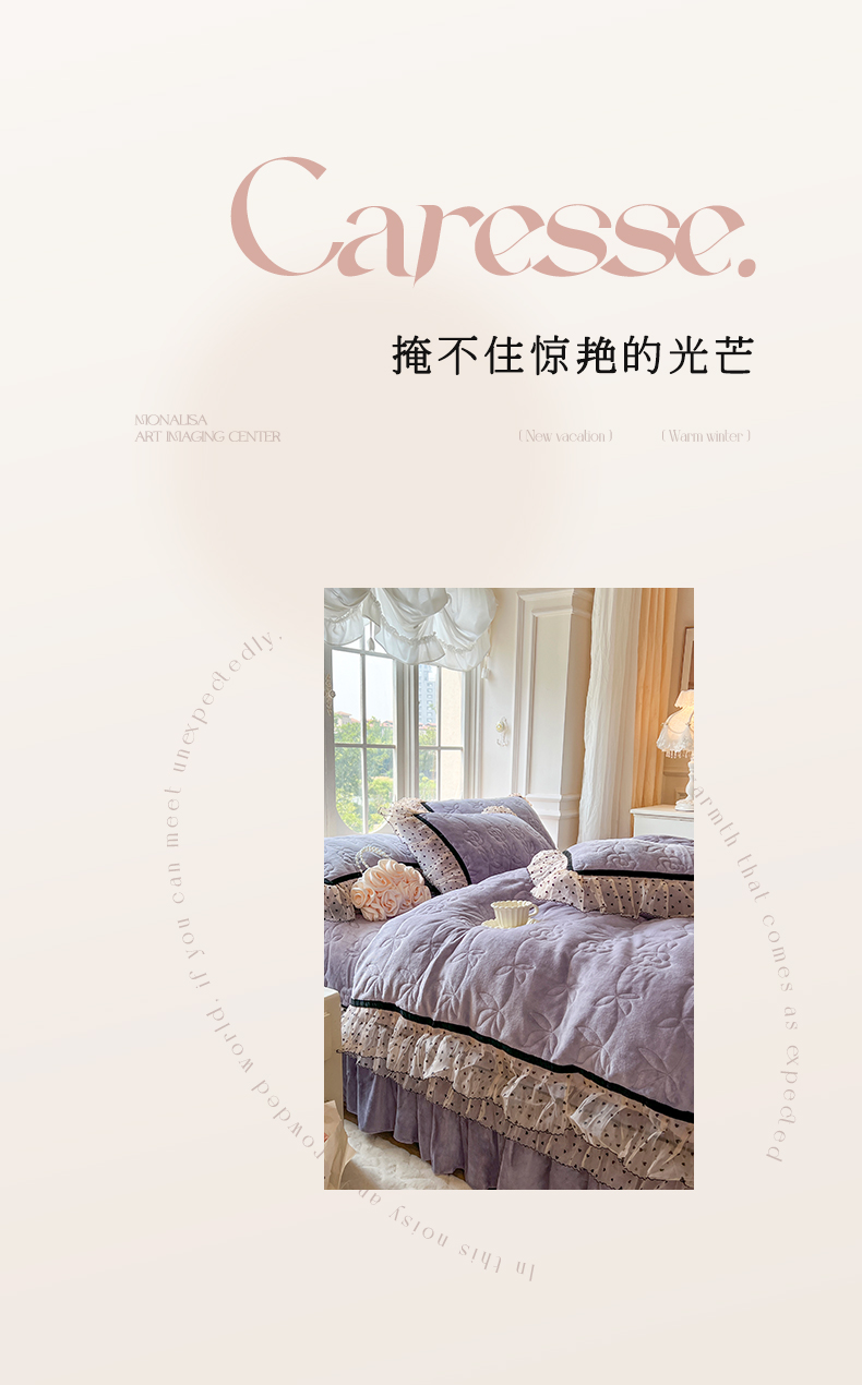 麒豆豆 2024新款高克重时尚花边牛奶绒四件套床盖款-诺蔓 诺蔓-茄紫