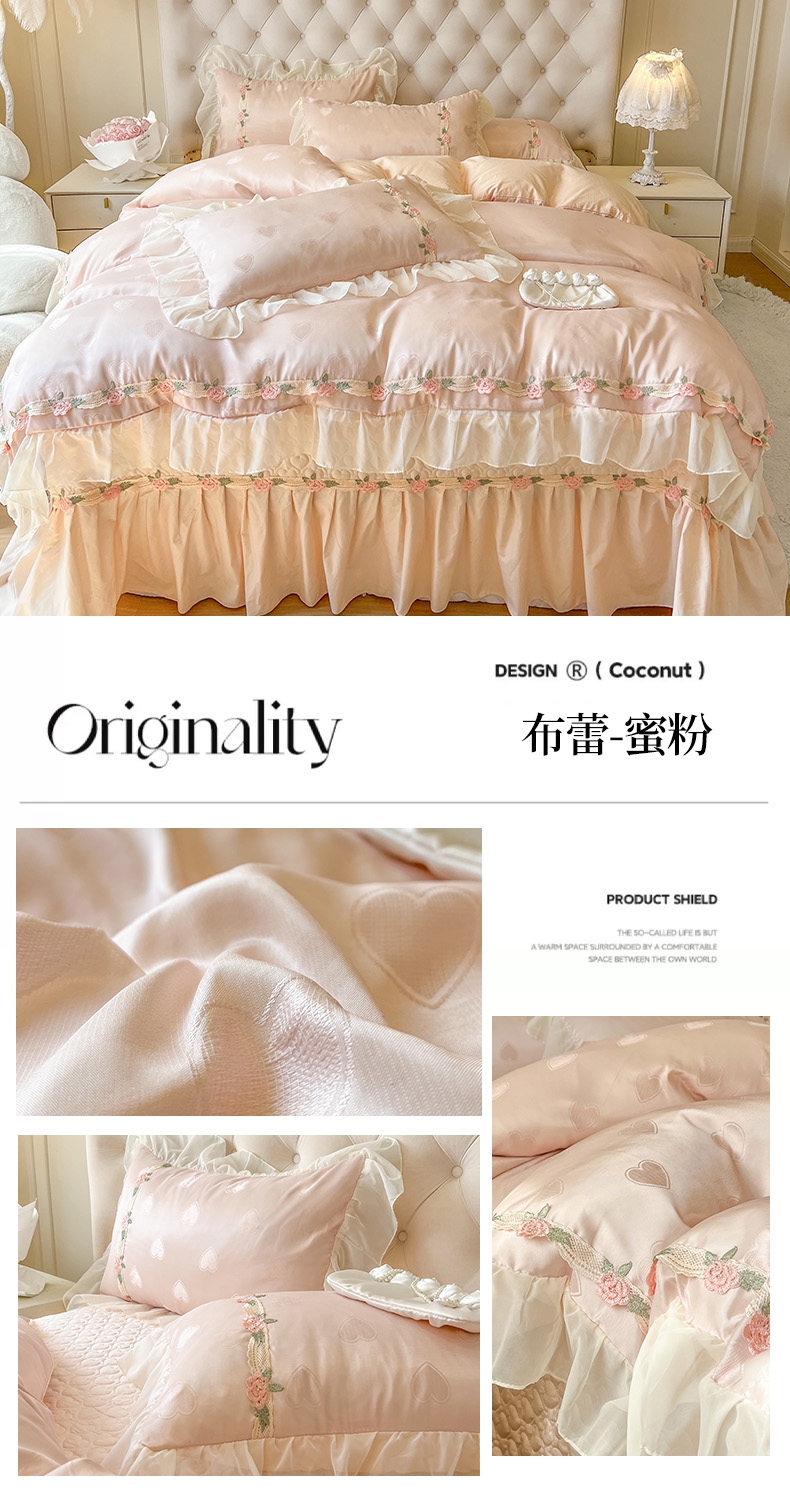 当前位置: 91家纺网 > 商品网购 > 床品套件 > 四件套 > 其它四件套 > 瑞宝 2025新款全棉法式花边贡缎提花四件套-布蕾(控价床单 270起 床盖 300起) 布蕾-蜜粉