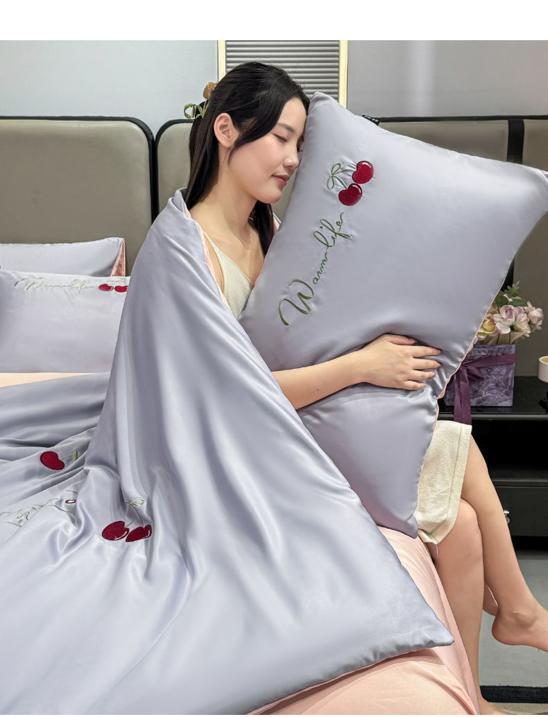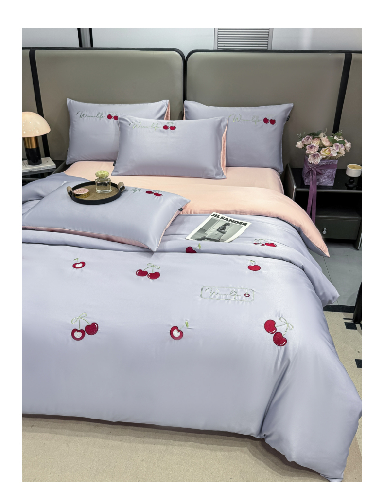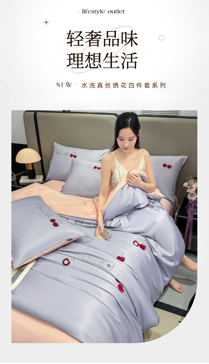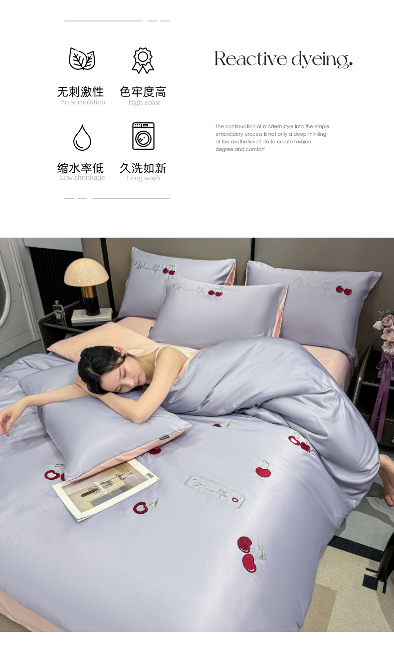 当前位置: 91家纺网 > 商品网购 > 床品套件 > 四件套 > 水洗真丝四件套 > 乐沐家纺 2025春夏新款水洗真丝绣花冰丝四件套 樱桃-星黛紫