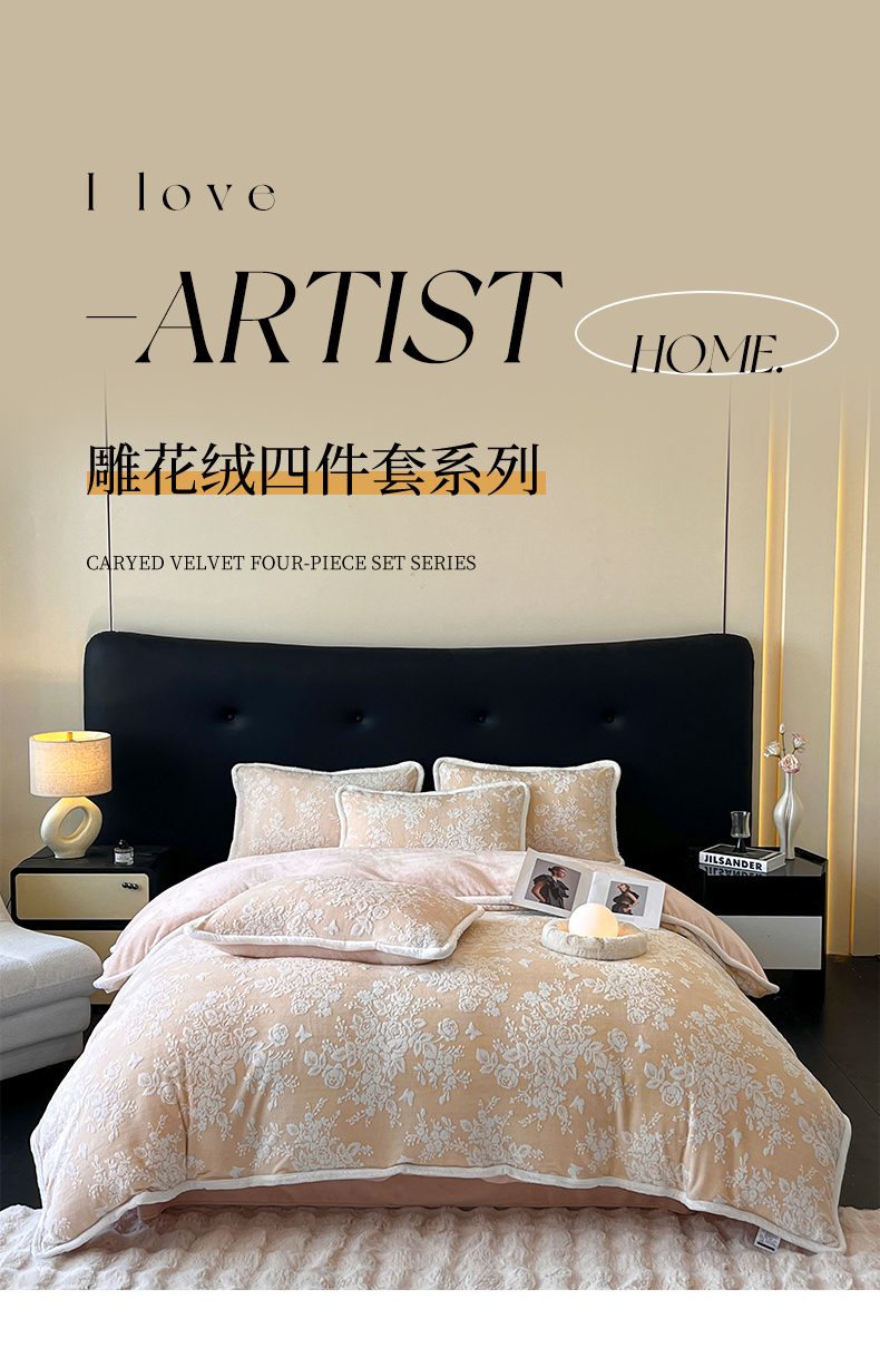(总)诺梵家纺 2025新款拼接雕花牛奶绒四件套,布朗棕,温妮莎-粉,温妮莎-黄,纤枝逸-红,纤枝逸-黄,邂逅-粉,邂逅-紫