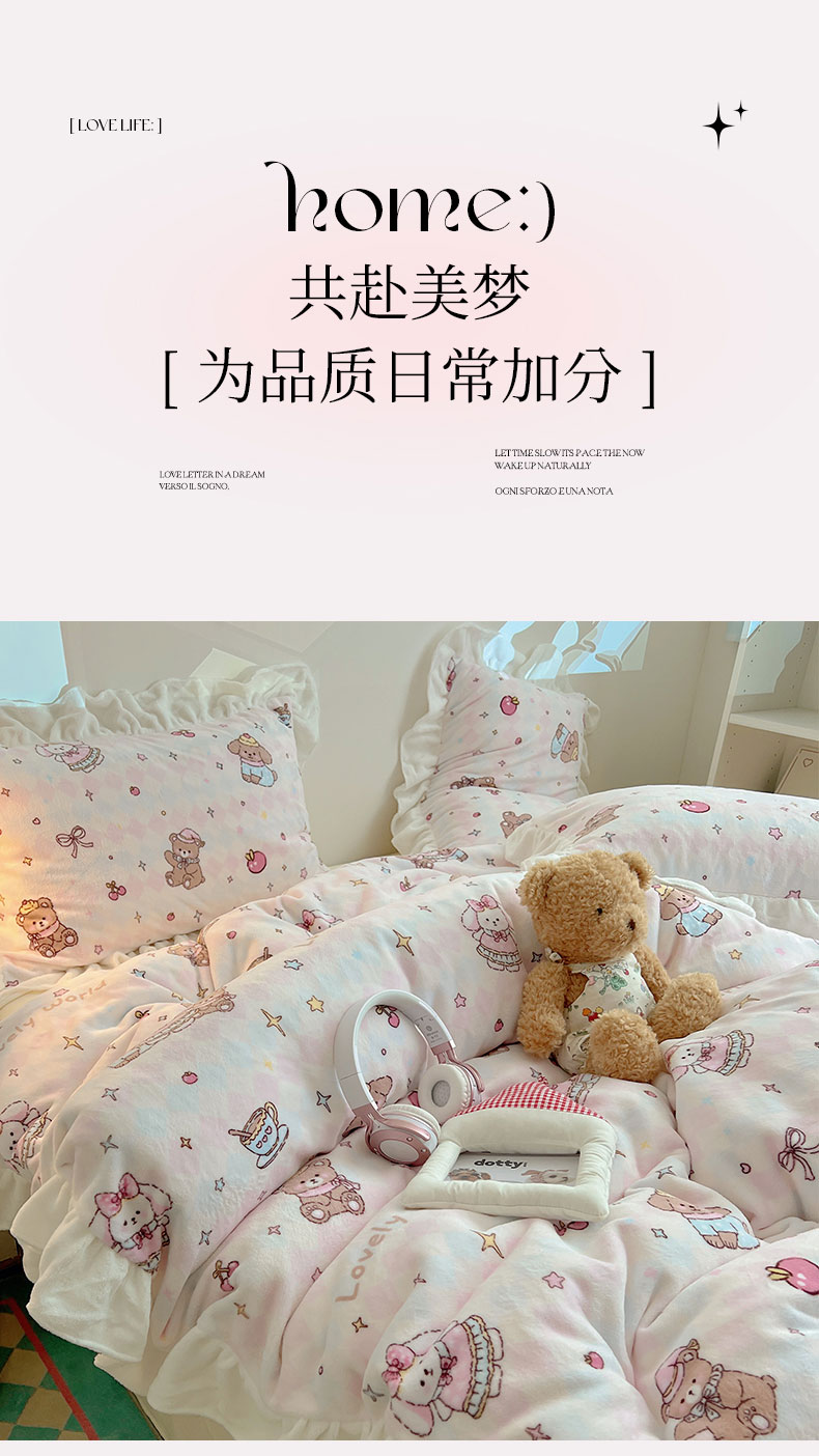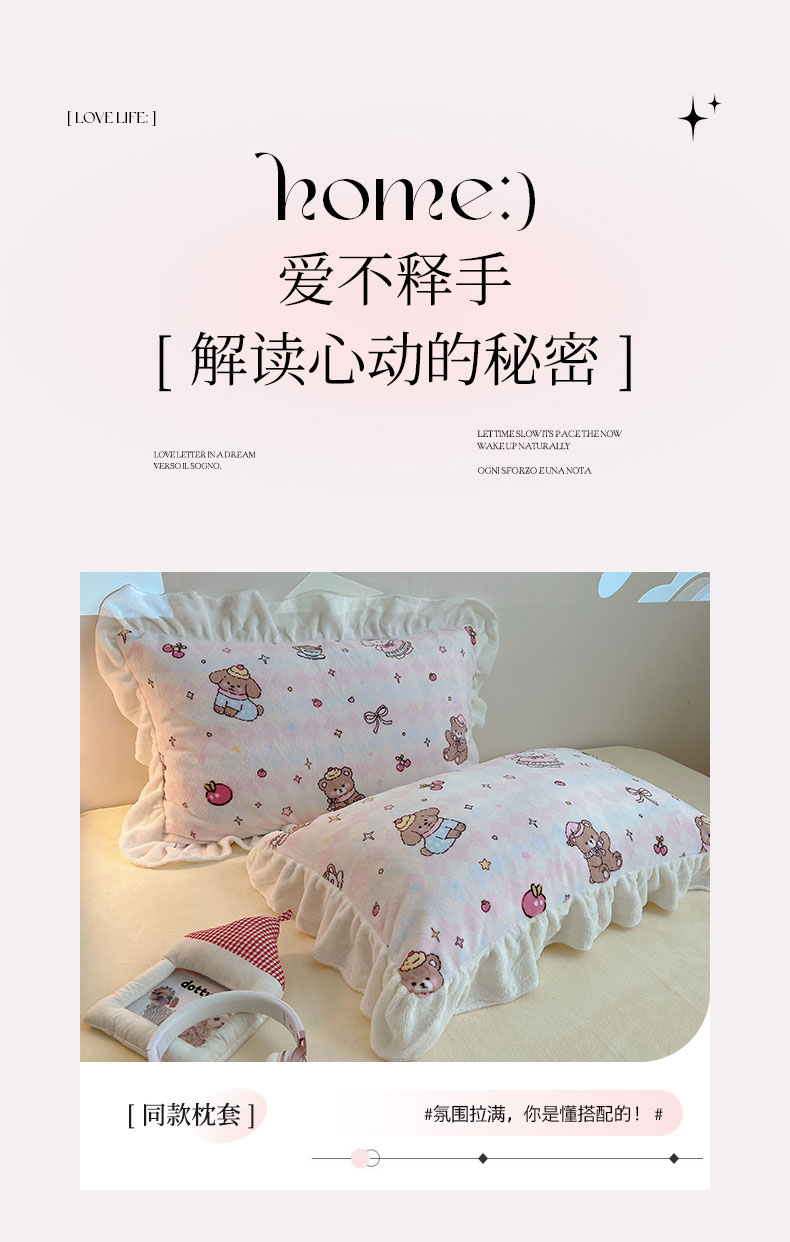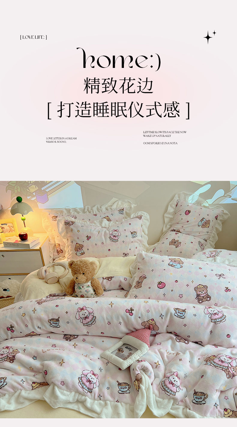 当前位置: 91家纺网 > 商品网购 > 床品套件 > 四件套 > 牛奶绒四件套 > 六巷胡同 2025新款韩式博主风花边款INS卡通A类牛奶绒四件套(第一系) 花边星星宠物集