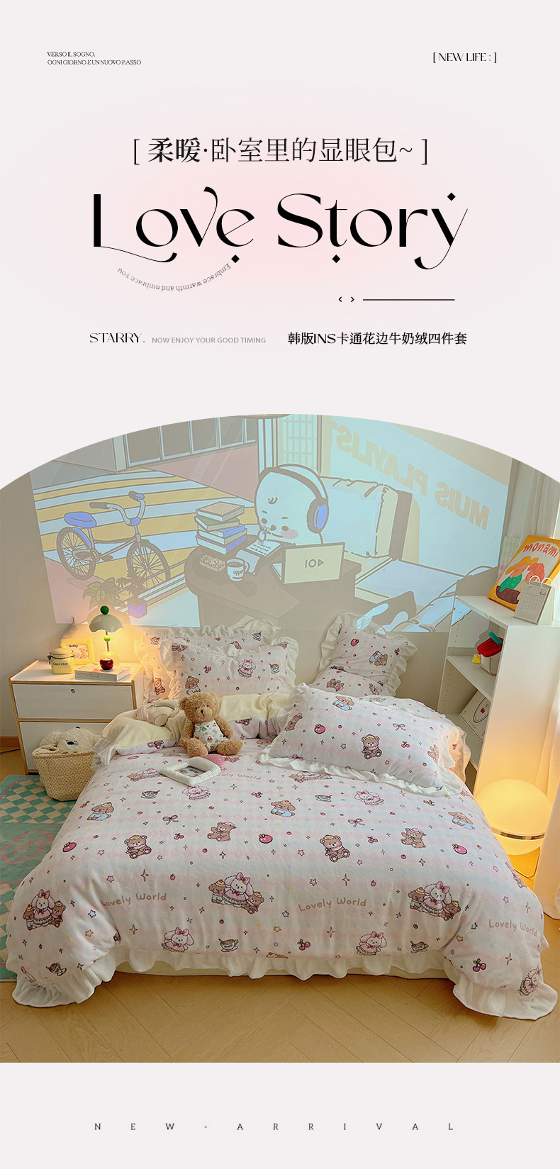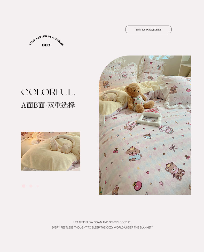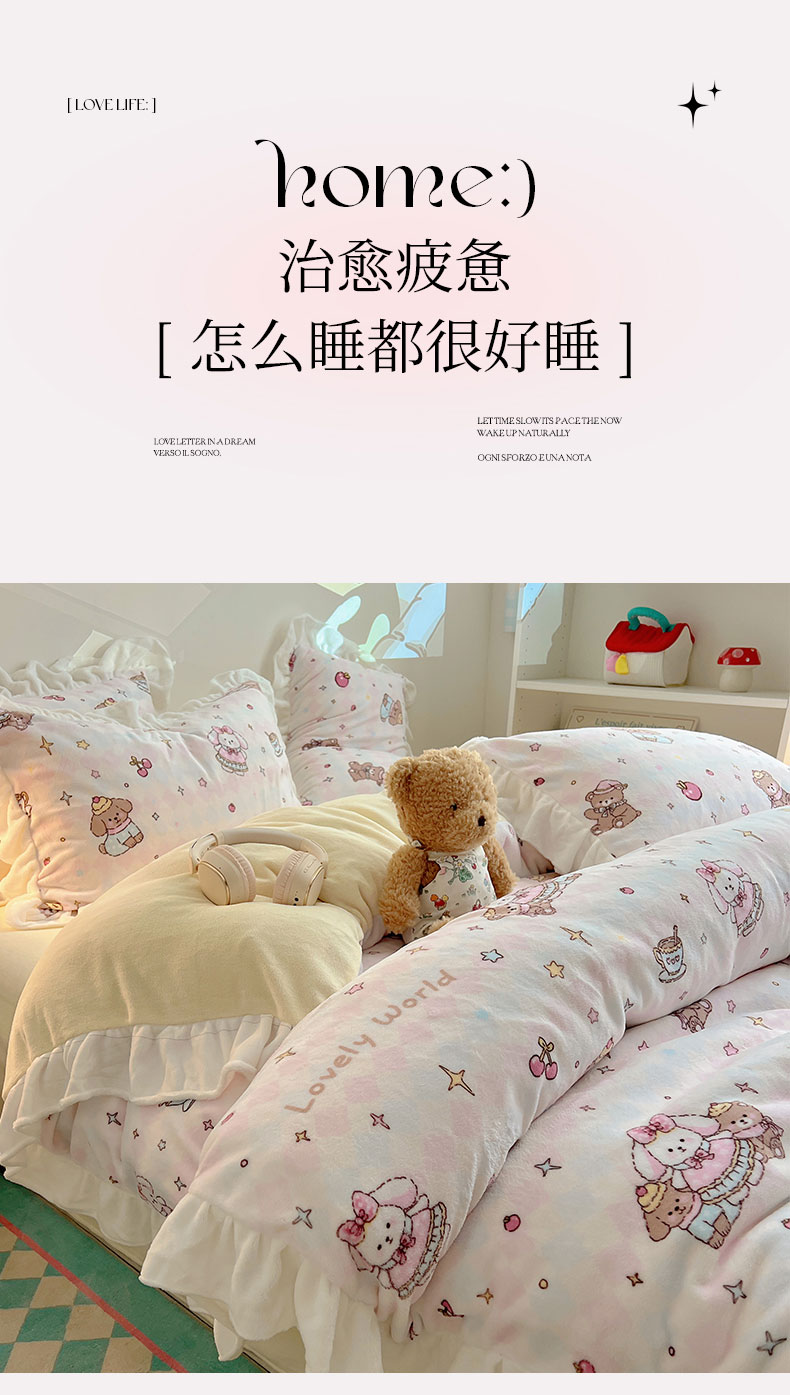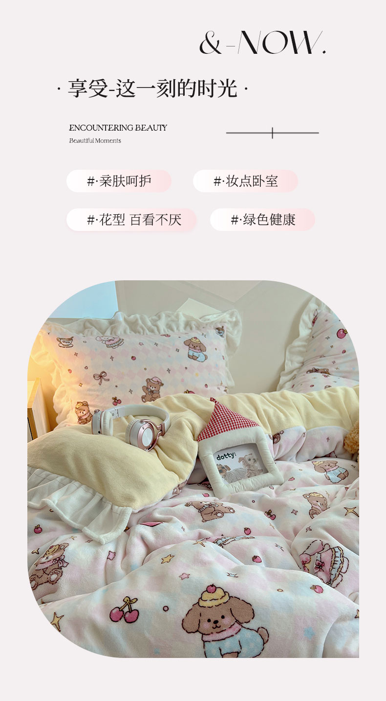 当前位置: 91家纺网 > 商品网购 > 床品套件 > 四件套 > 牛奶绒四件套 > 六巷胡同 2025新款韩式博主风花边款INS卡通A类牛奶绒四件套(第一系) 花边星星宠物集