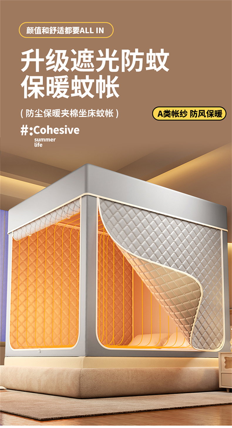 • 91家纺网 家纺一手货源 找家纺 佳梦家纺 2025新款防尘保暖夹棉坐床蚊帐-永夜系列 永夜-灰色