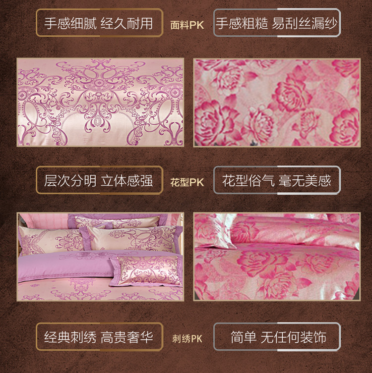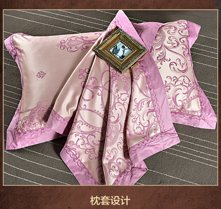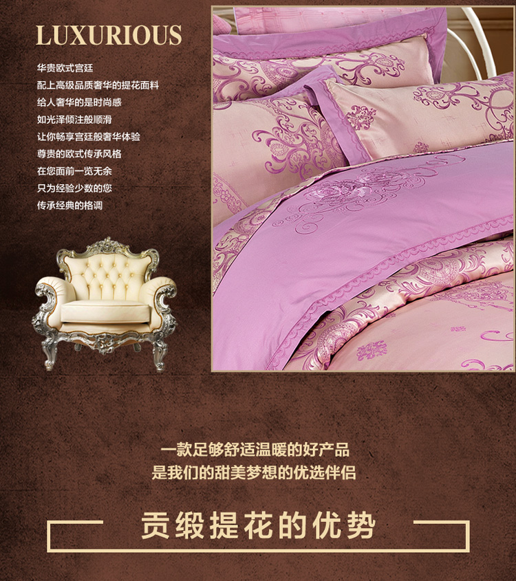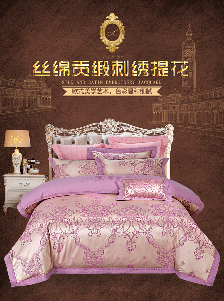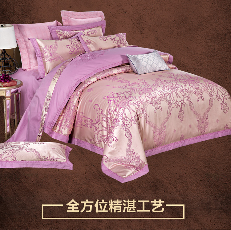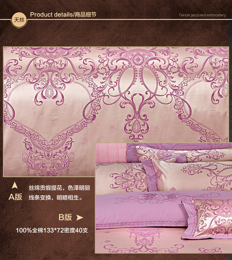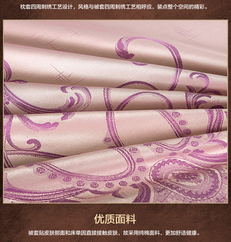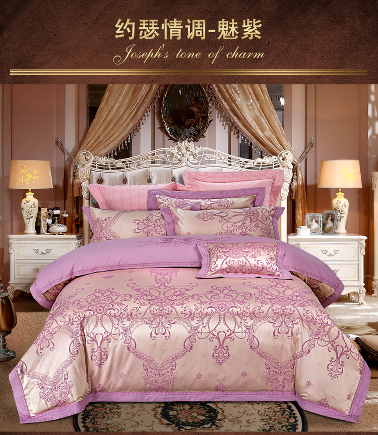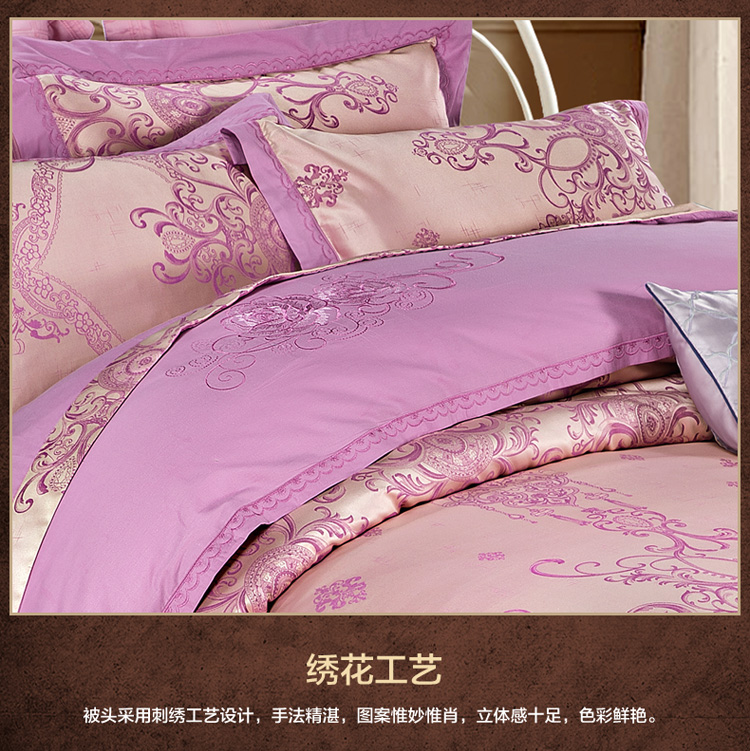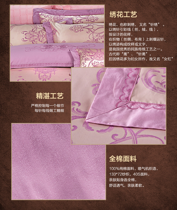 柔觉家纺 天丝刺绣贡缎提花全棉四件套,卡曼时尚-粉紫