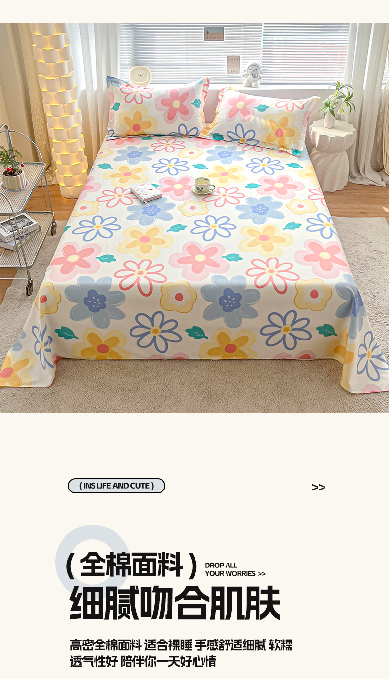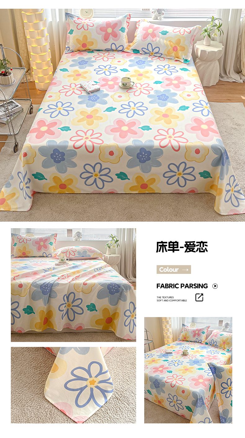 • 91家纺网 家纺一手货源 找家纺 涵宸家纺 2024新款全棉小清新印花单品套件--单床单 床单-爱恋