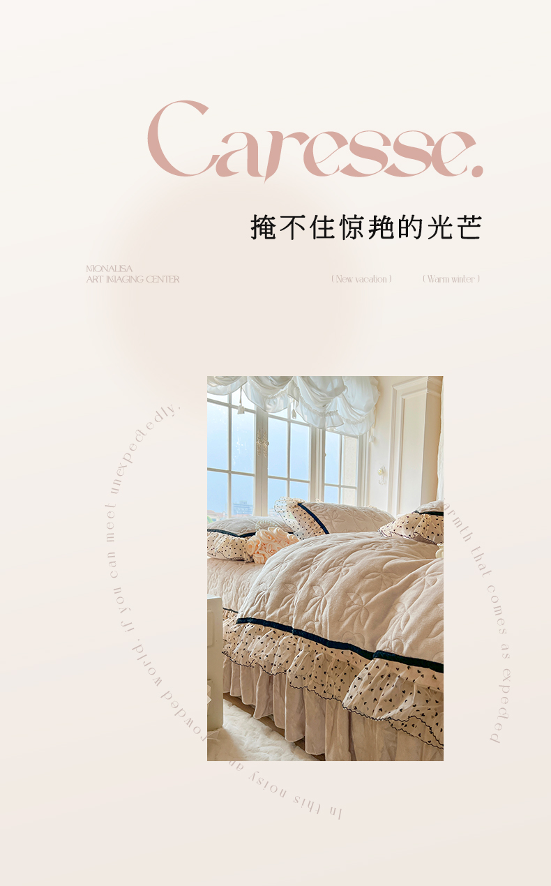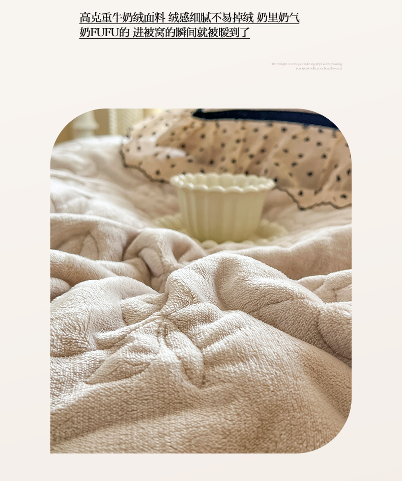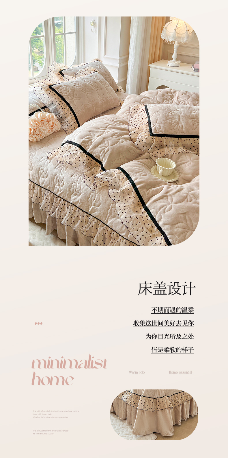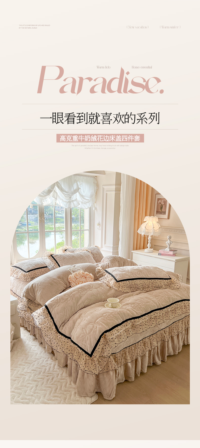 麒豆豆 2024新款高克重时尚花边牛奶绒四件套床盖款-诺蔓 诺蔓-米咖