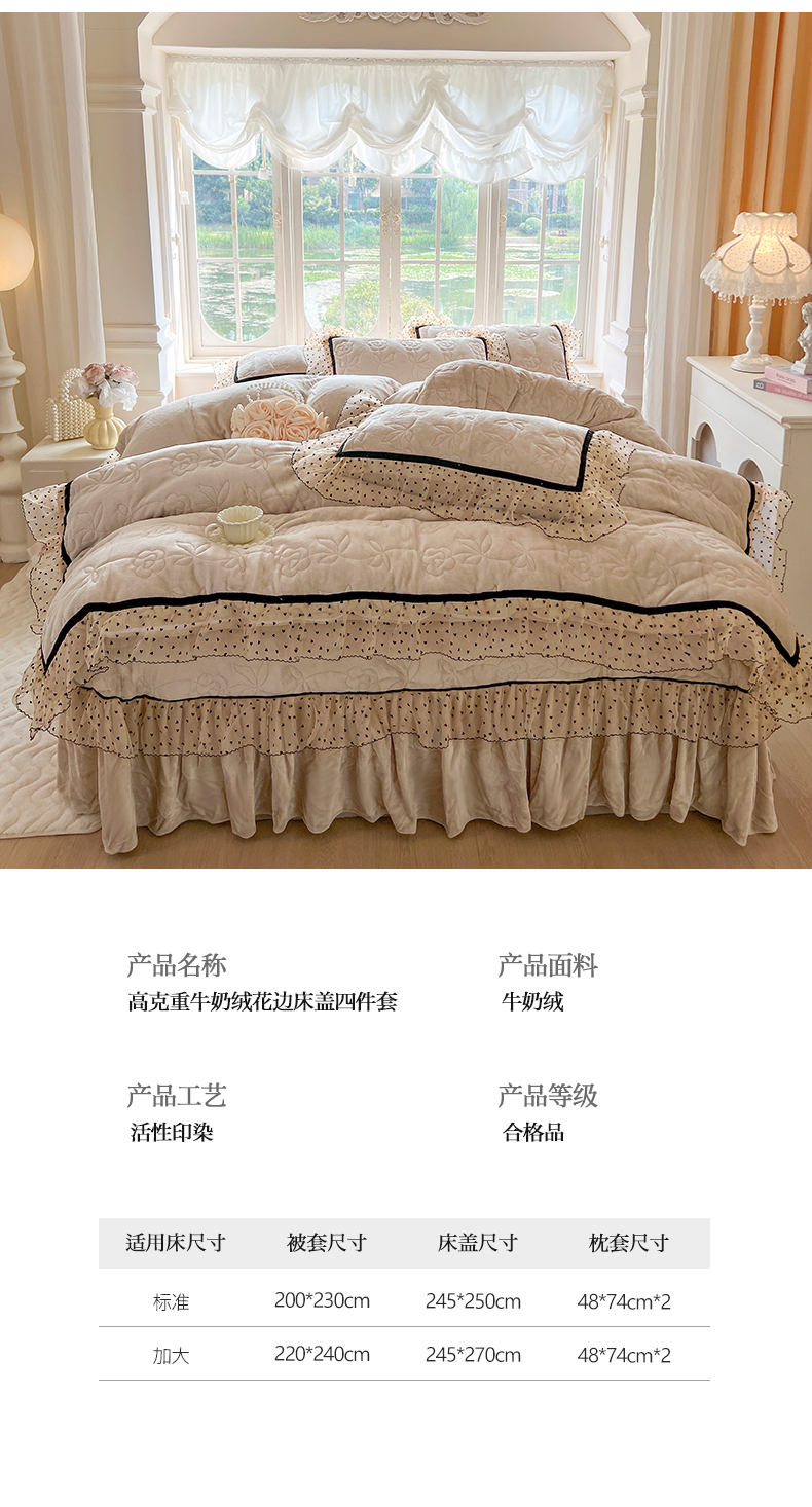 商品名称:麒豆豆 2024新款高克重时尚花边牛奶绒四件套床盖款-诺蔓 诺蔓-米咖