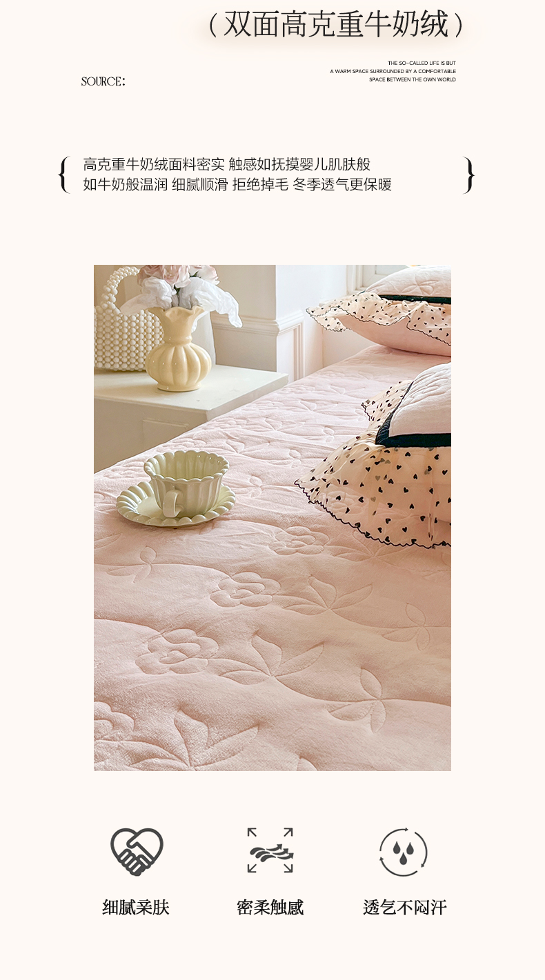 商品名称:麒豆豆 2024新款时尚花边牛奶绒床盖三件套-诺蔓 诺蔓-粉玉