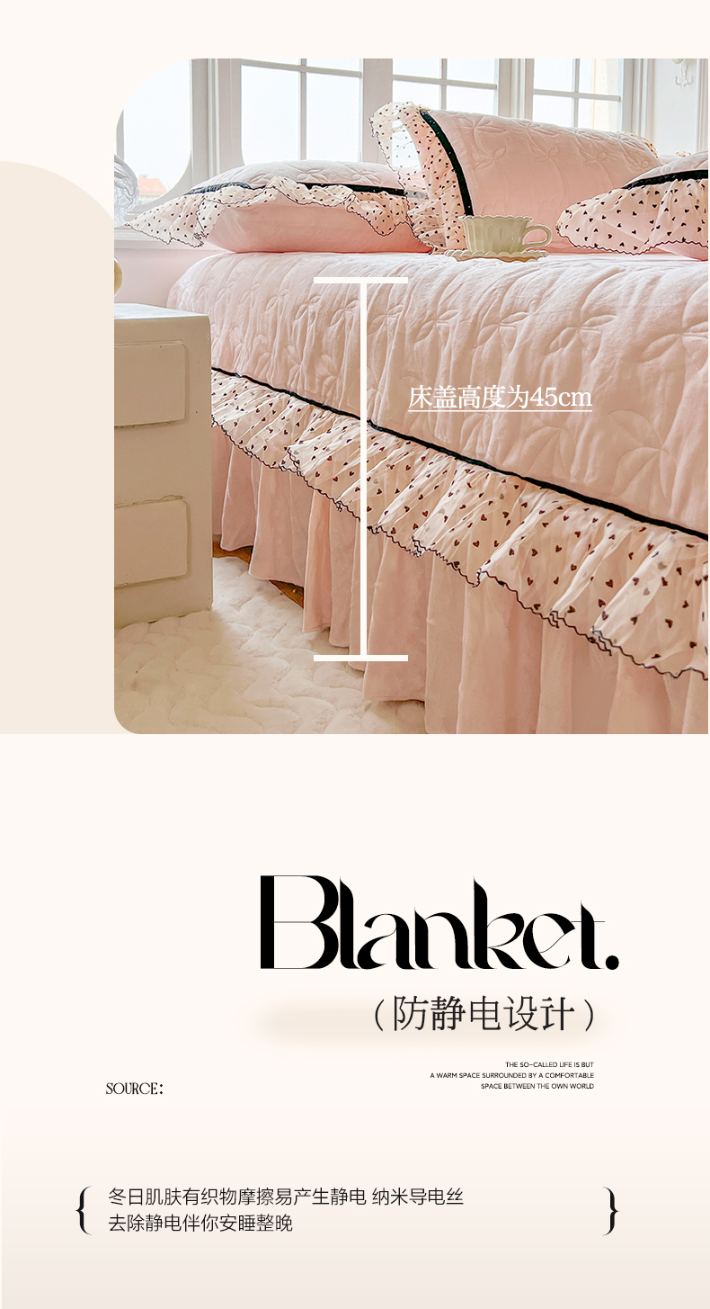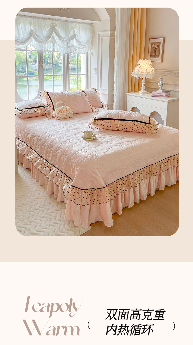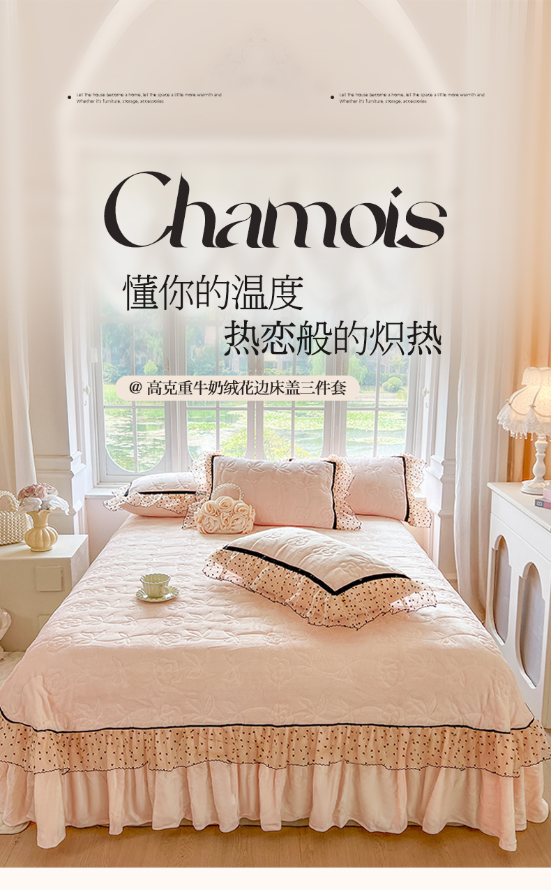 麒豆豆 2024新款时尚花边牛奶绒床盖三件套-诺蔓 诺蔓-粉玉