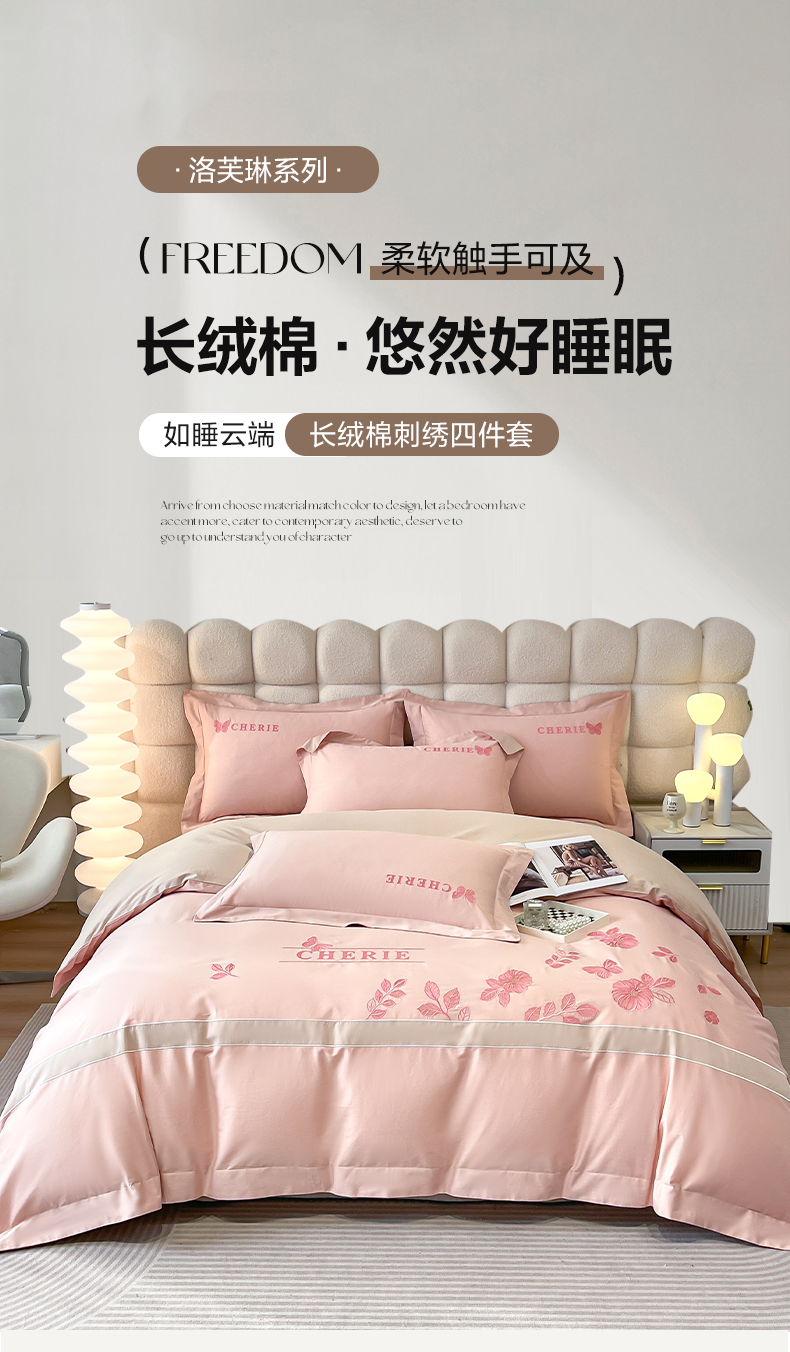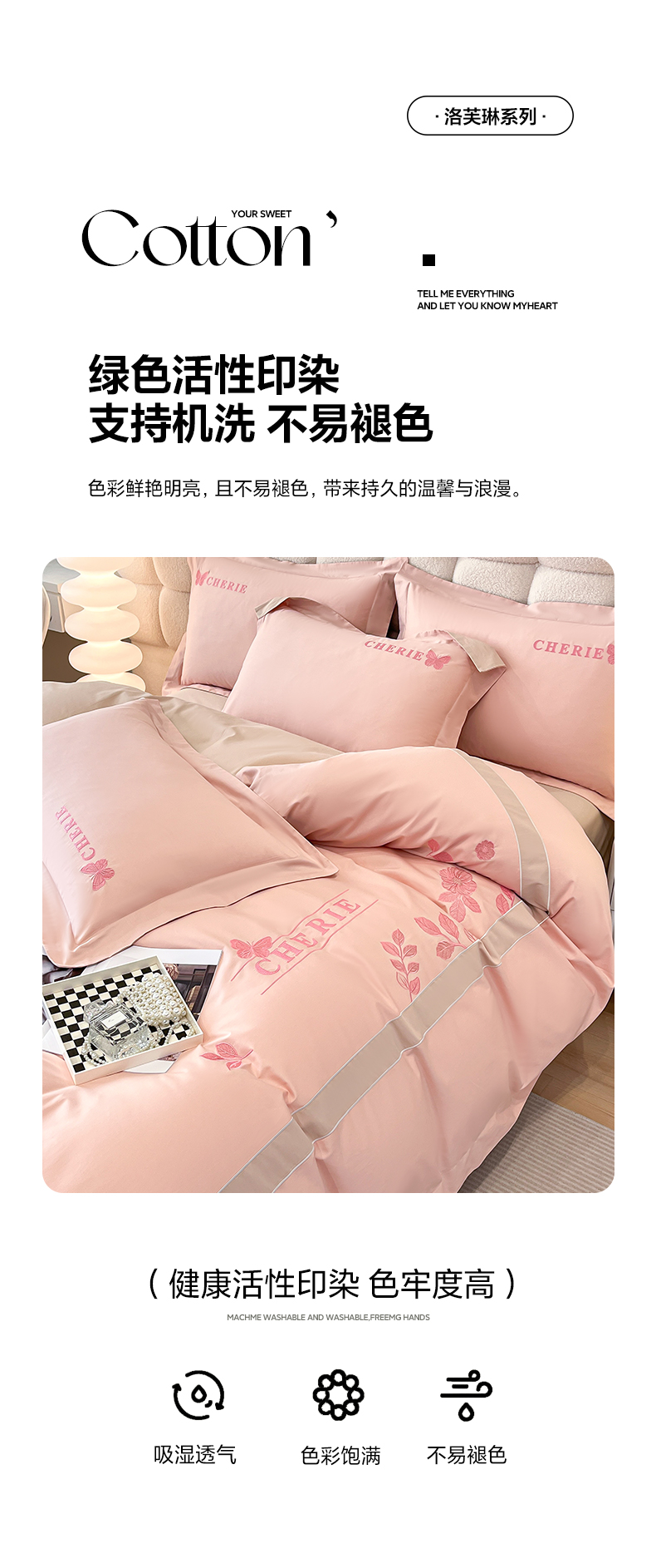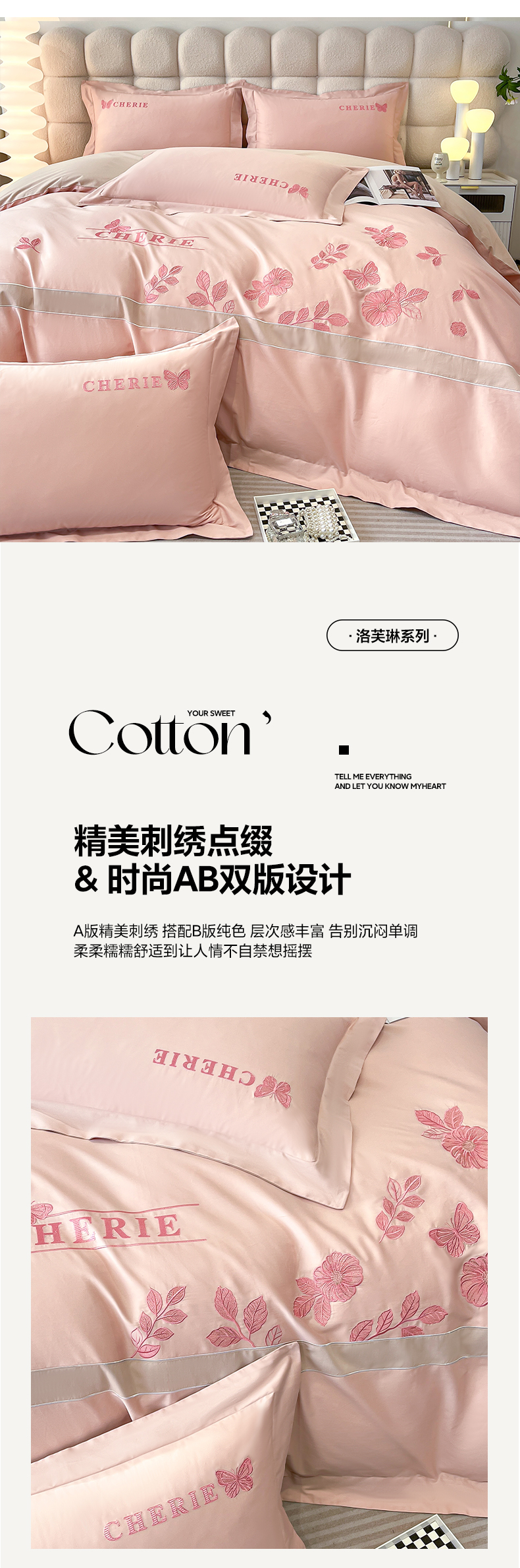 商品名称:桃园 2025新款洛芙琳系列纯棉全棉长绒棉刺绣绣花四件套(高端礼盒) 洛芙琳轻奢粉