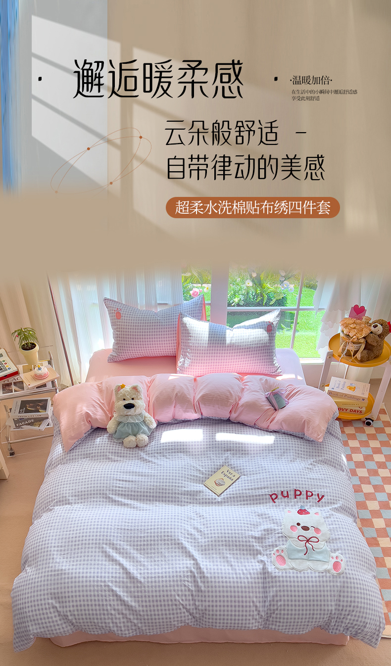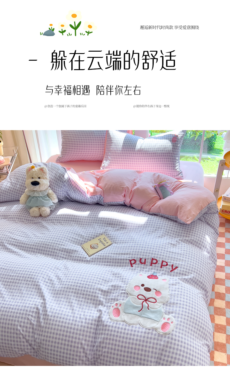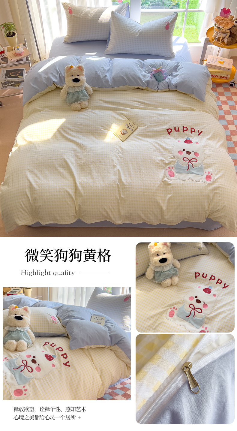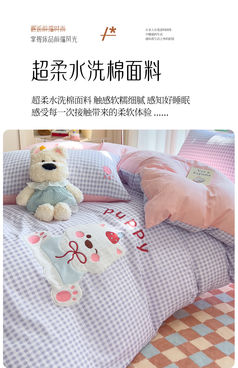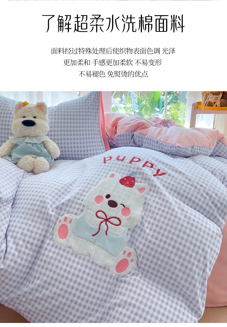 商品名称:(总)N先生+V 13814689556 发大图/买家秀 2025新款超柔水洗棉贴布绣四件套-微笑狗狗系列
