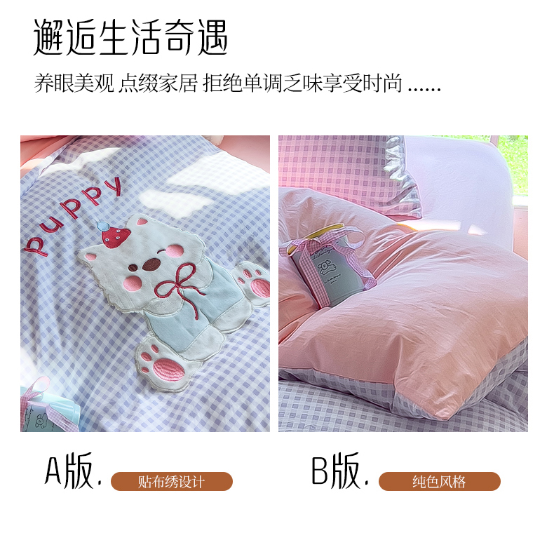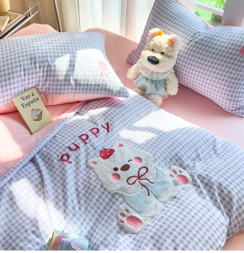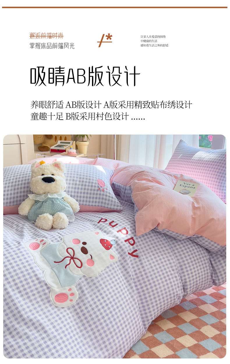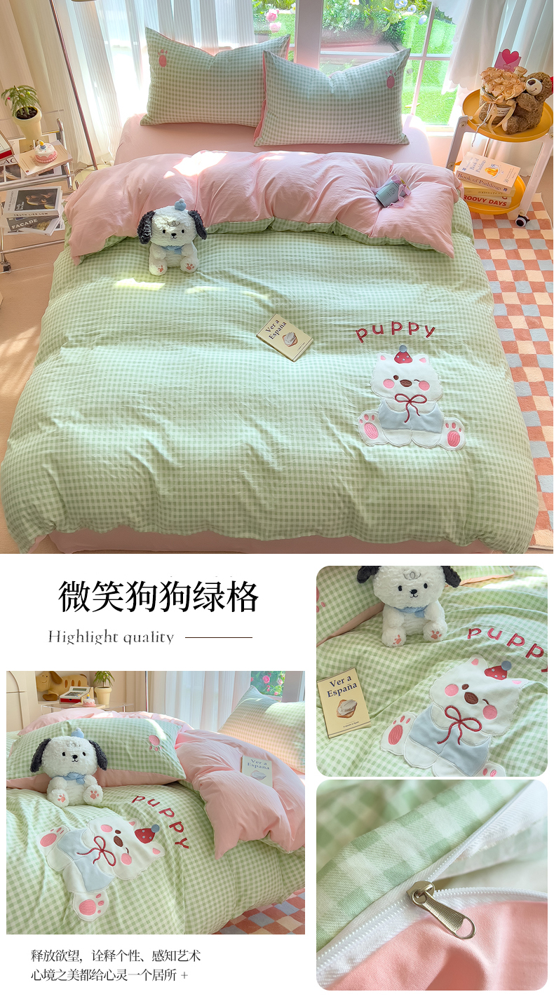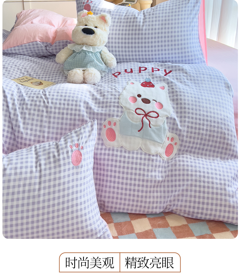 商品名称:(总)N先生+V 13814689556 发大图/买家秀 2025新款超柔水洗棉贴布绣四件套-微笑狗狗系列