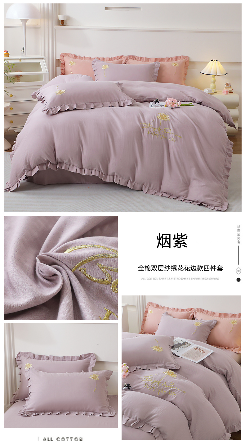 商品名称:一比一家纺 2025新款全棉双层纱花边刺绣款四件套 烟紫