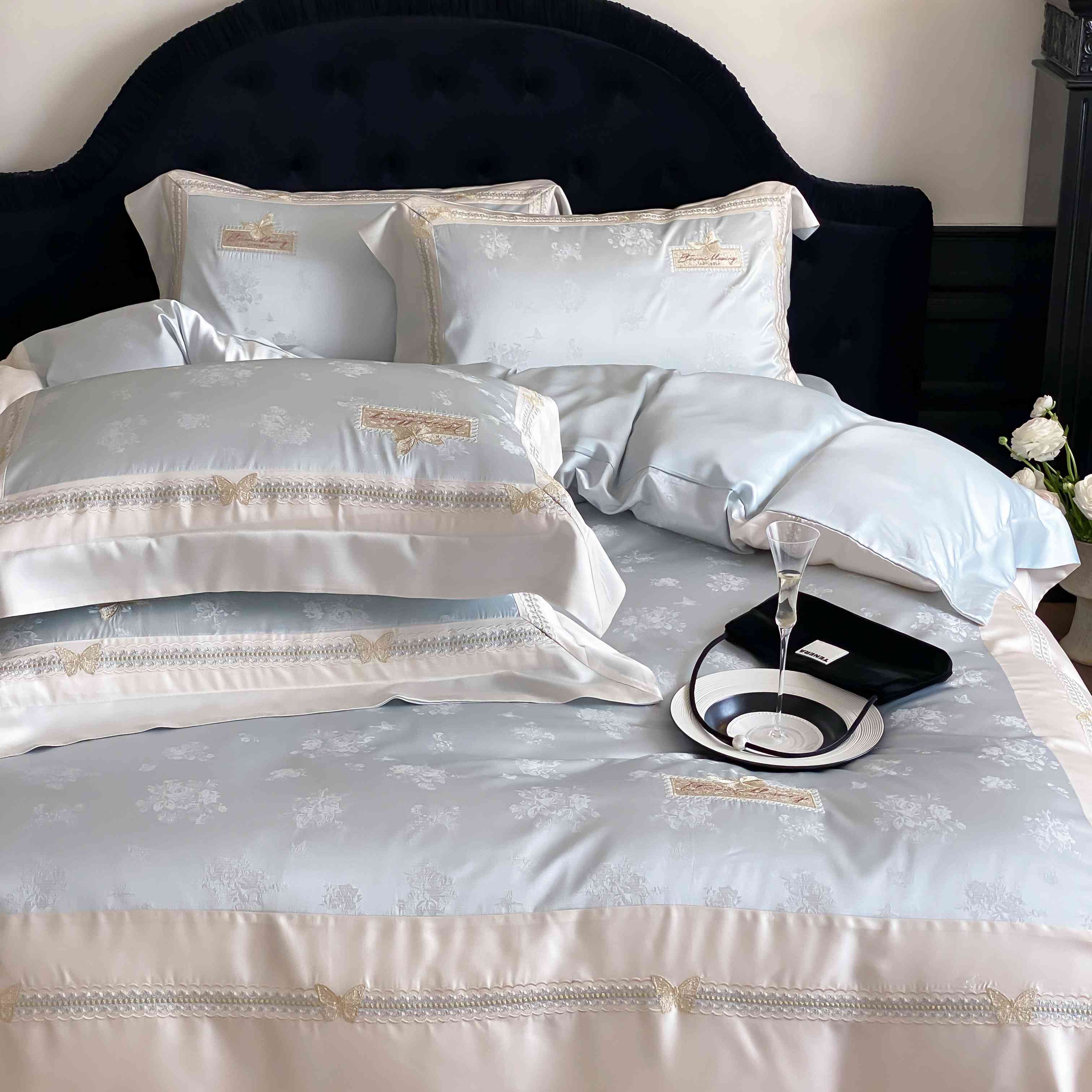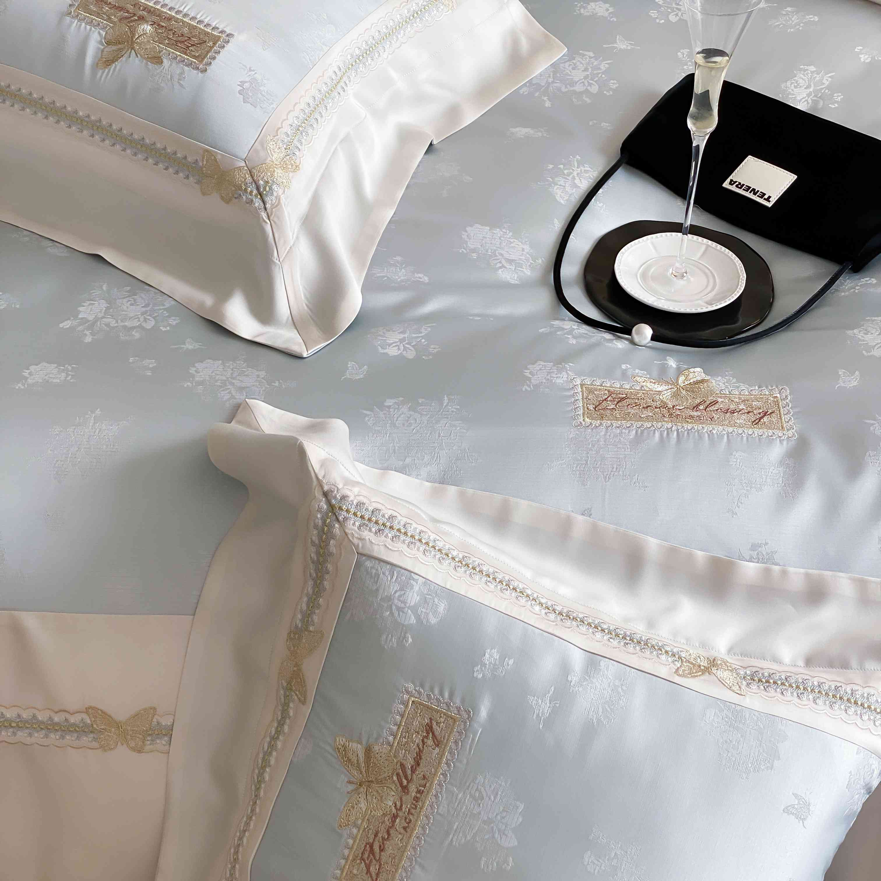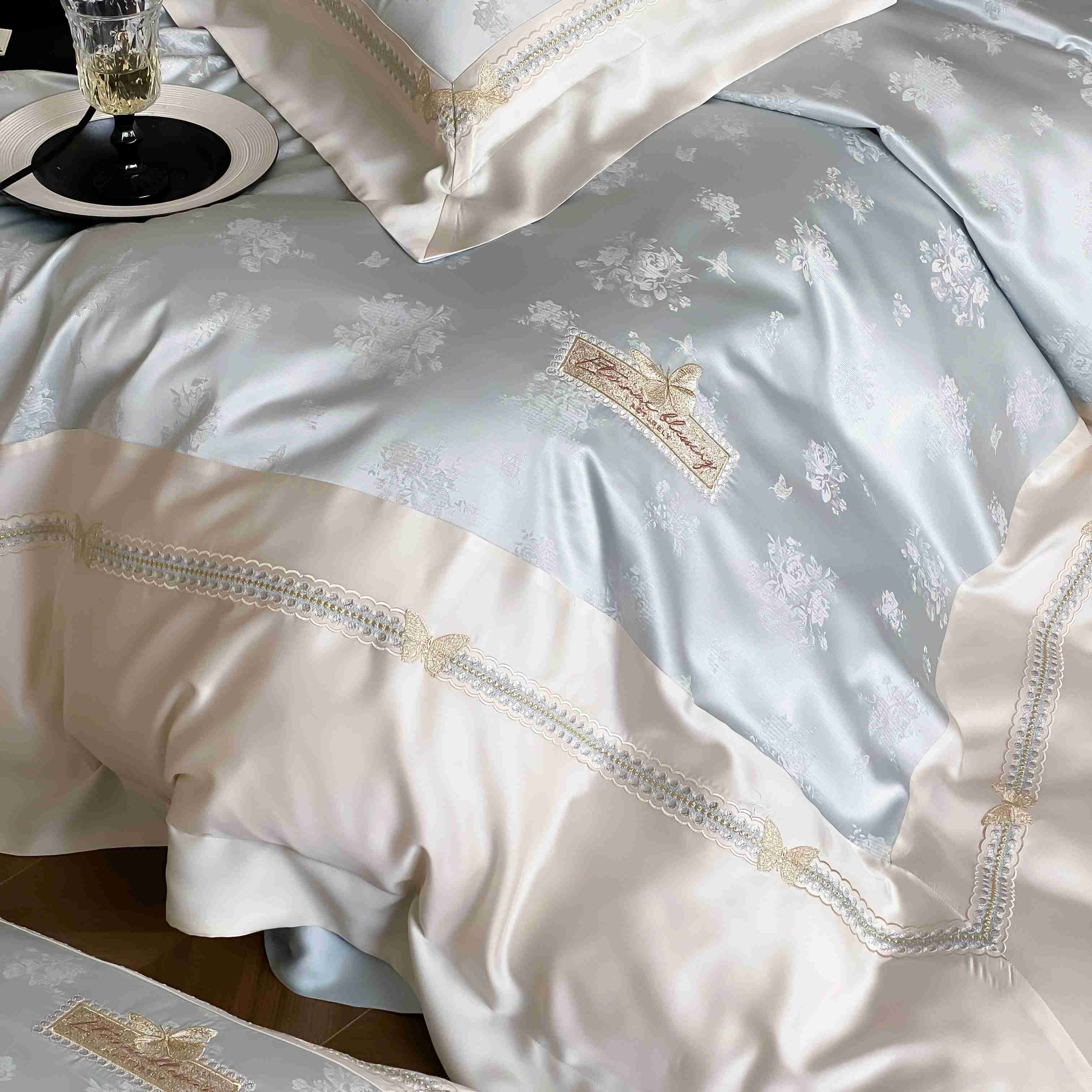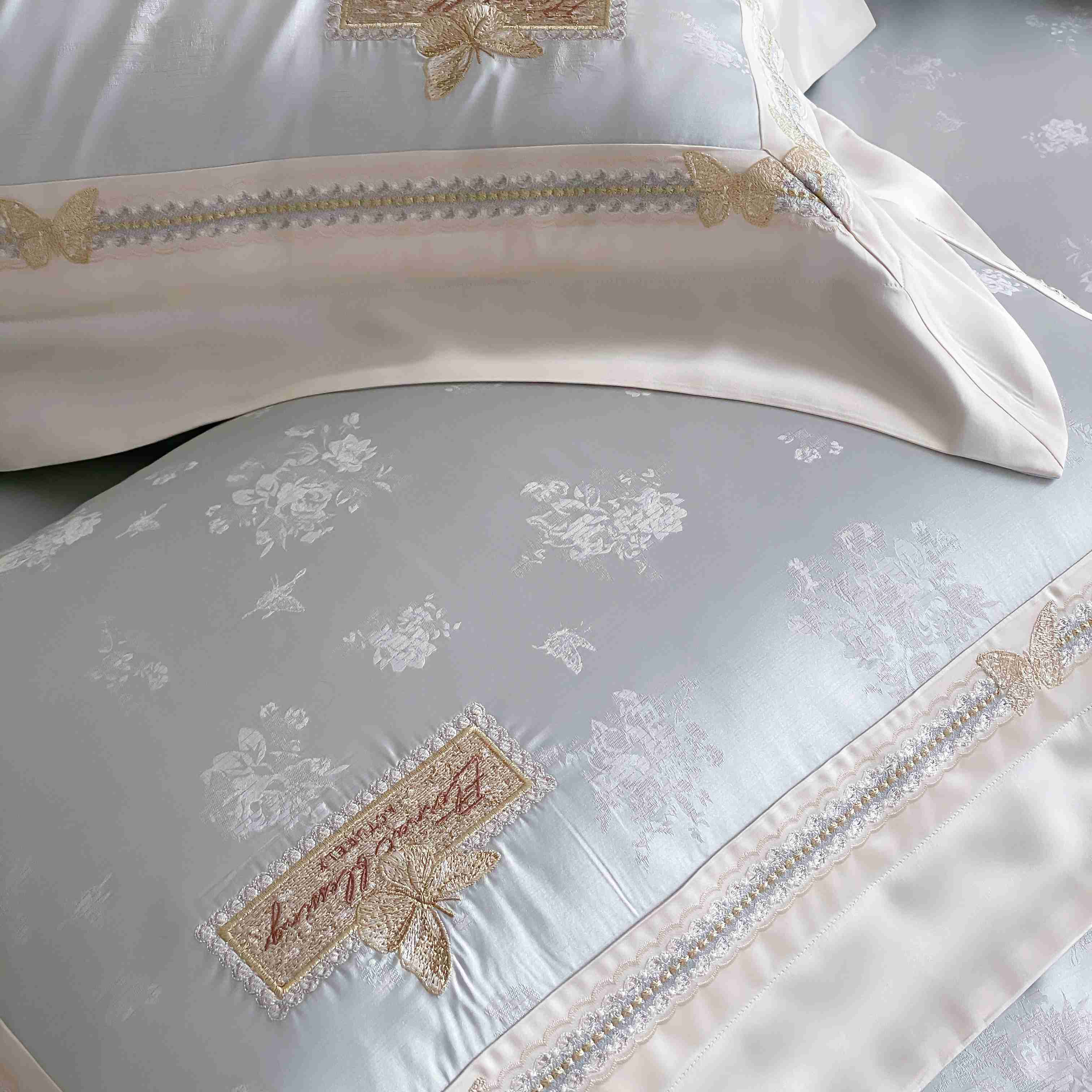 商品名称:太古汇家居 2025新款兰精天丝高精密提花-绣花“花间蝶影”系列 花间蝶影-蓝色