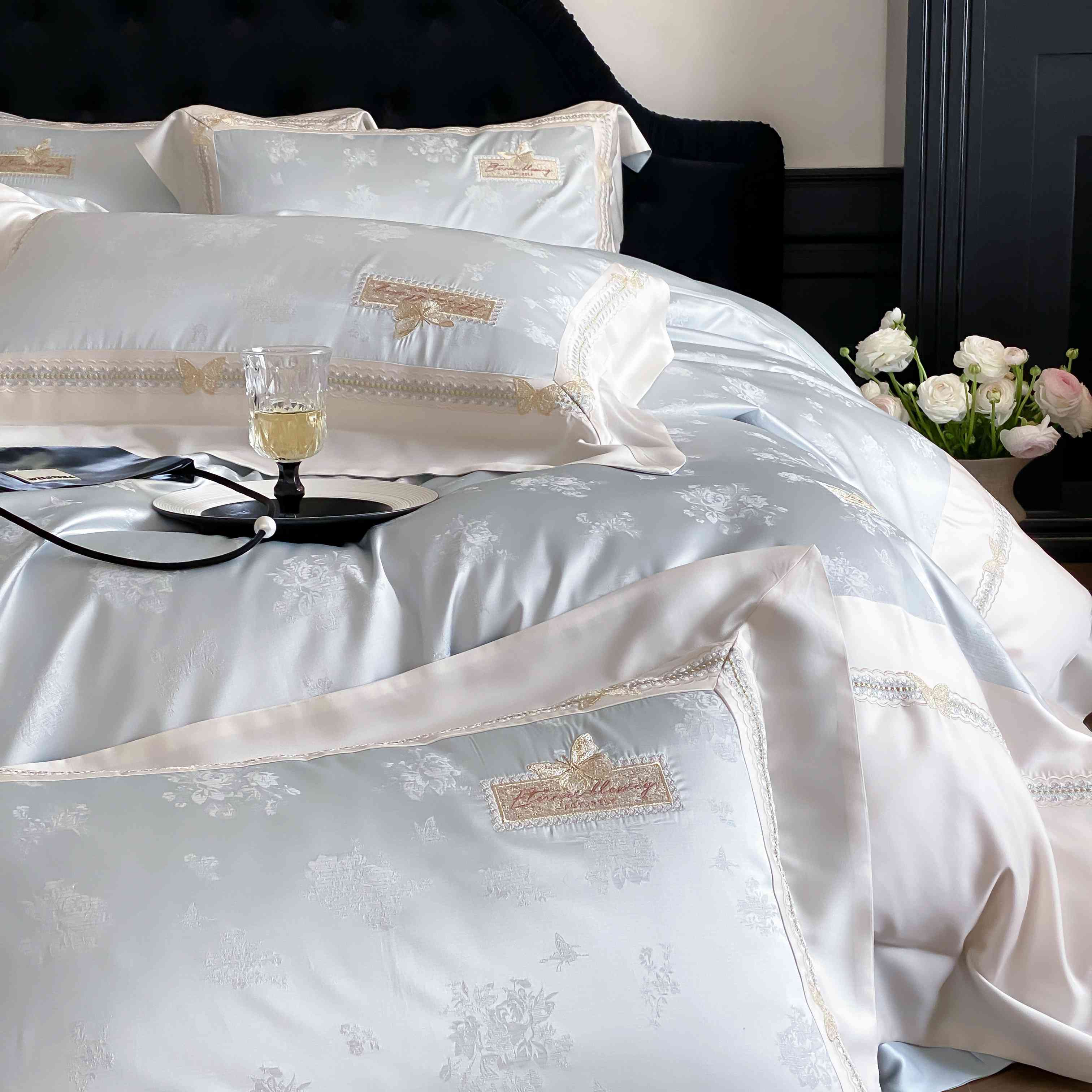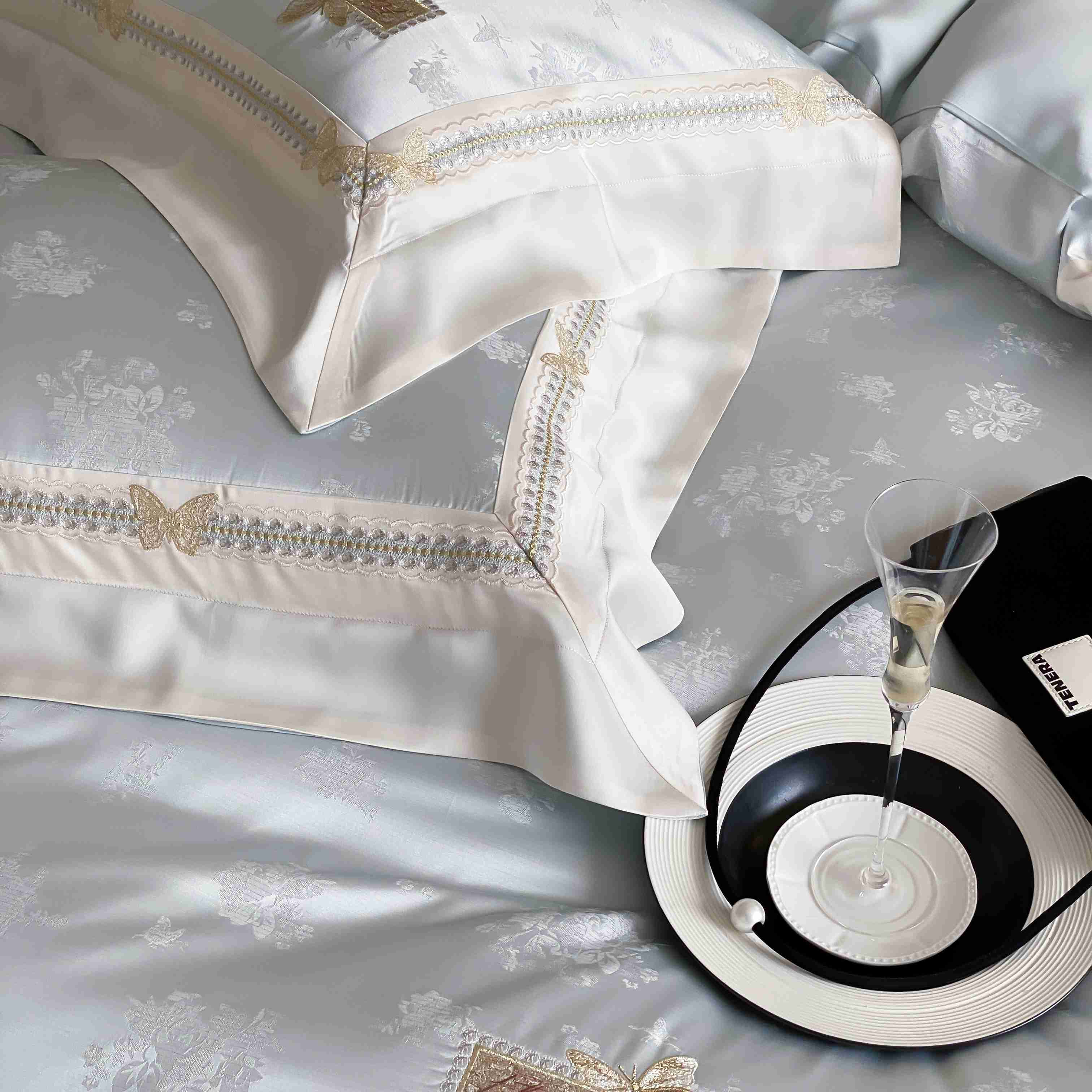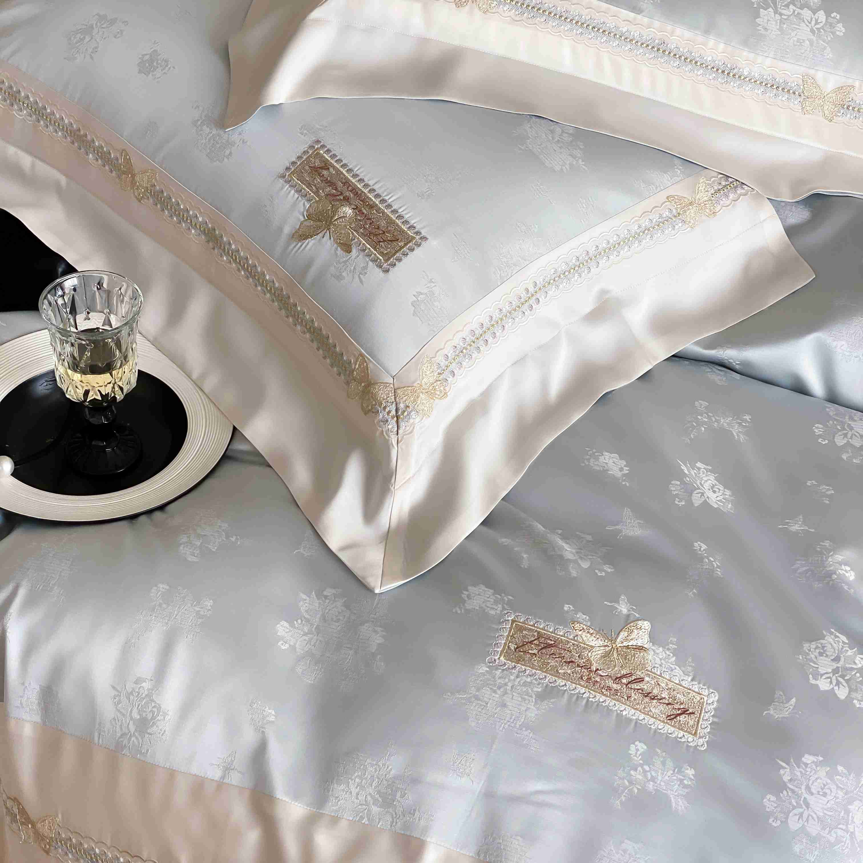 商品名称:太古汇家居 2025新款兰精天丝高精密提花-绣花“花间蝶影”系列 花间蝶影-蓝色