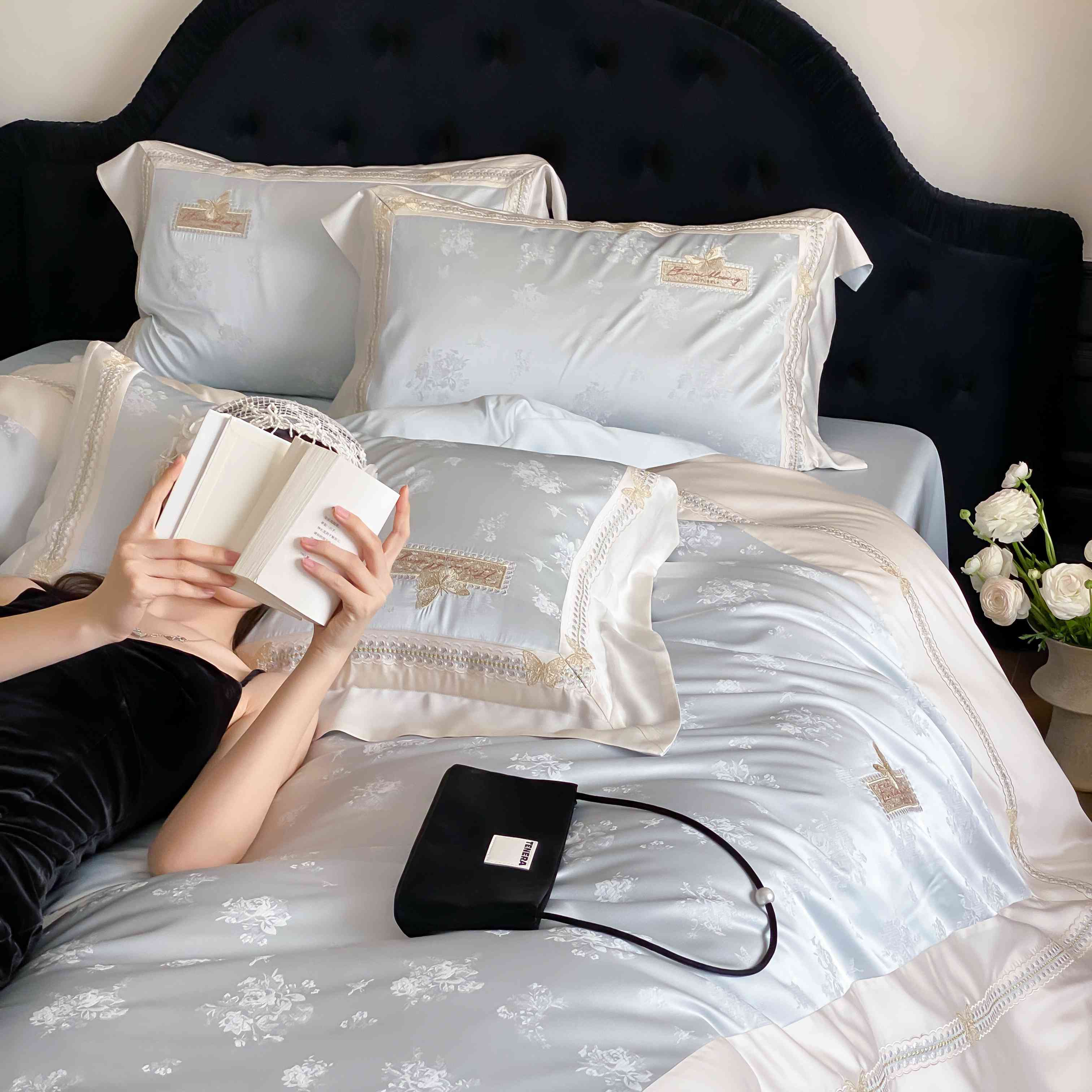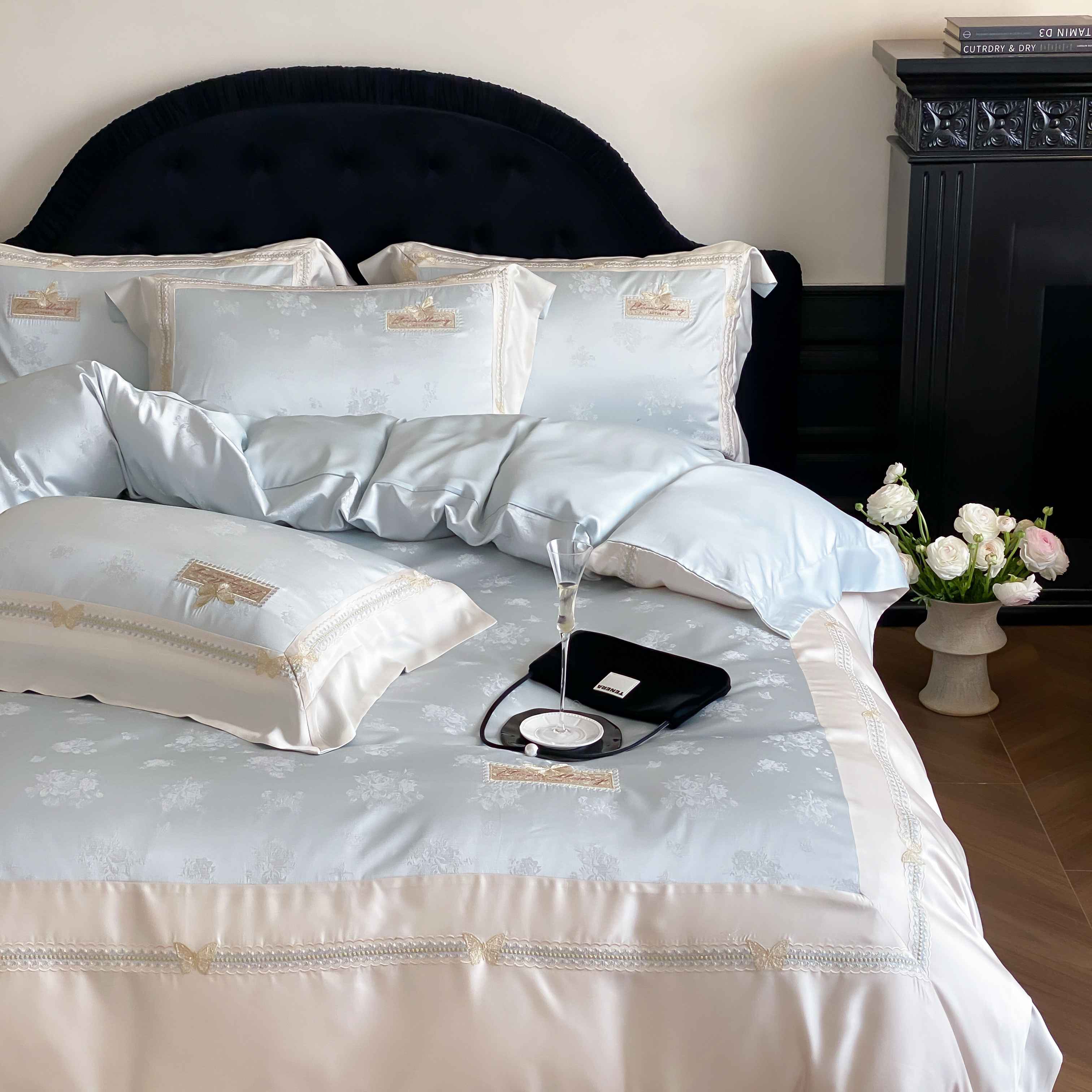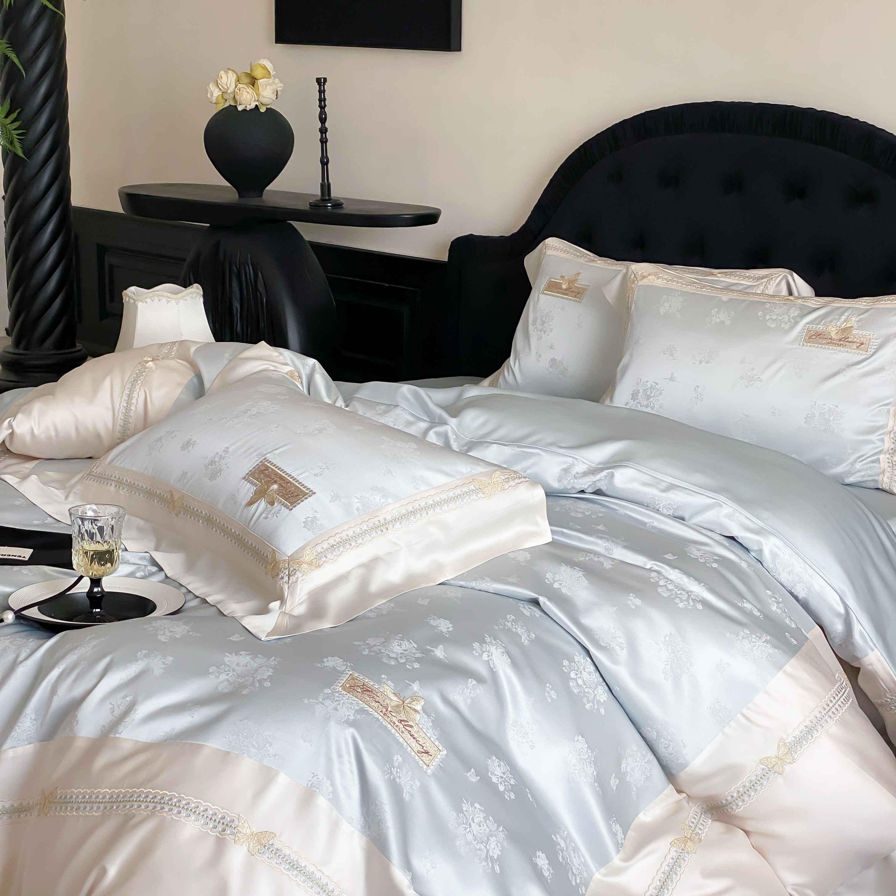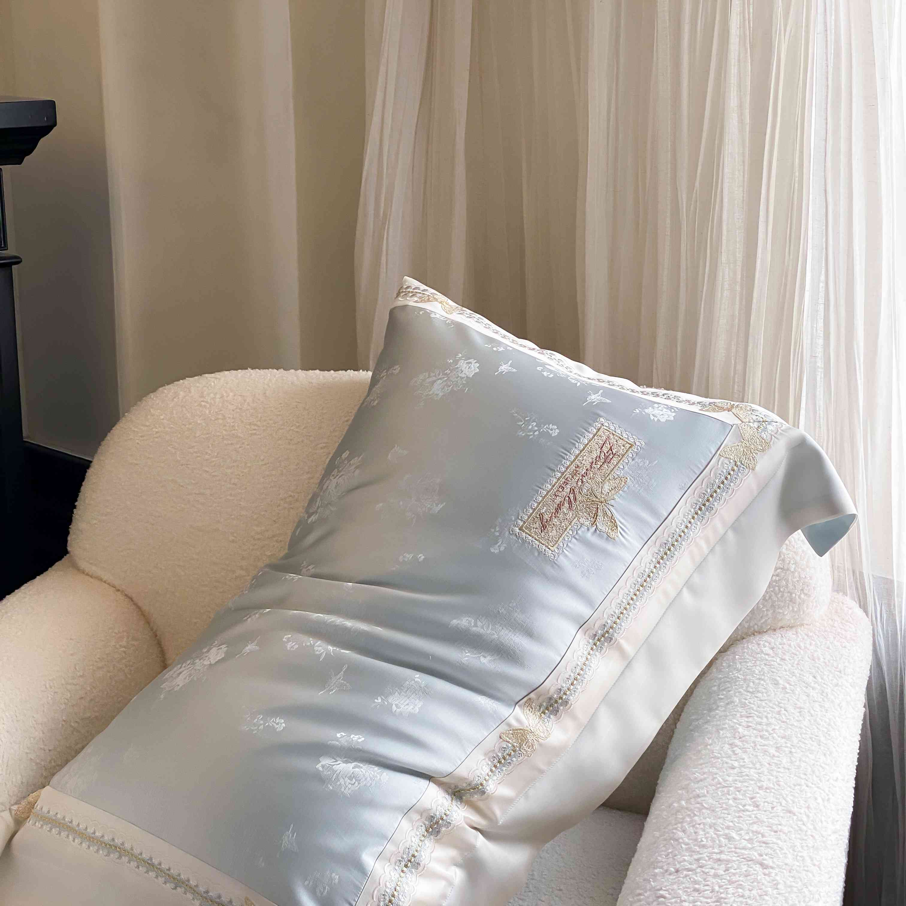 商品名称:太古汇家居 2025新款兰精天丝高精密提花-绣花“花间蝶影”系列 花间蝶影-蓝色