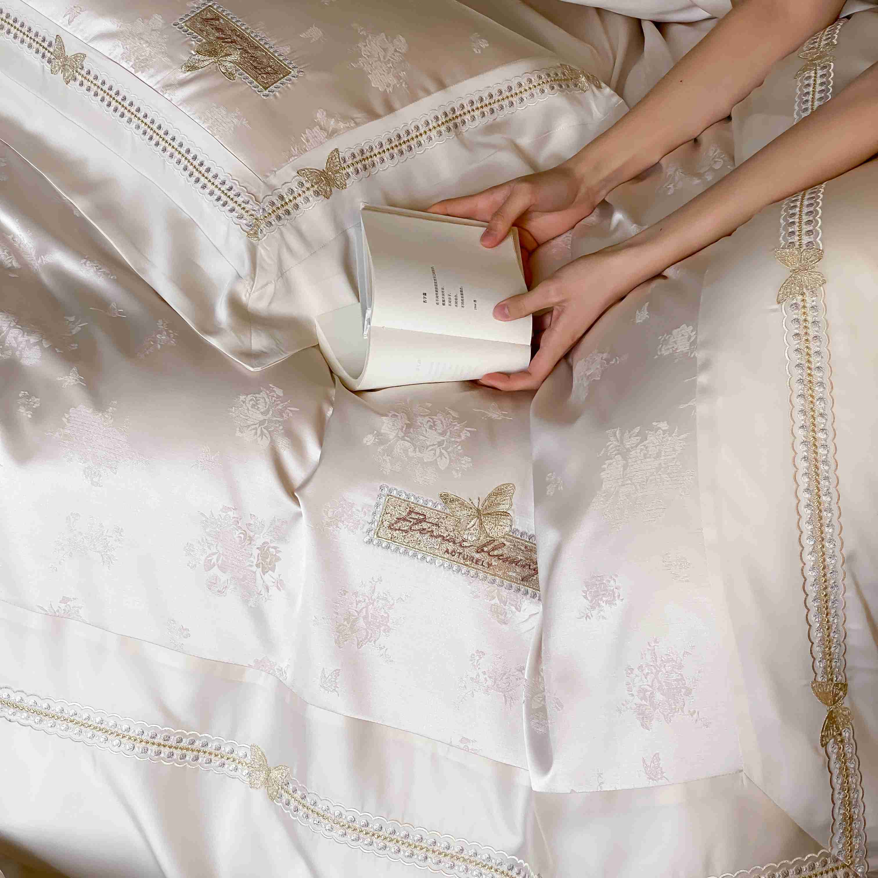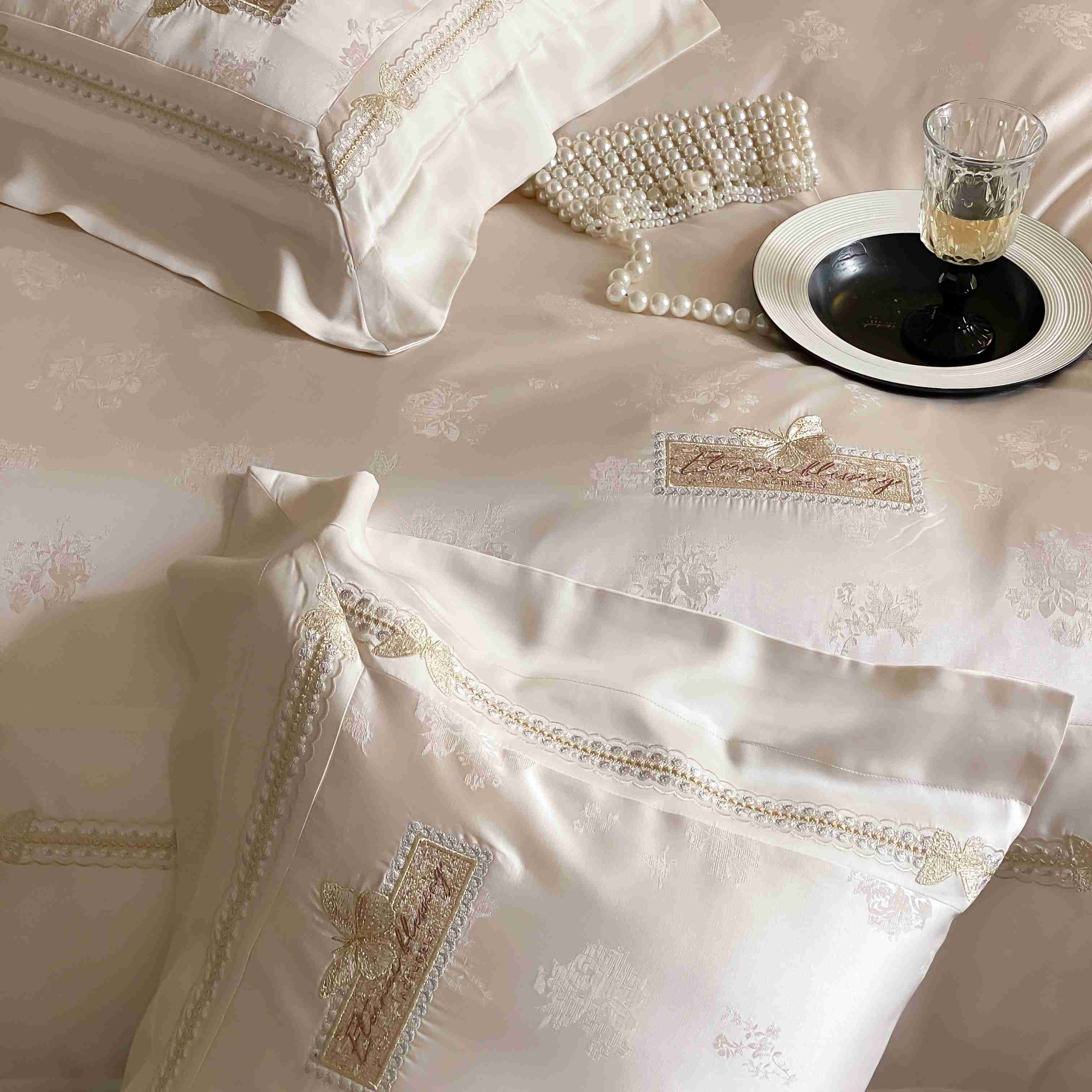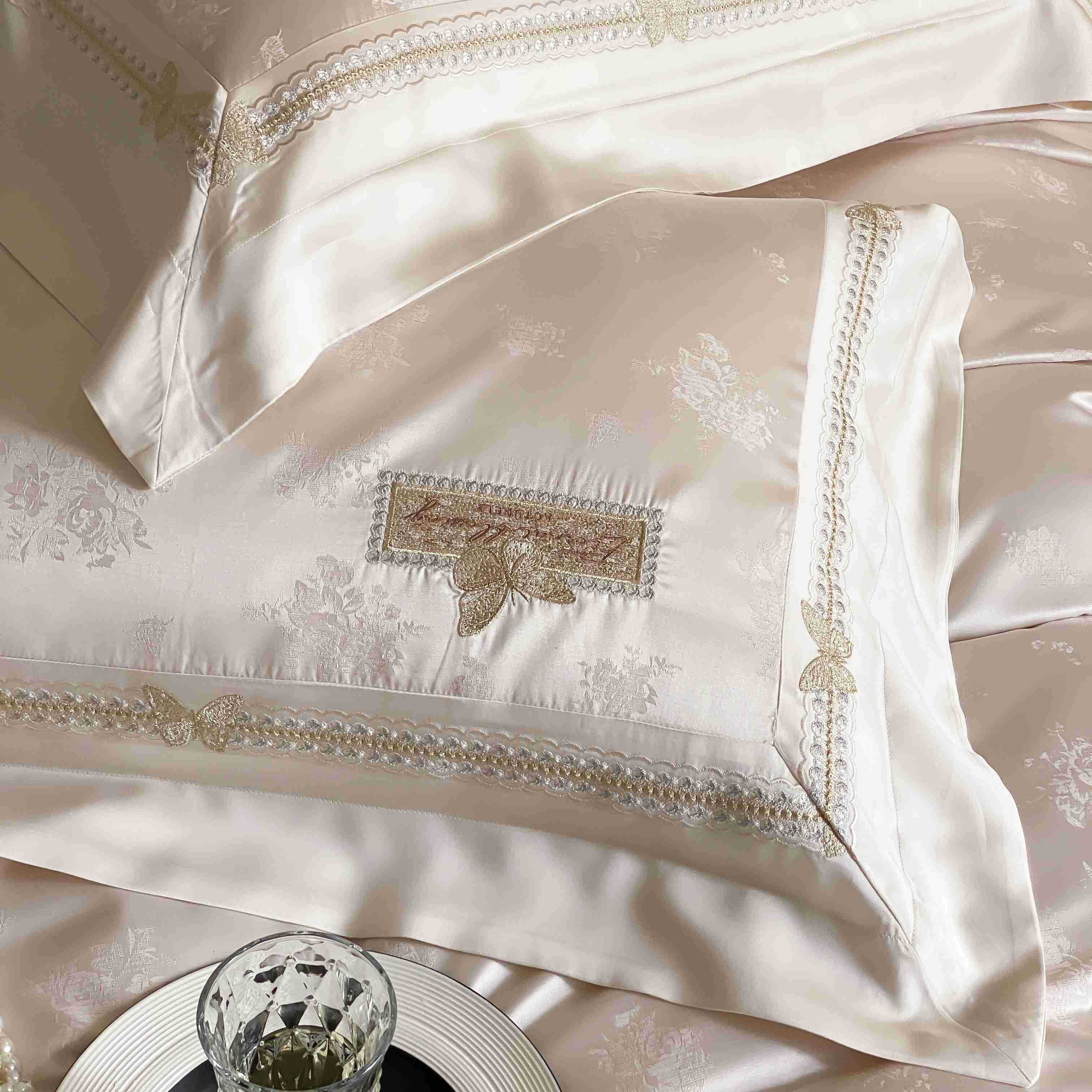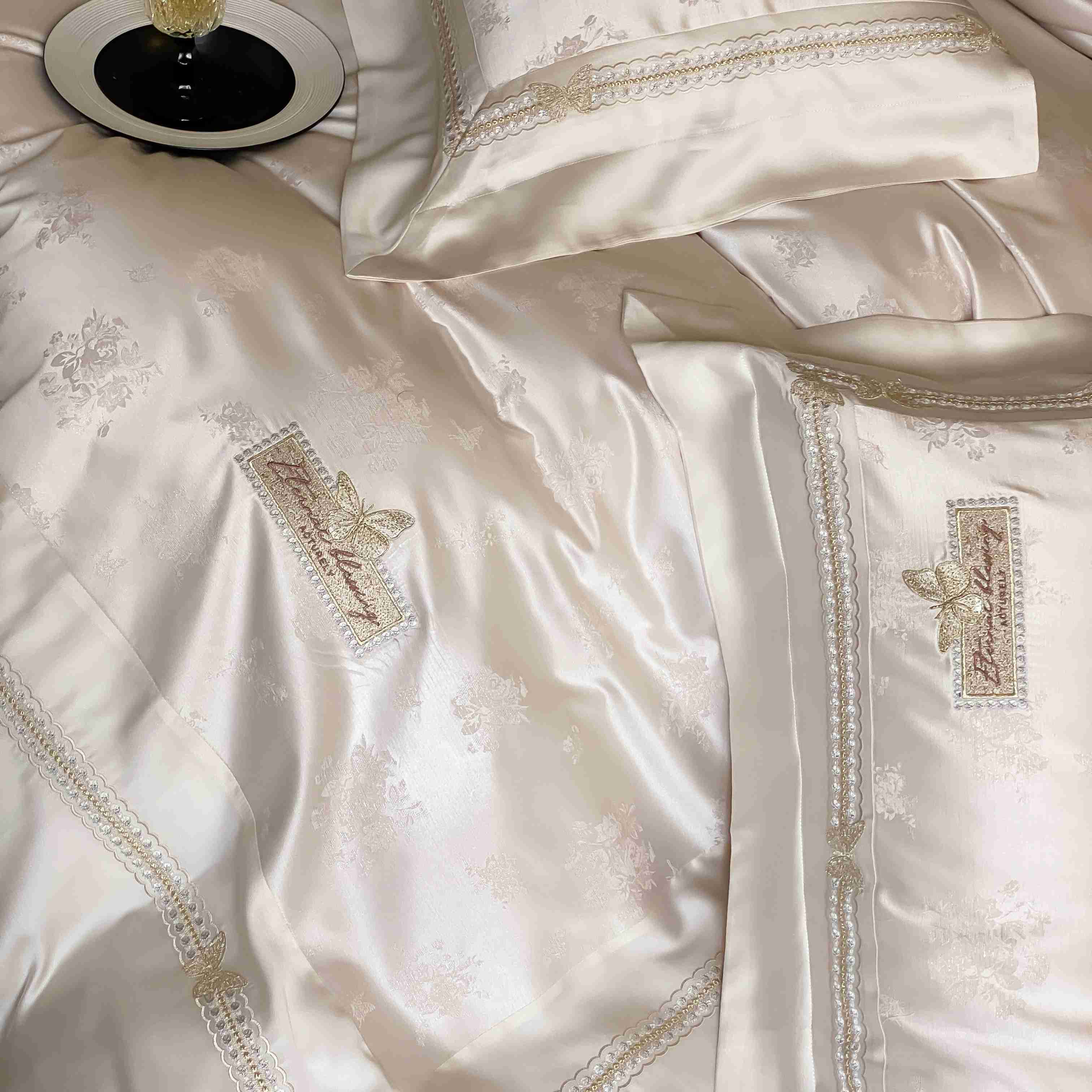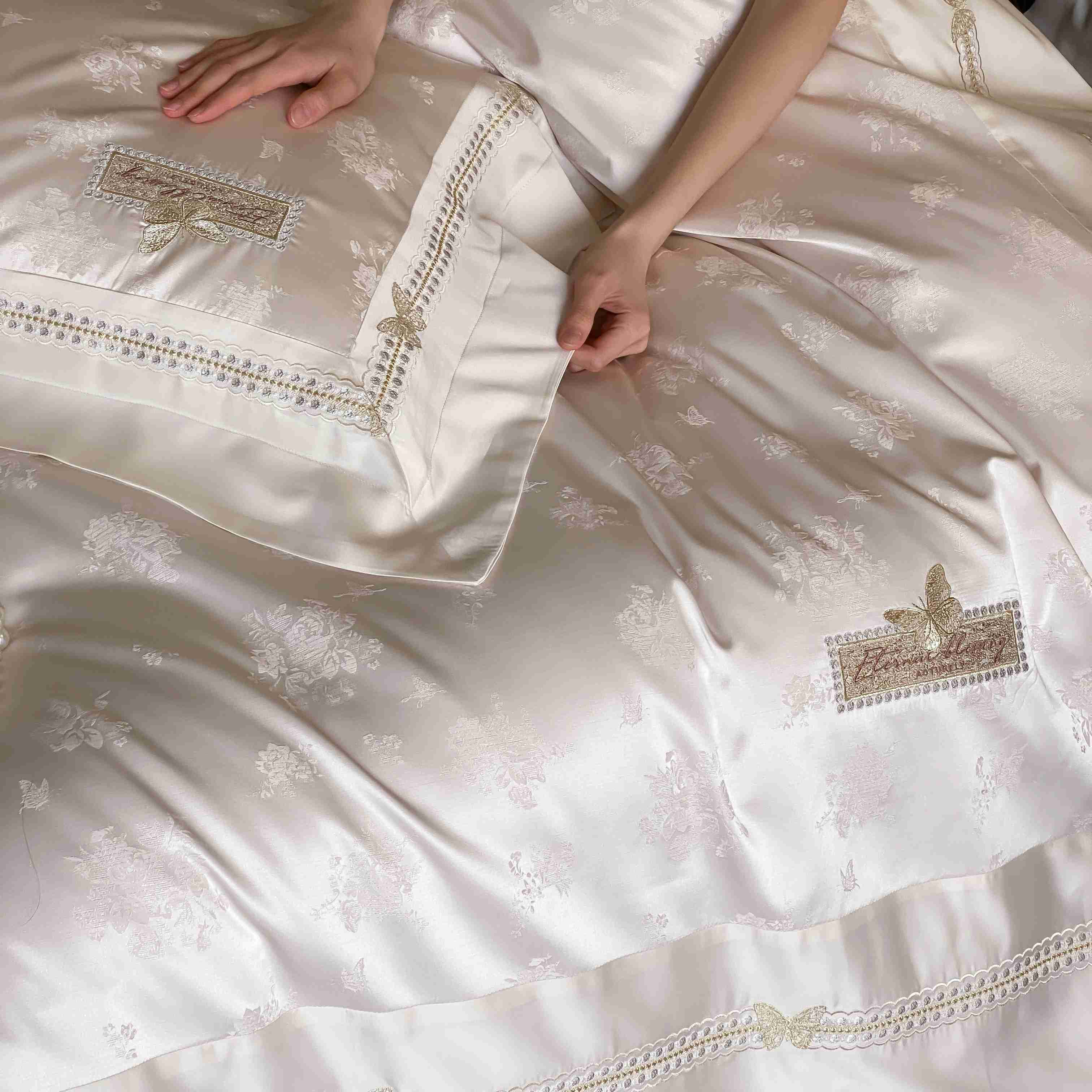 商品名称:太古汇家居 2025新款天丝高精密提花+绣花“花间蝶影”系列四件套 花间蝶影-香槟