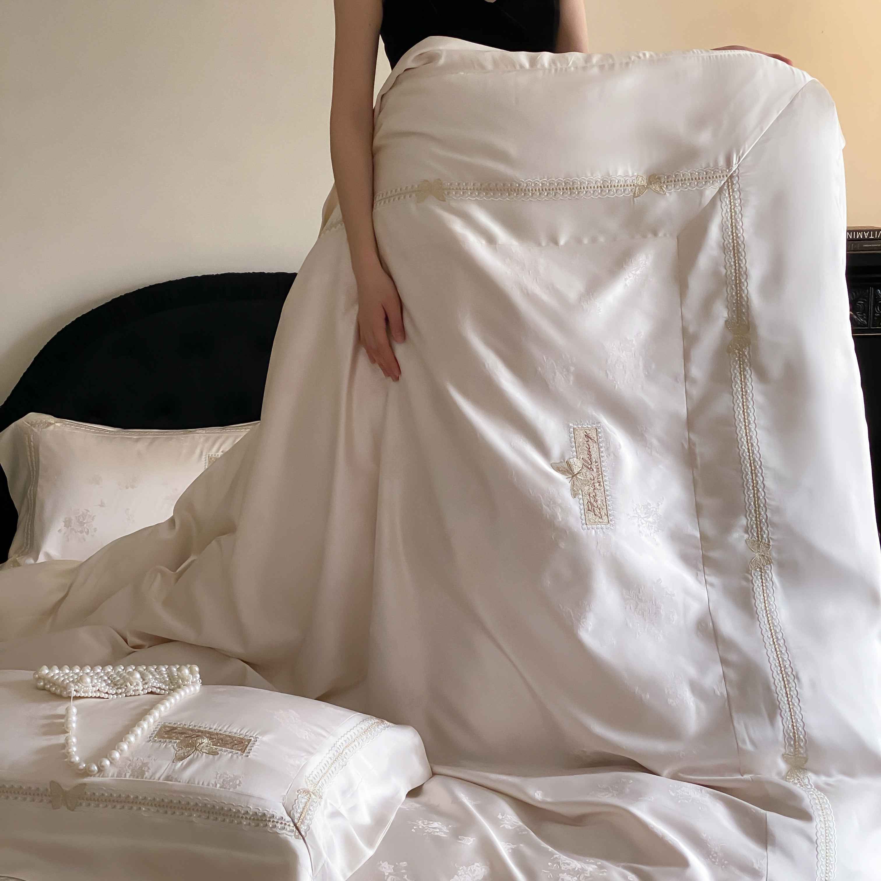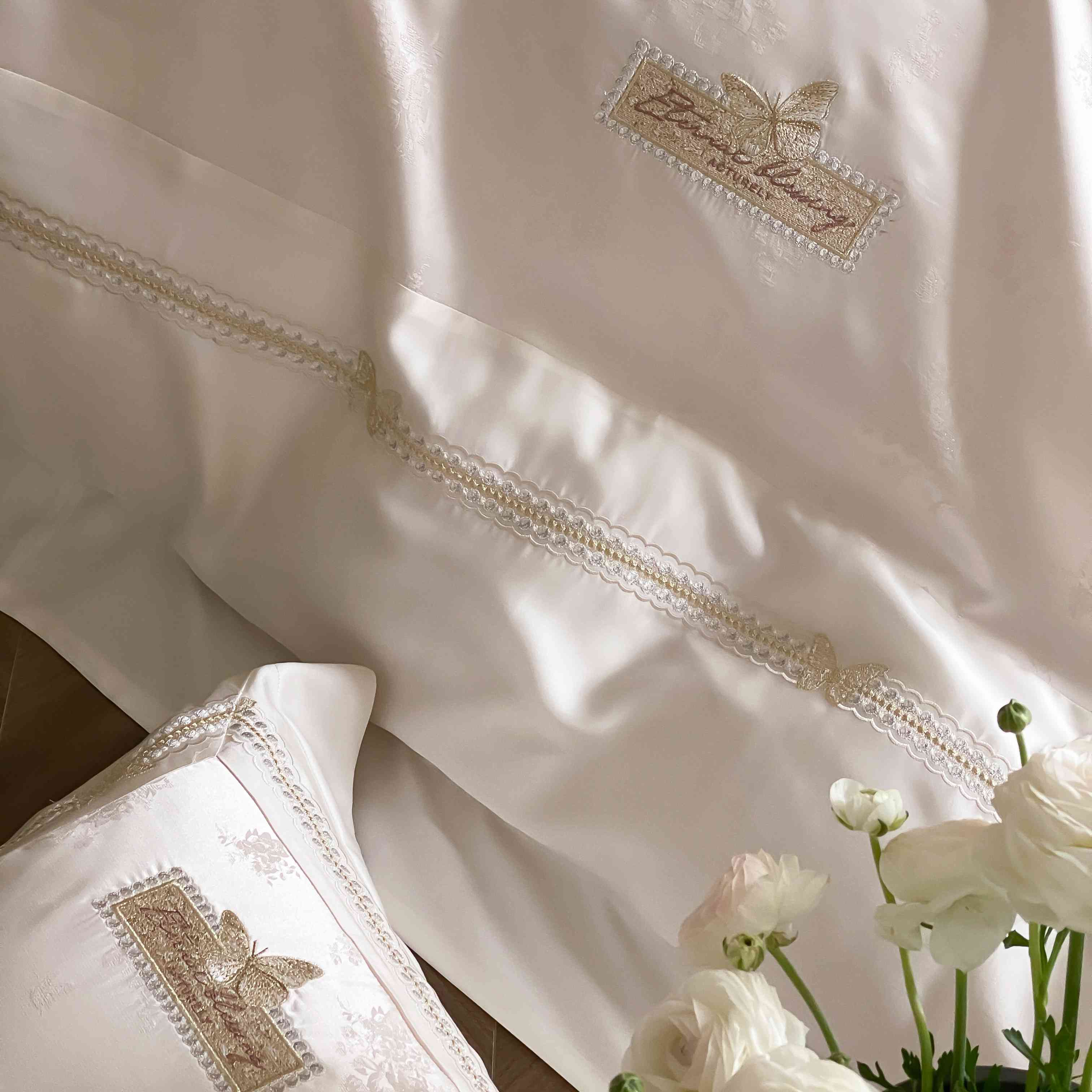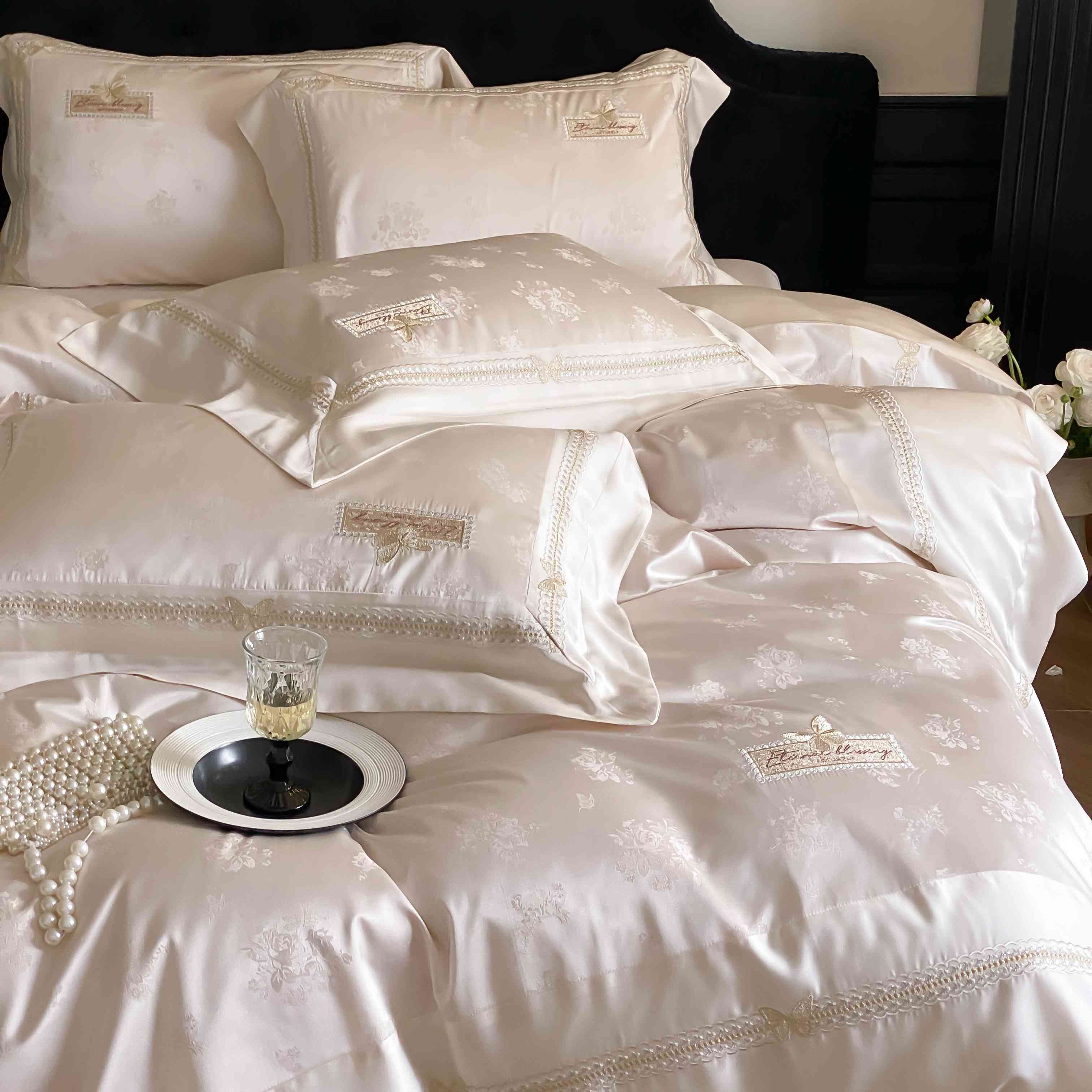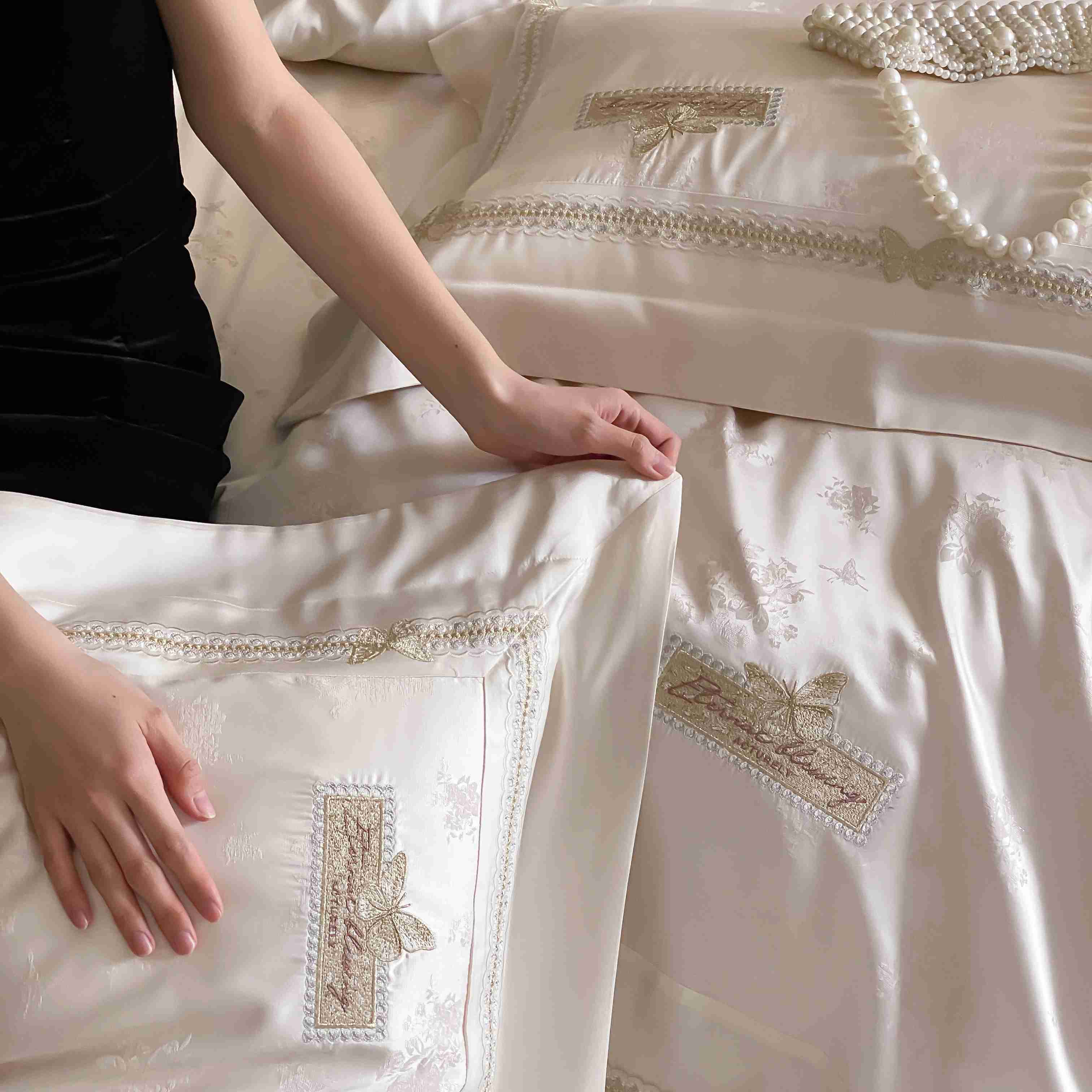 商品名称:太古汇家居 2025新款天丝高精密提花+绣花“花间蝶影”系列四件套 花间蝶影-香槟