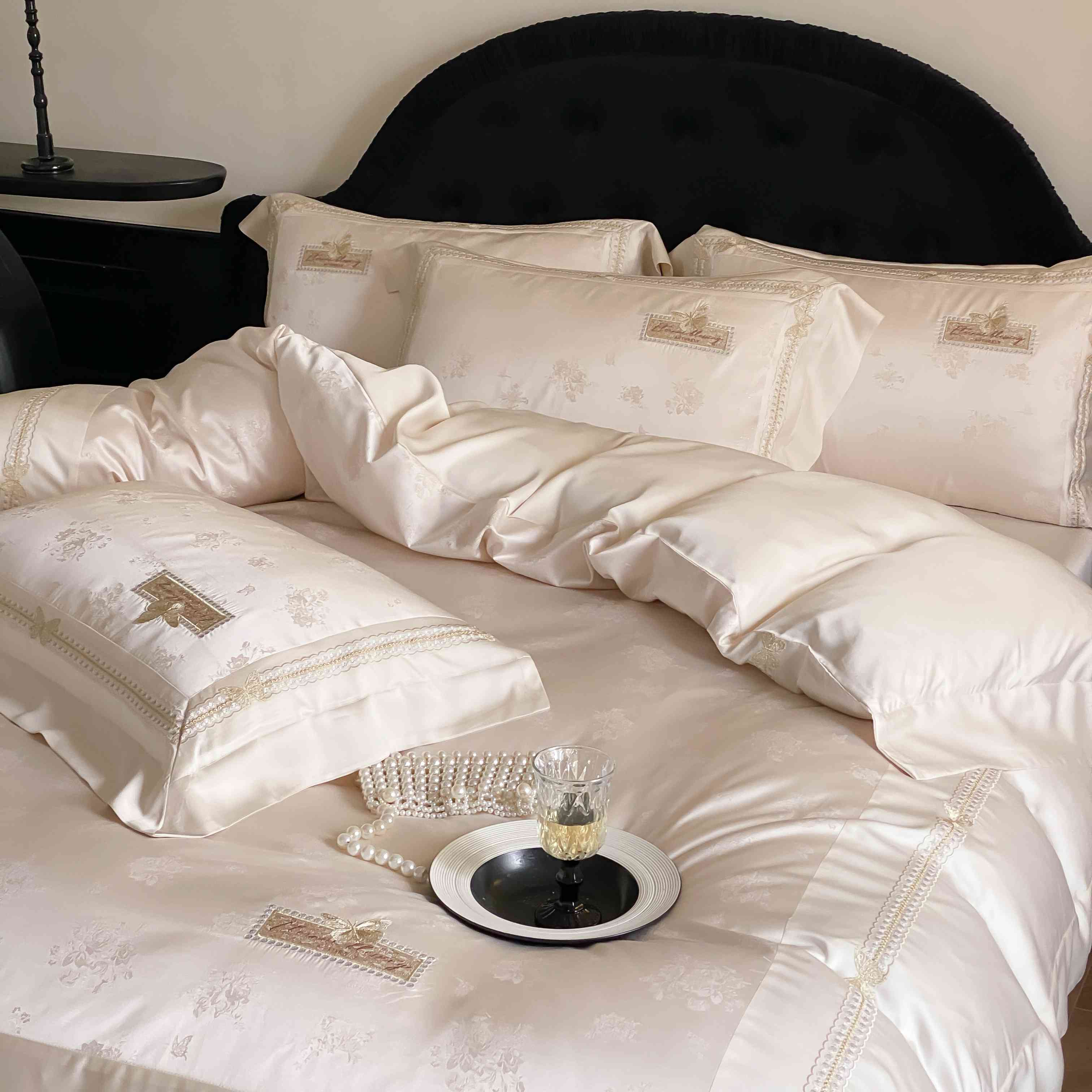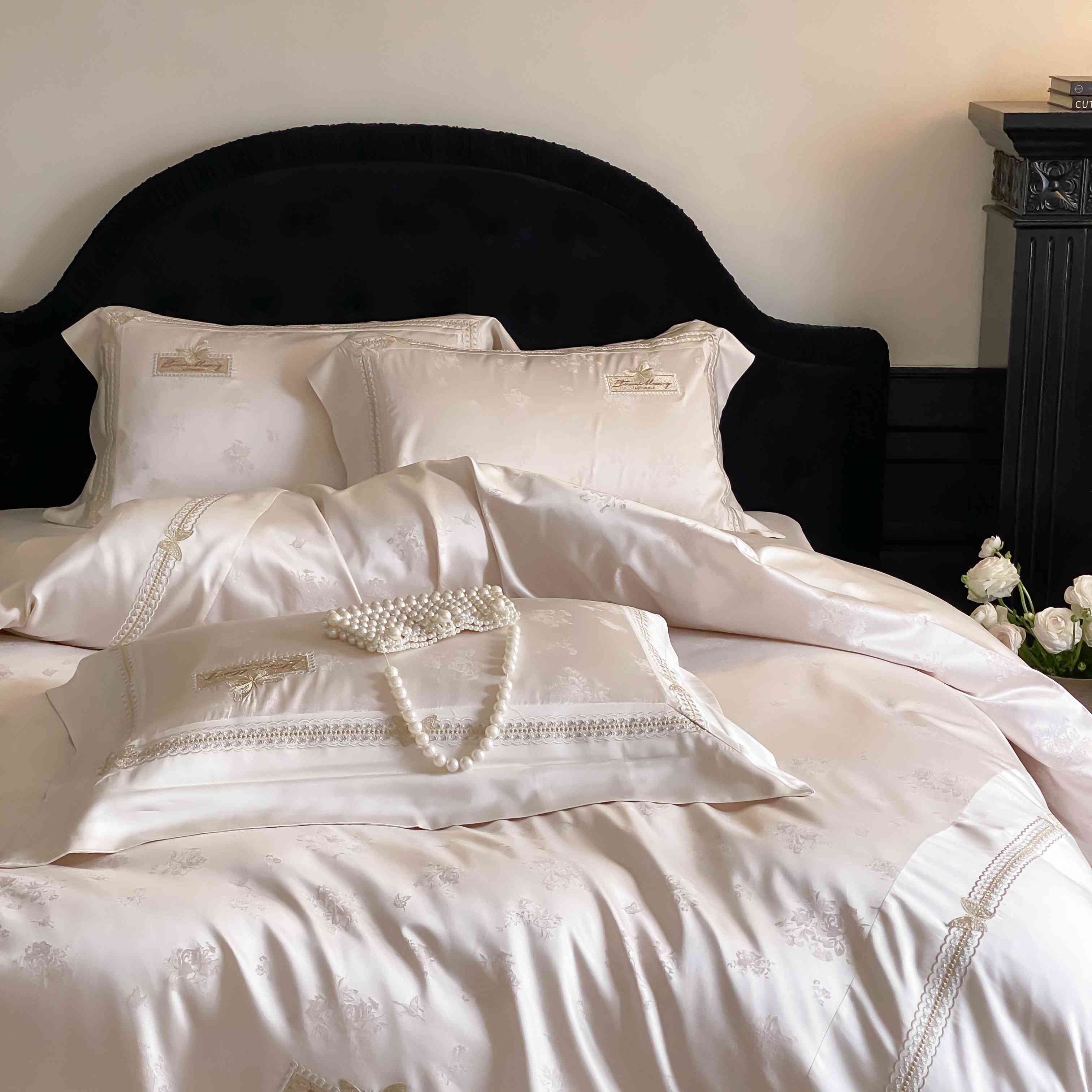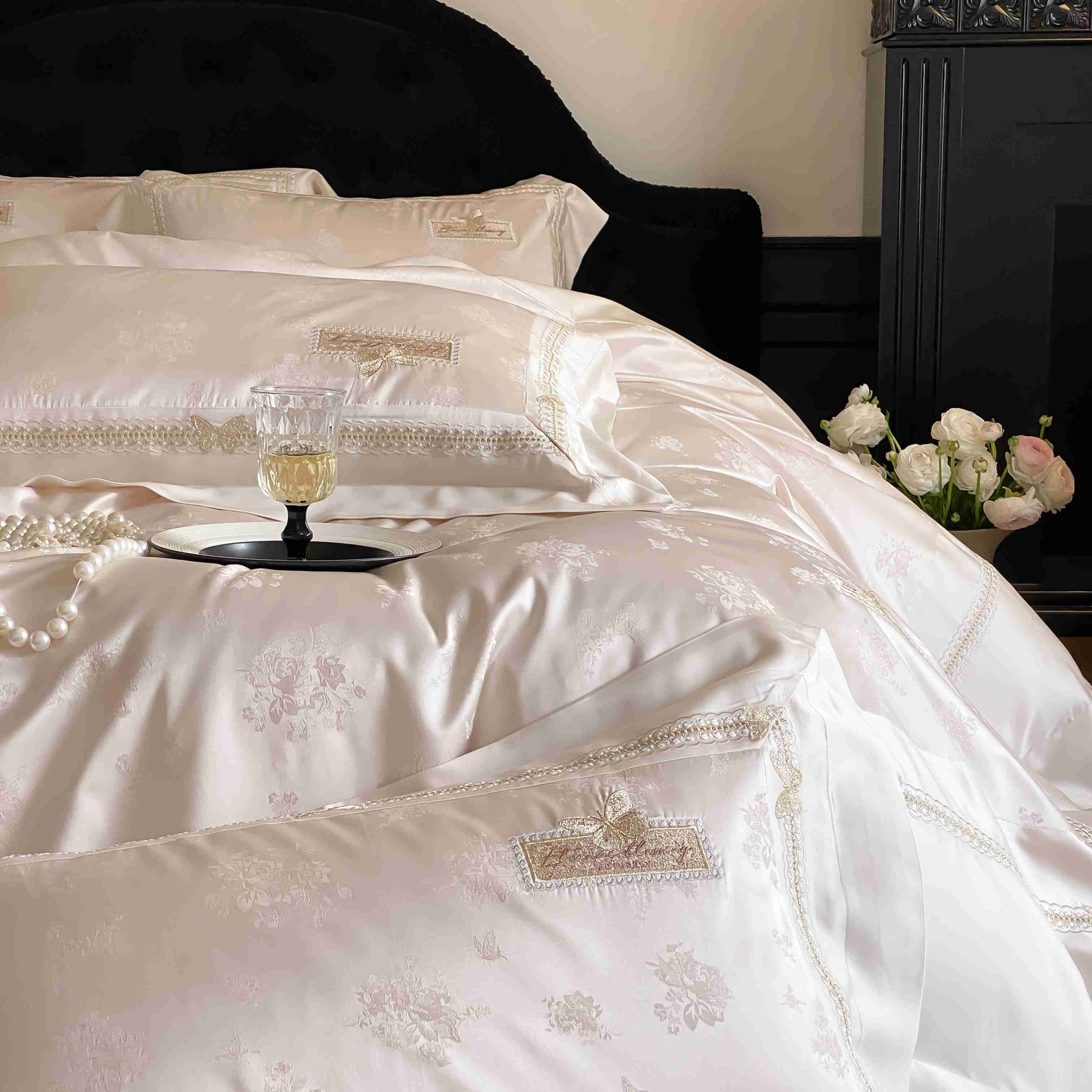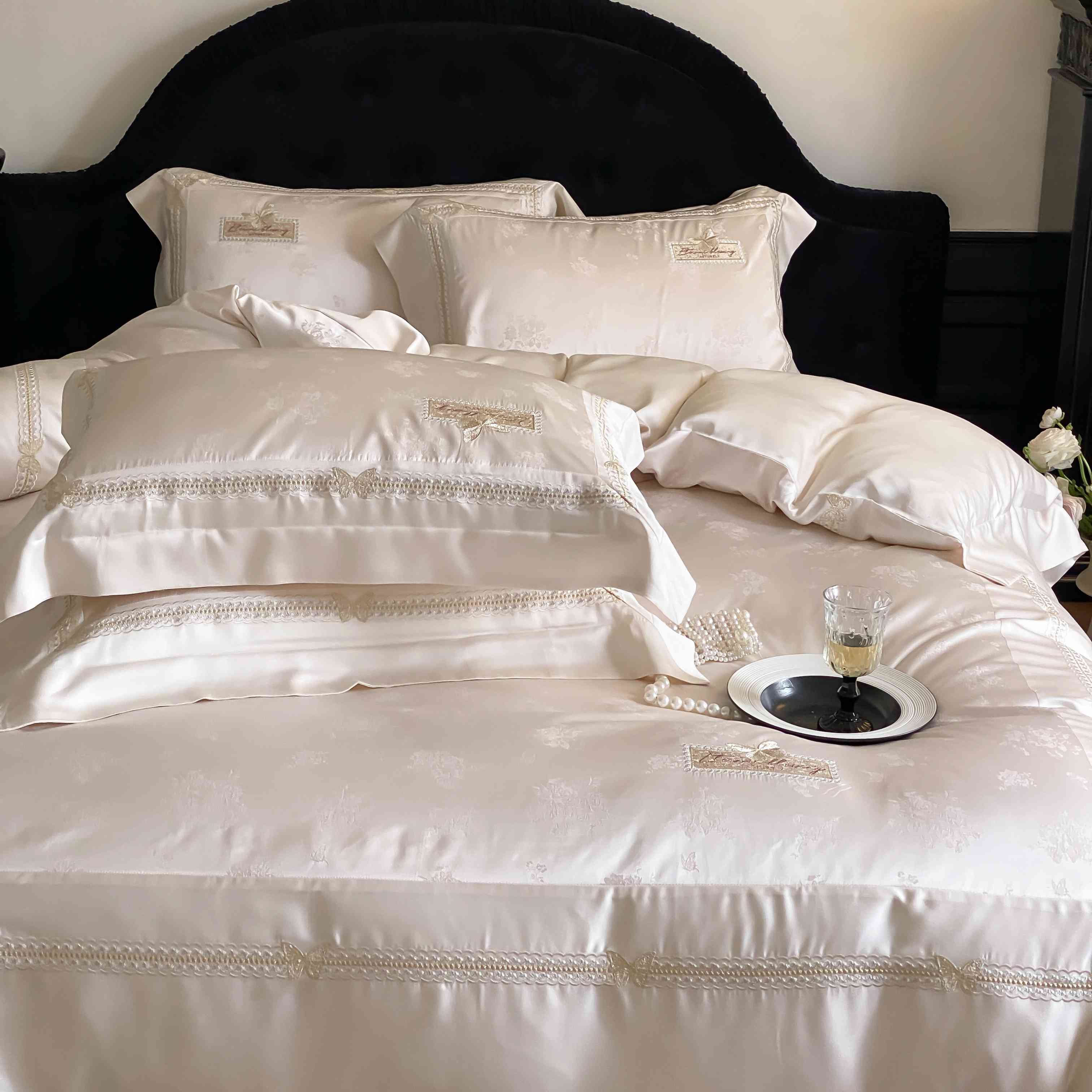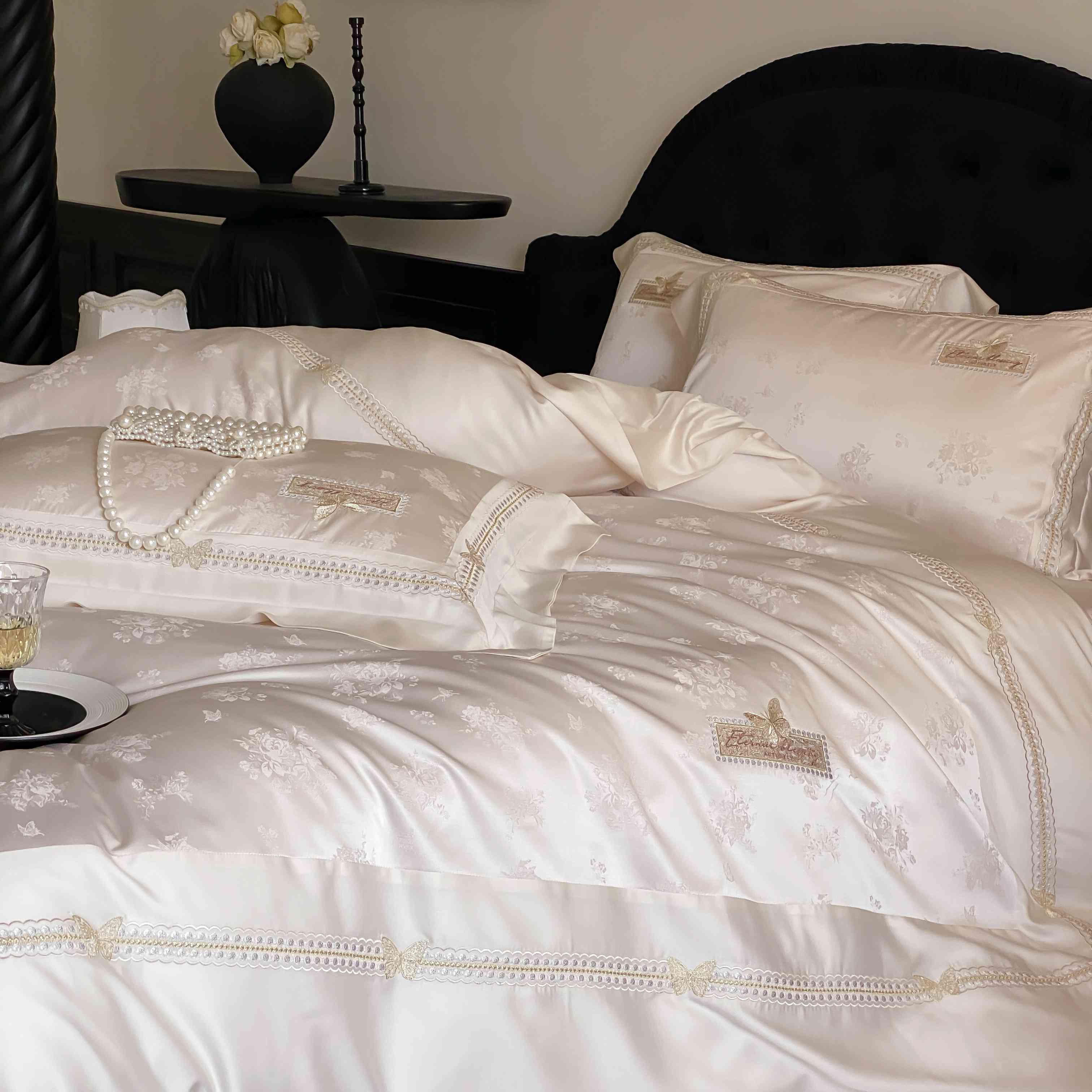 商品名称:太古汇家居 2025新款天丝高精密提花+绣花“花间蝶影”系列四件套 花间蝶影-香槟