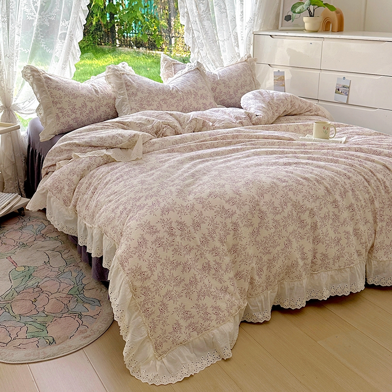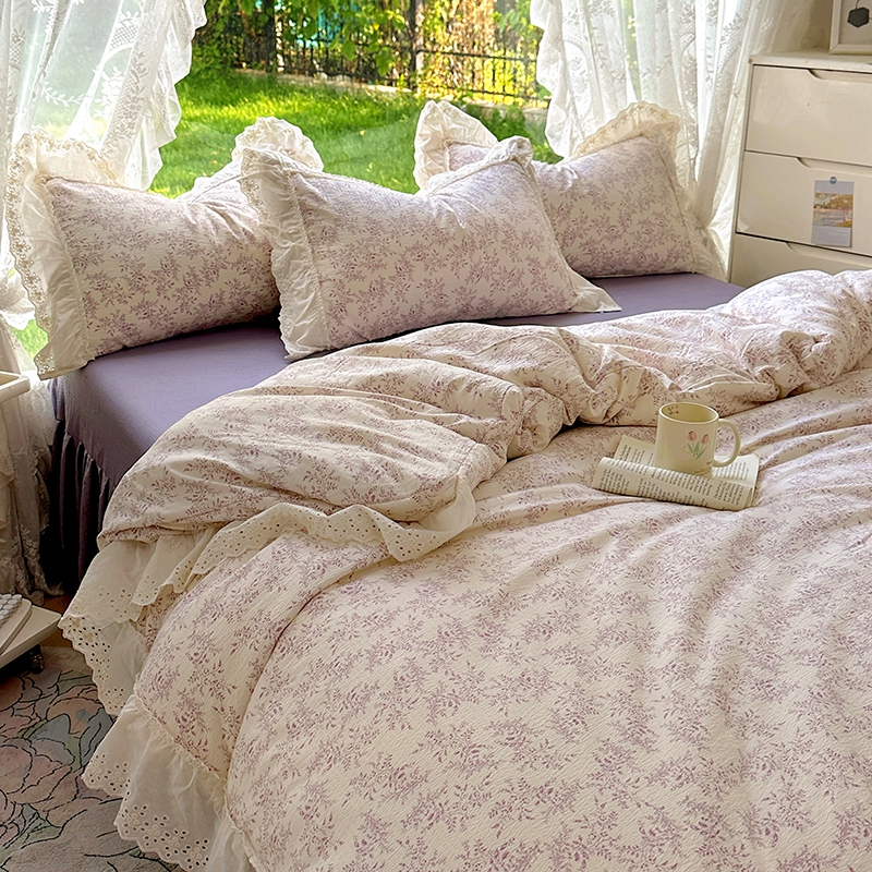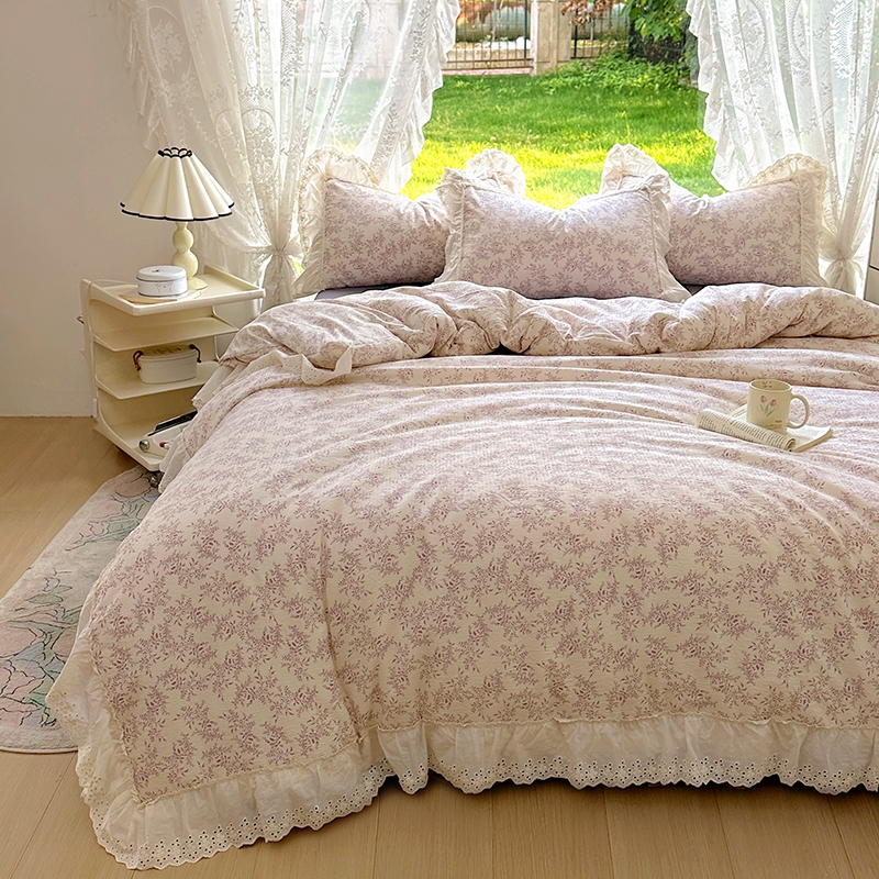 仟网汇 2025新款皱皱纱花边床裙四件套多功能夏被夏凉被空调被四件套四季通用 风信紫