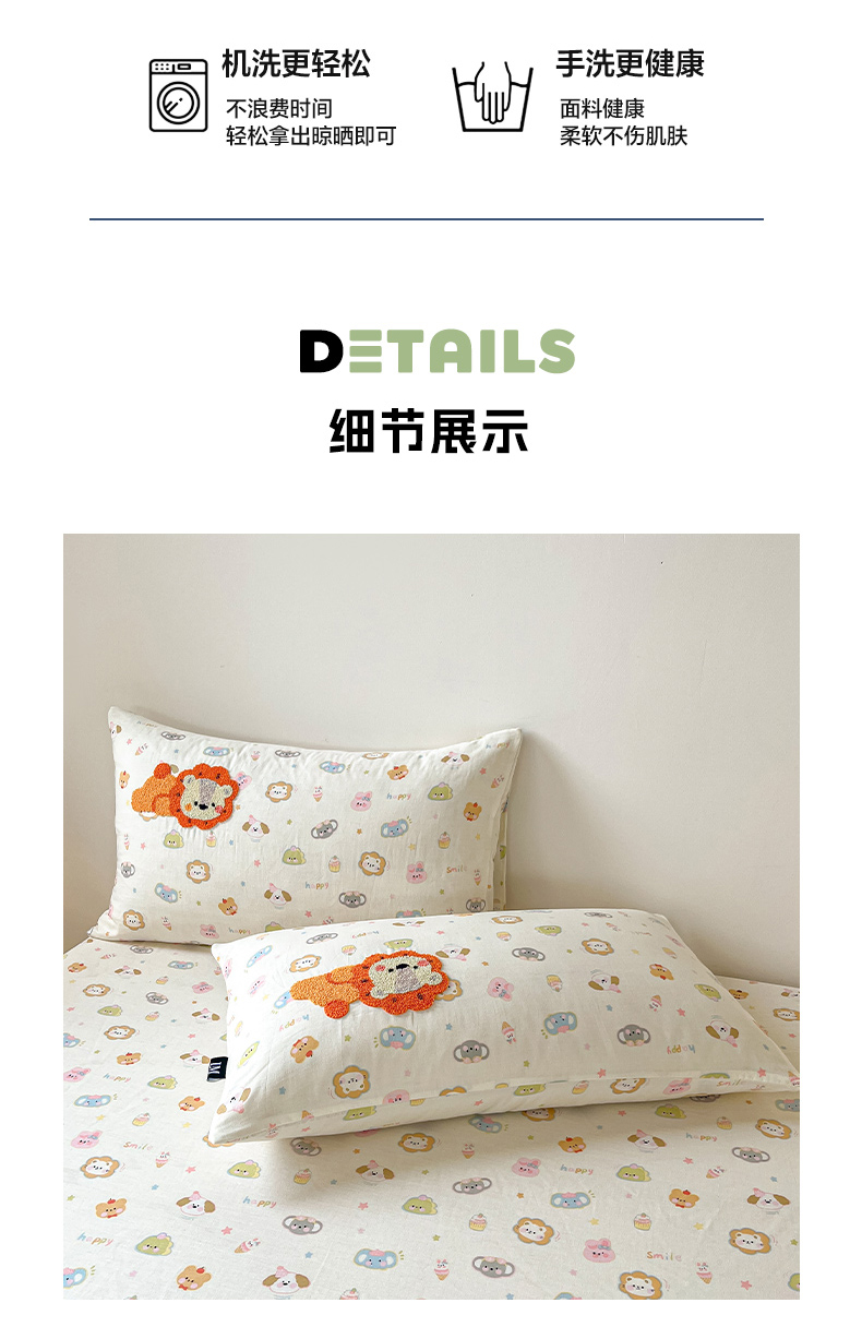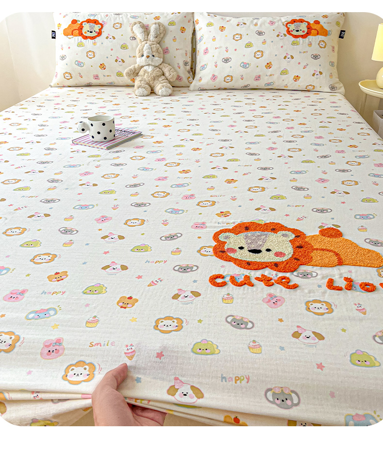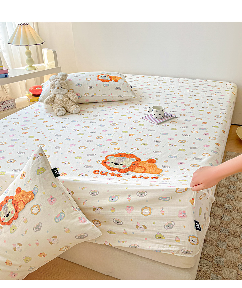 商品名称:乐美家纺 2025新款懒洋洋全棉双层纱毛巾绣床笠三件套(提供买家秀) 笨笨狮
