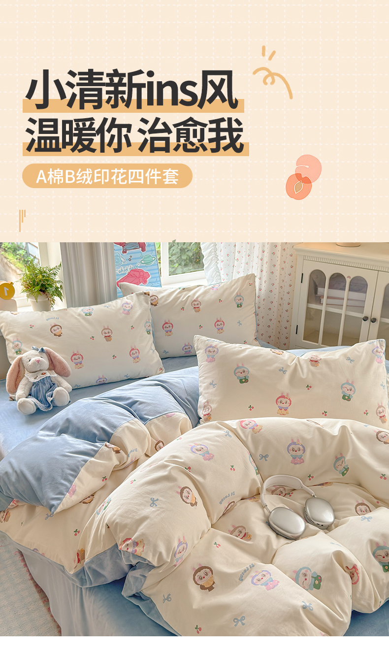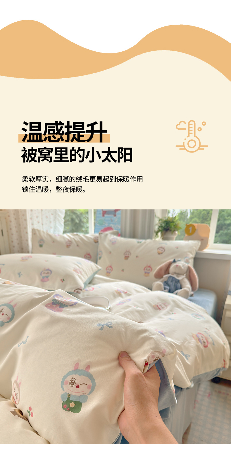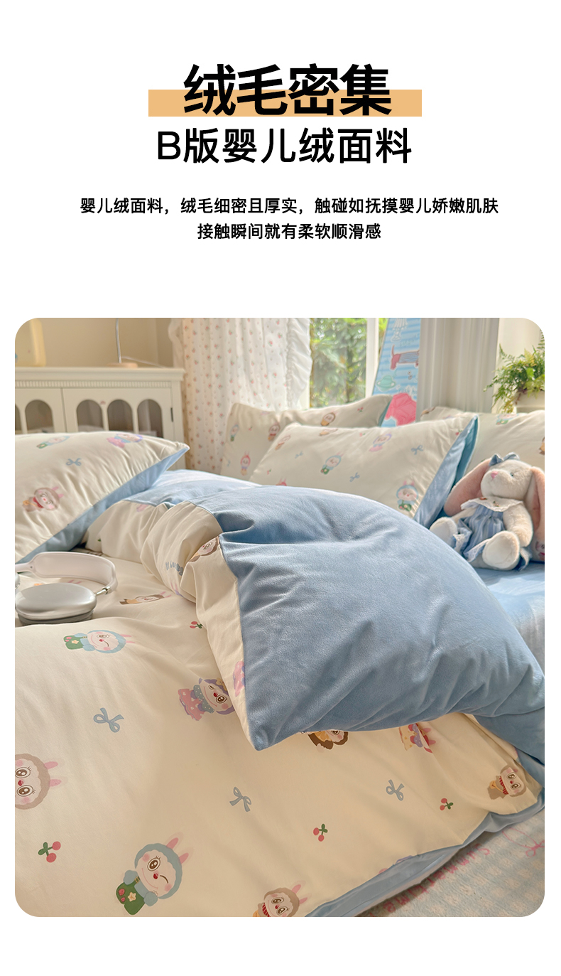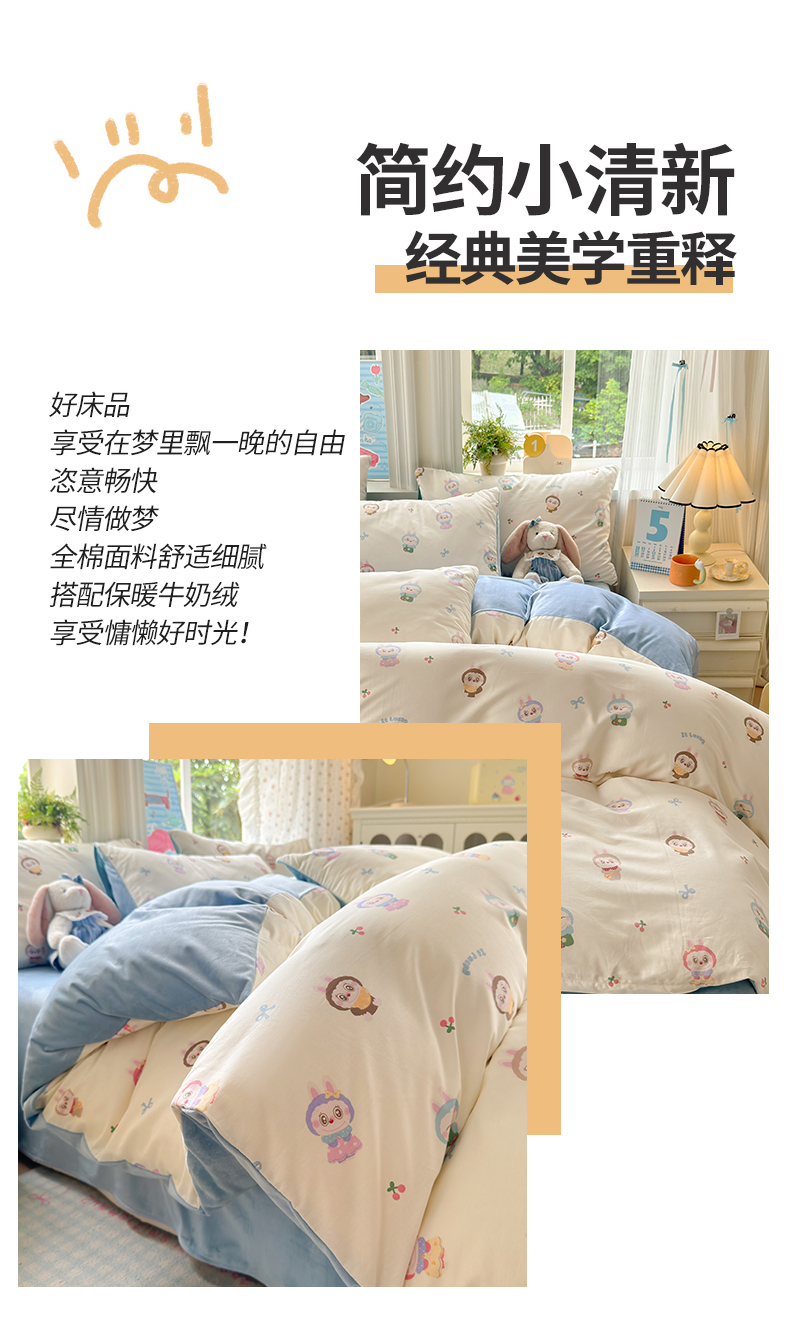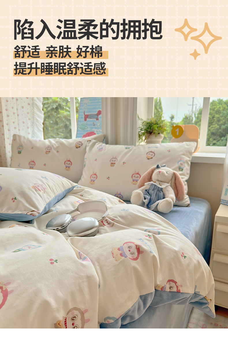 当前位置: 91家纺网 > 商品网购 > 床品套件 > 四件套 > 全棉普通四件套 > 清雅福 2025秋冬新品全棉印花棉加绒四件套系列 棉绒-大眼公仔