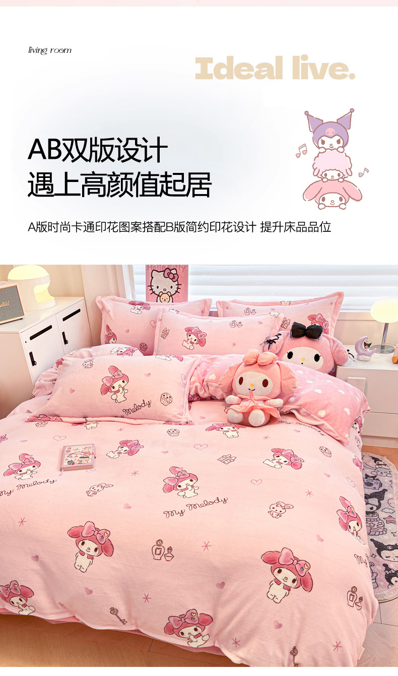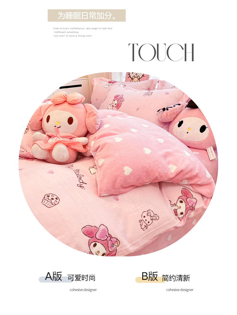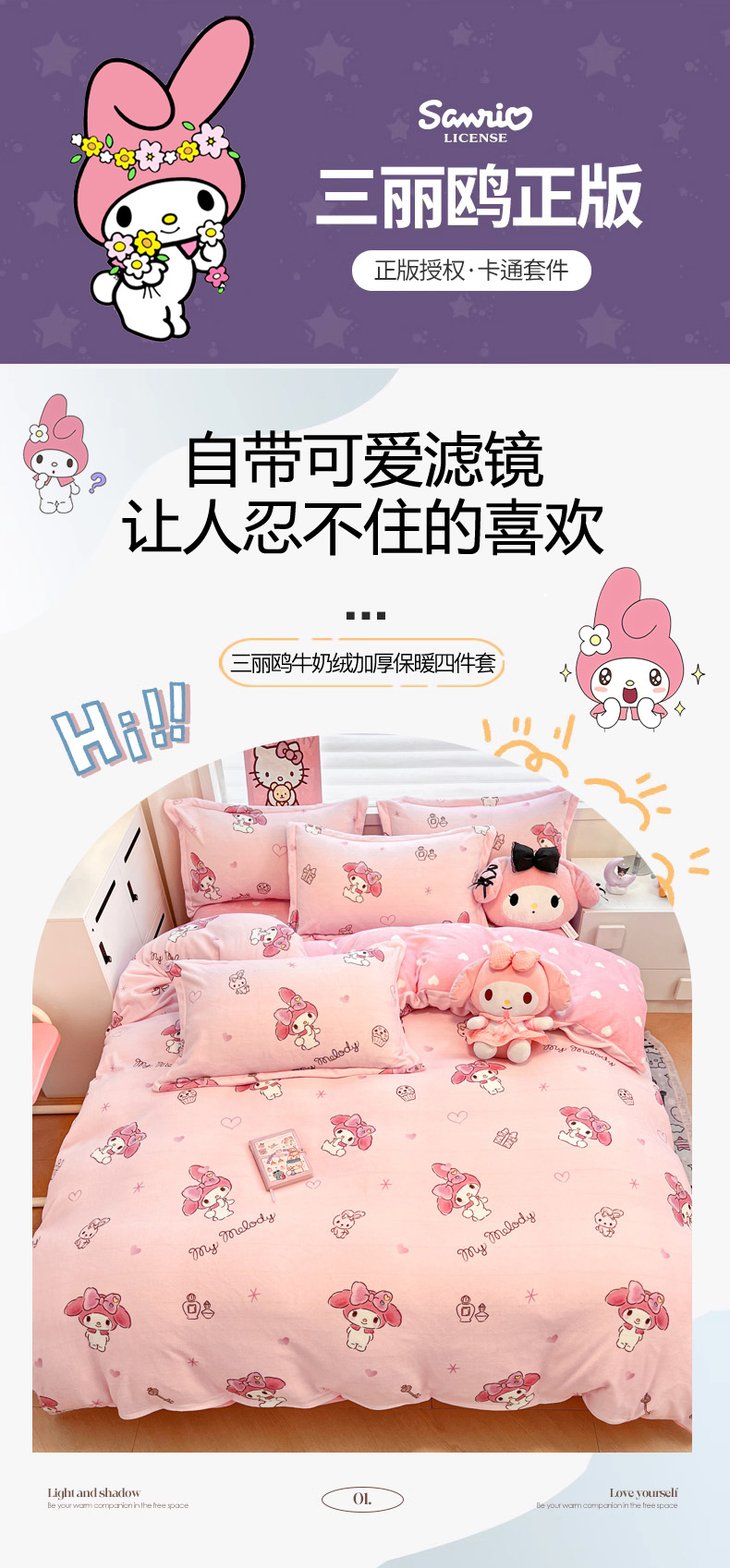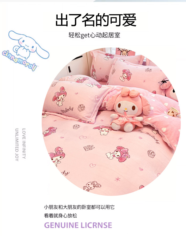 当前位置: 91家纺网 > 商品网购 > 床品套件 > 四件套 > 牛奶绒四件套 > 暮思家居 2025新款三丽鸥正版授权高克重200克加厚保暖卡通牛奶绒四件套 牛奶绒-兔妮美乐蒂