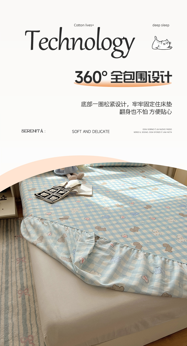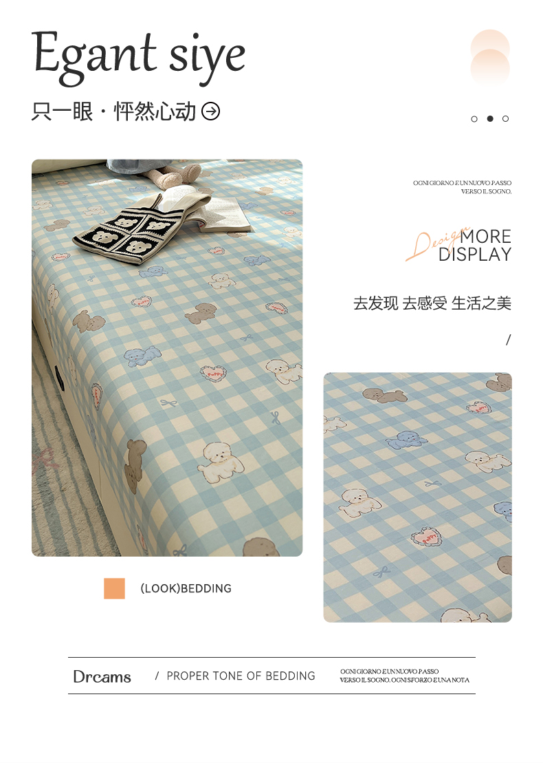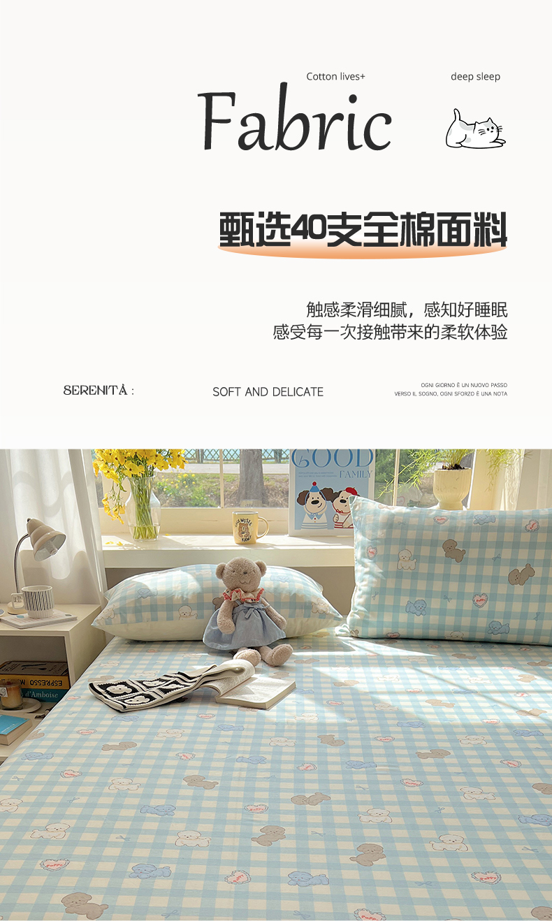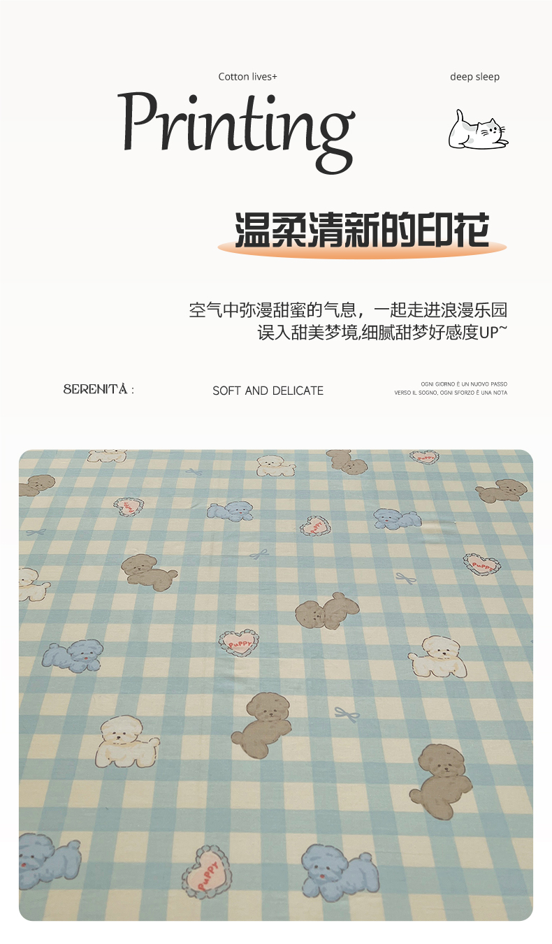 六巷胡同 2026新款40支全棉13070卡通单品床笠 蓝格奶油狗