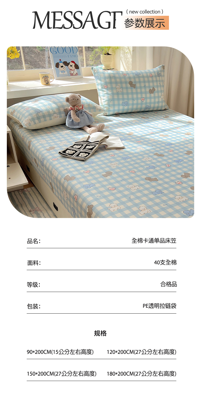 商品名称:六巷胡同 2026新款40支全棉13070卡通单品床笠 蓝格奶油狗