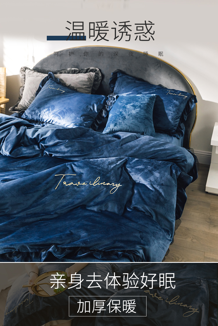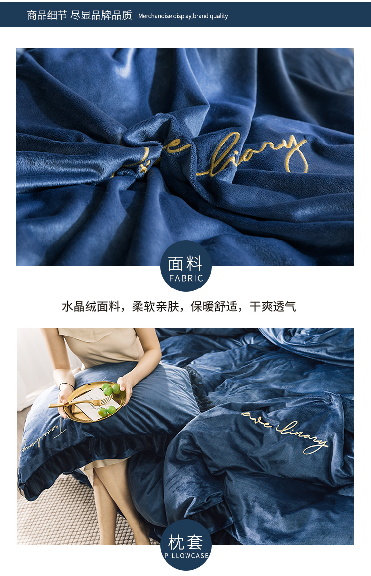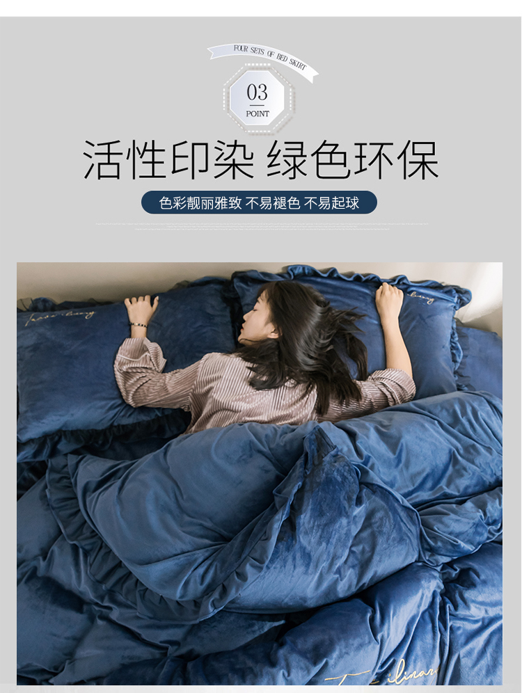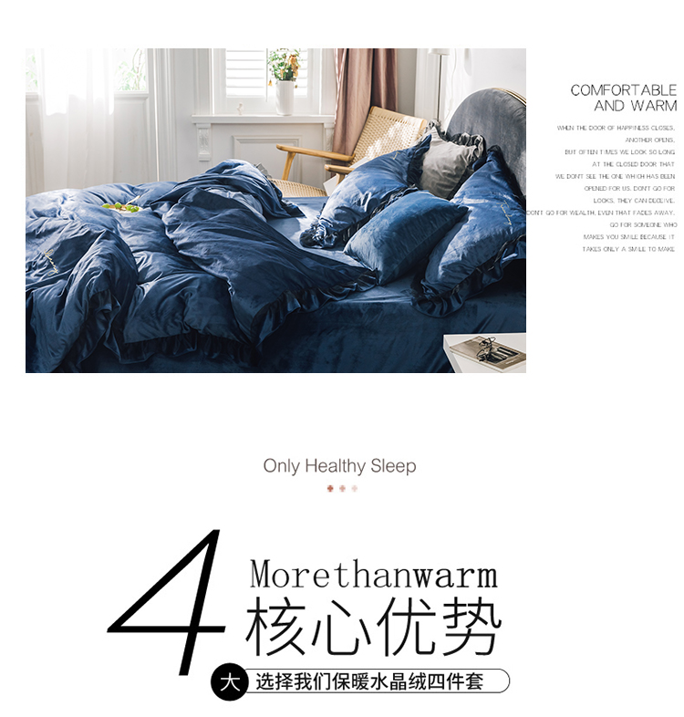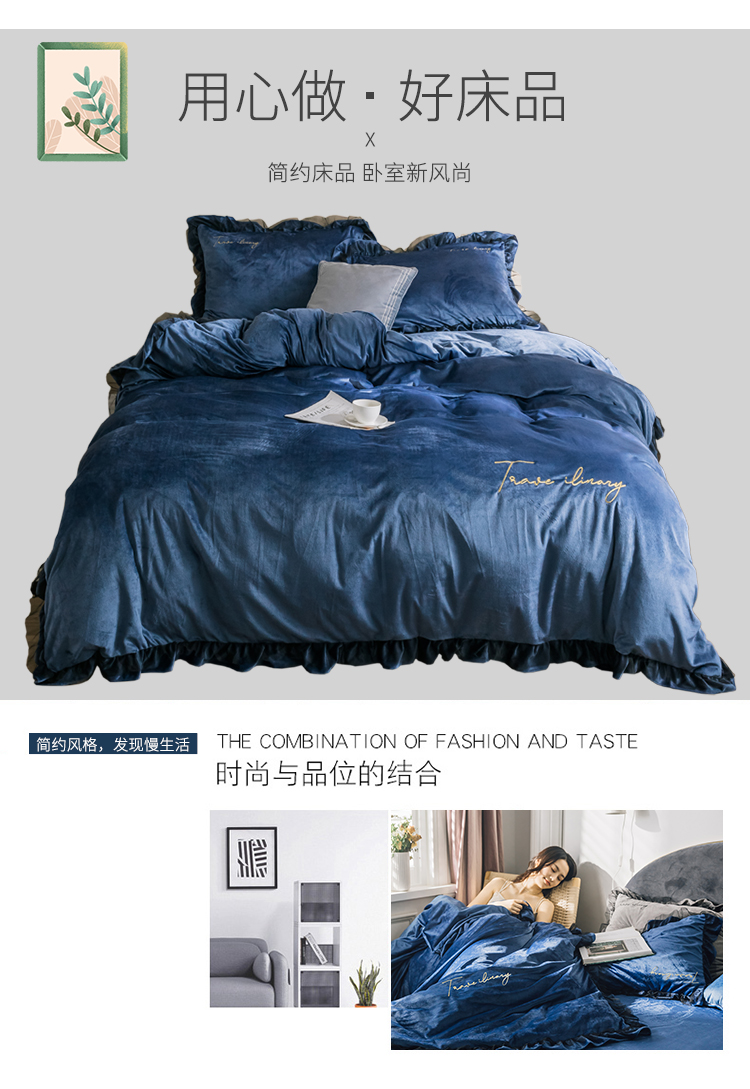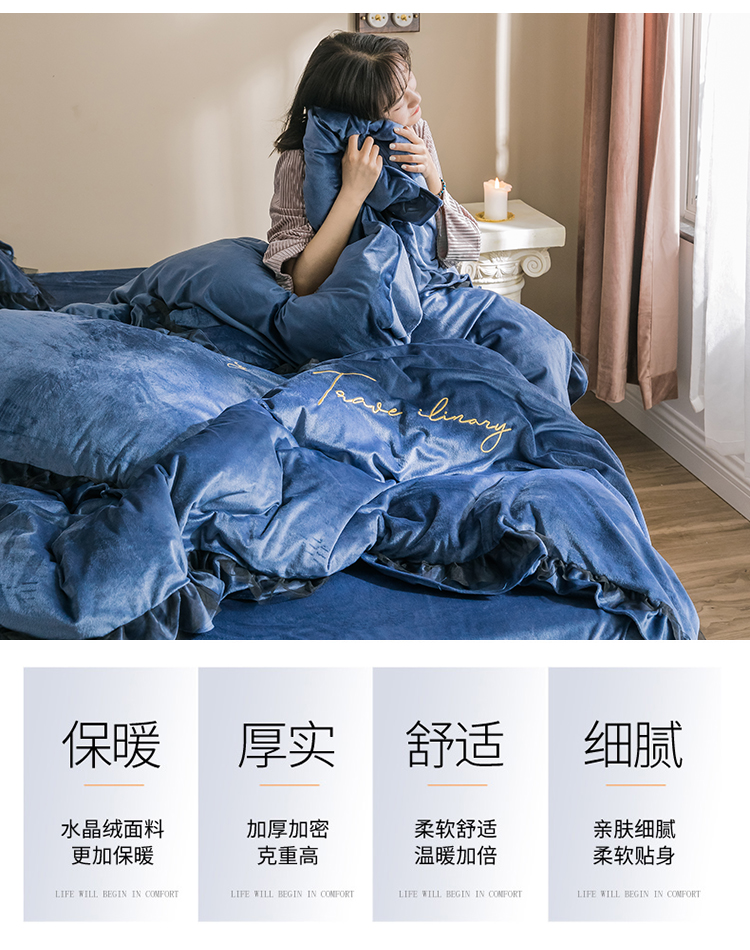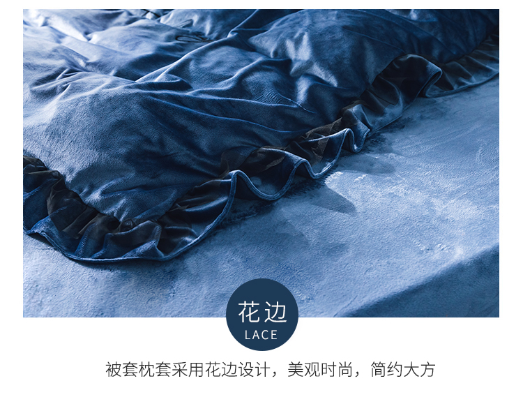 商品名称:润缦 2019新款水晶绒蕾丝边四件套 蕾丝-深海蓝