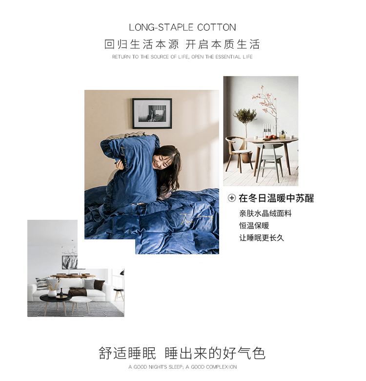 润缦 2019新款水晶绒蕾丝边四件套 蕾丝-深海蓝
