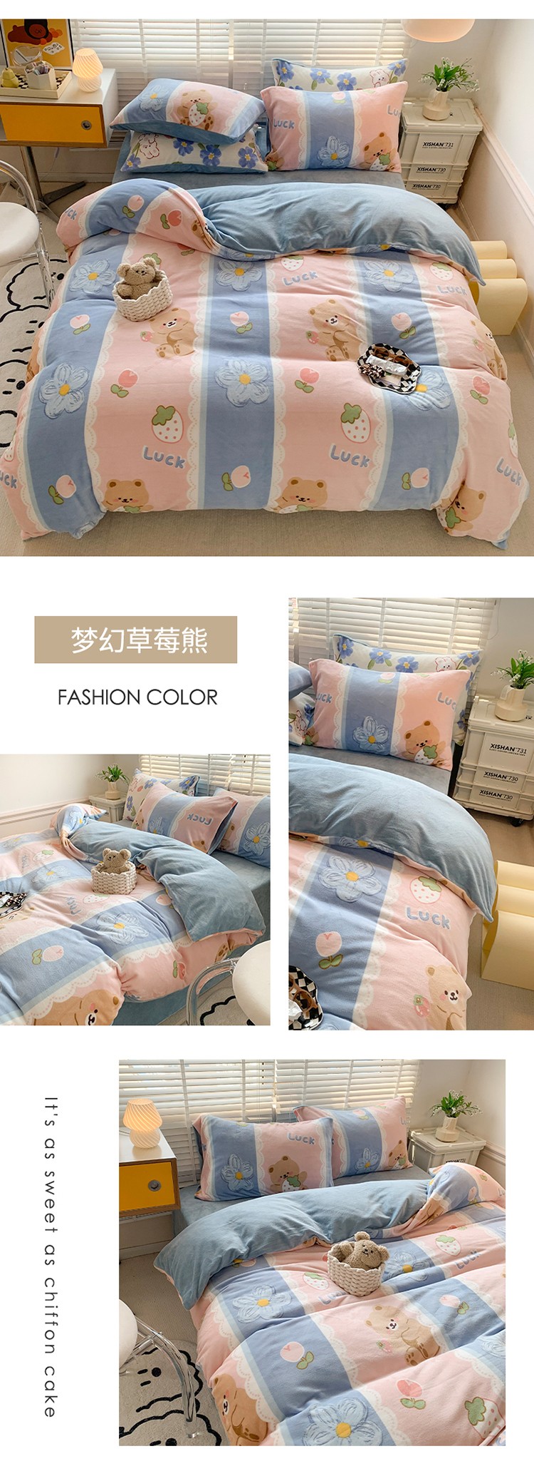 商品名称:澳萝拉 2022新款牛奶绒印花四件套 梦幻草莓熊