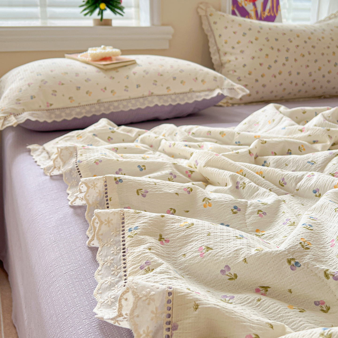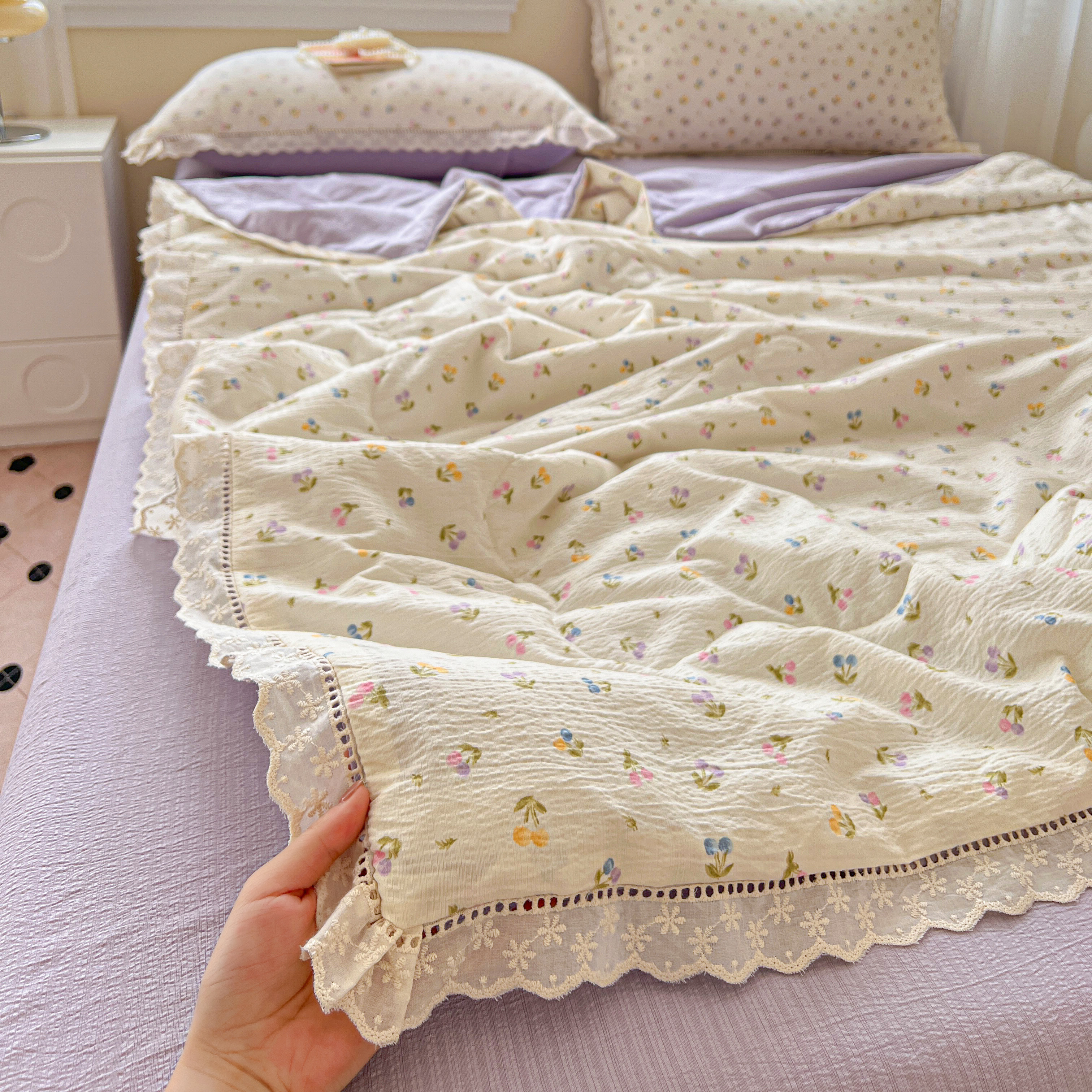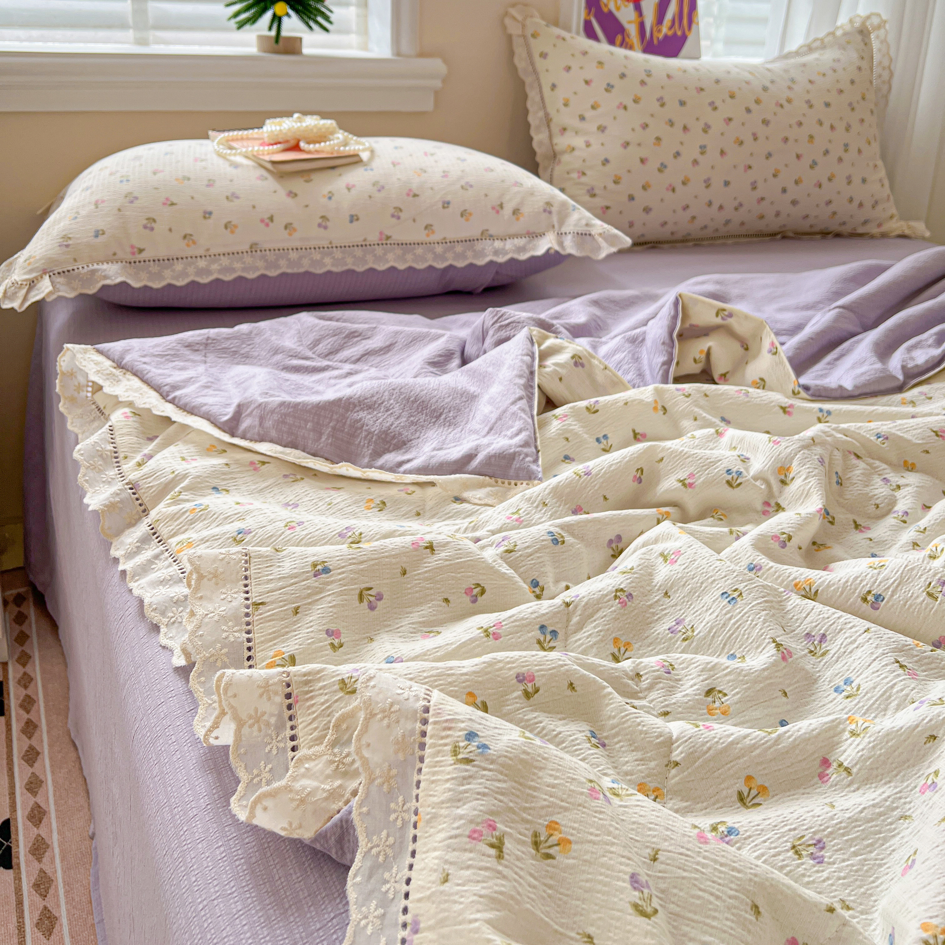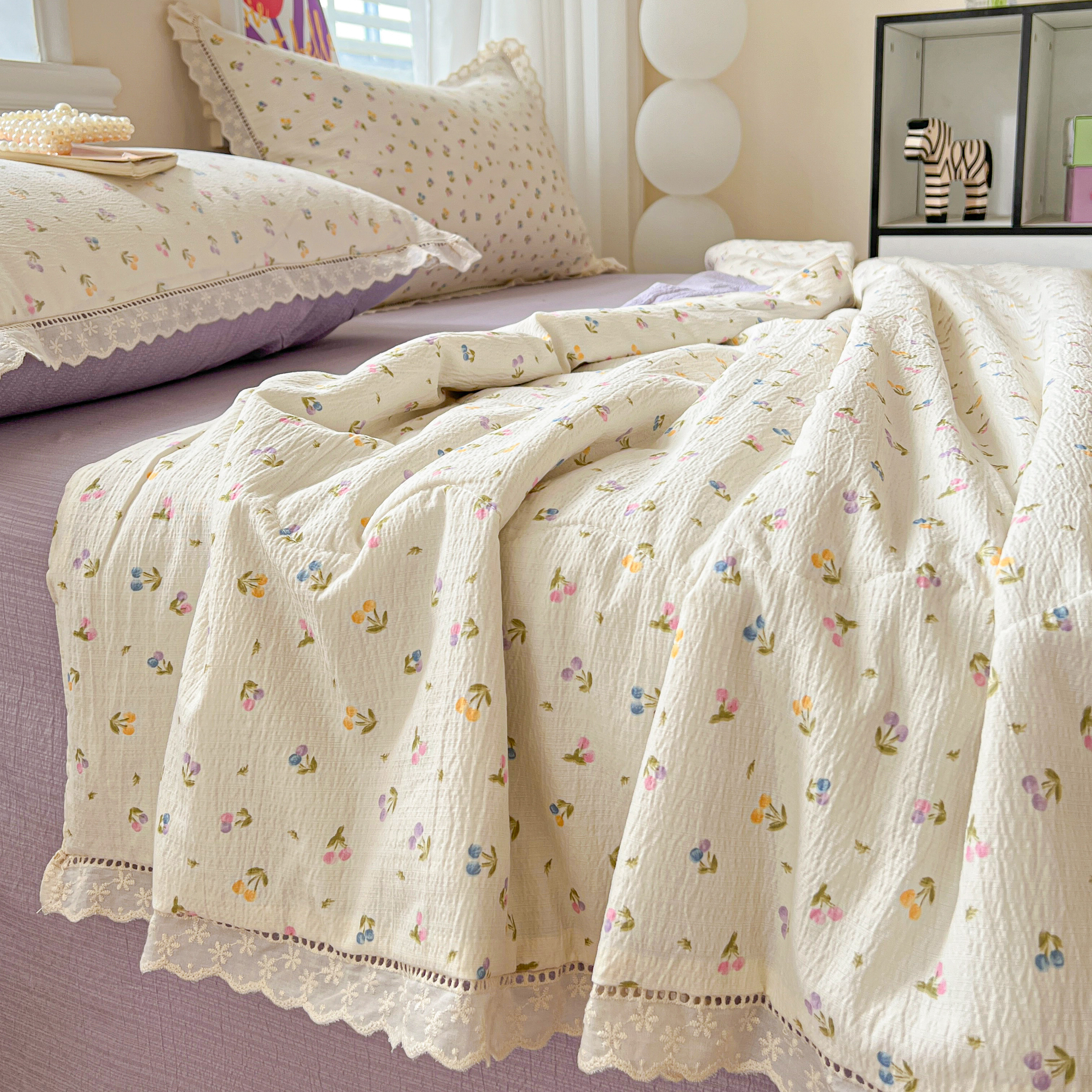 2025新款云感皱皱纱全棉花边款夏被四件套 甜茶