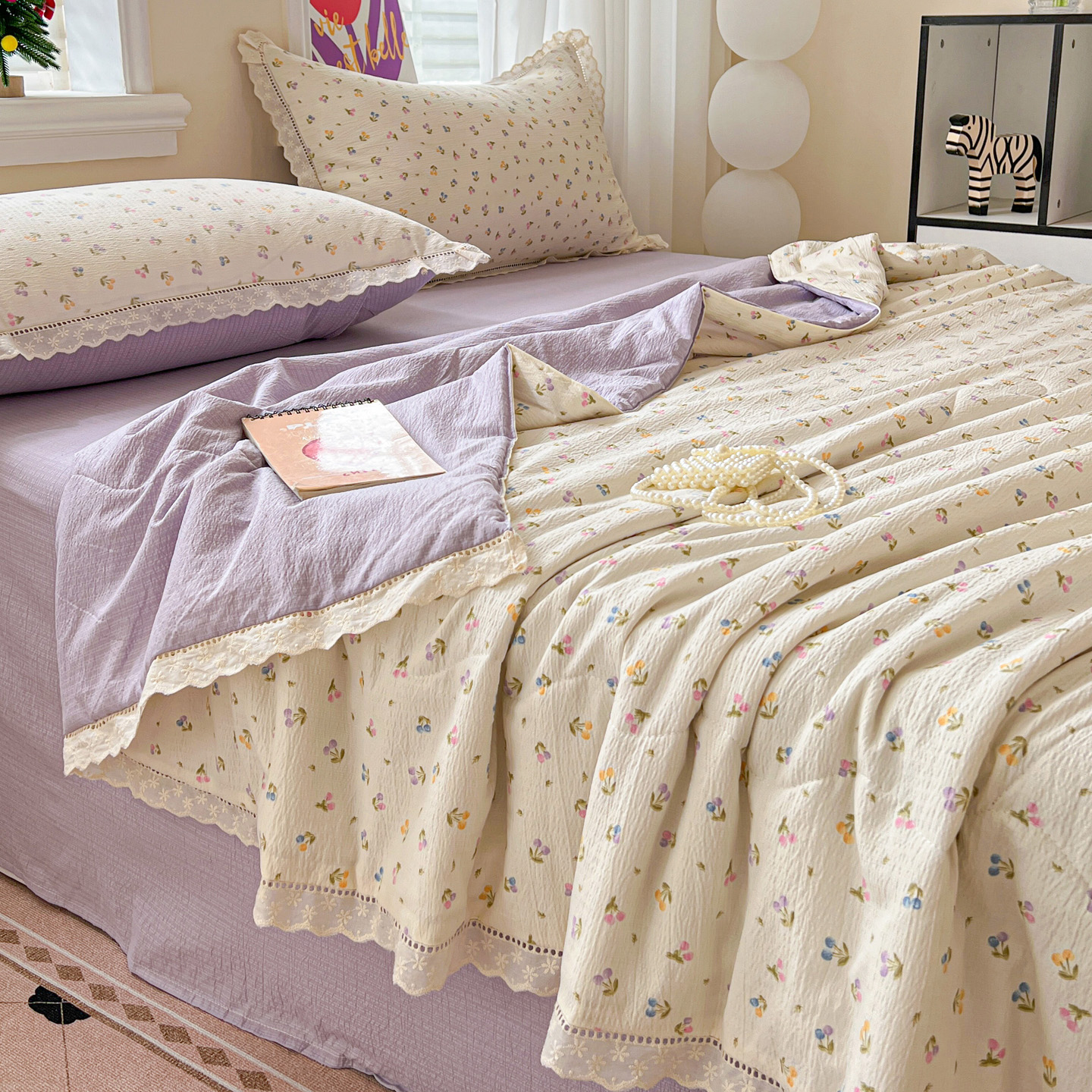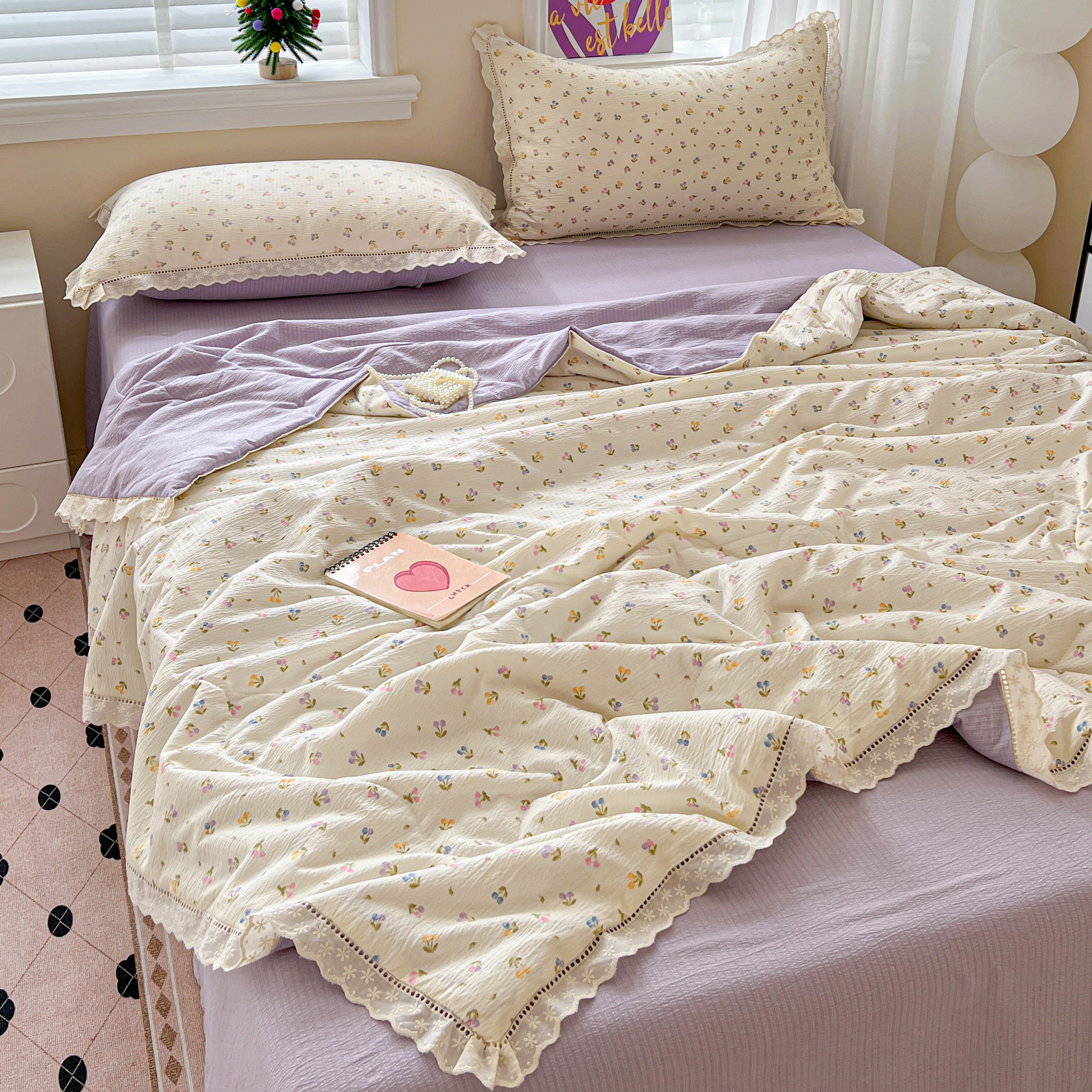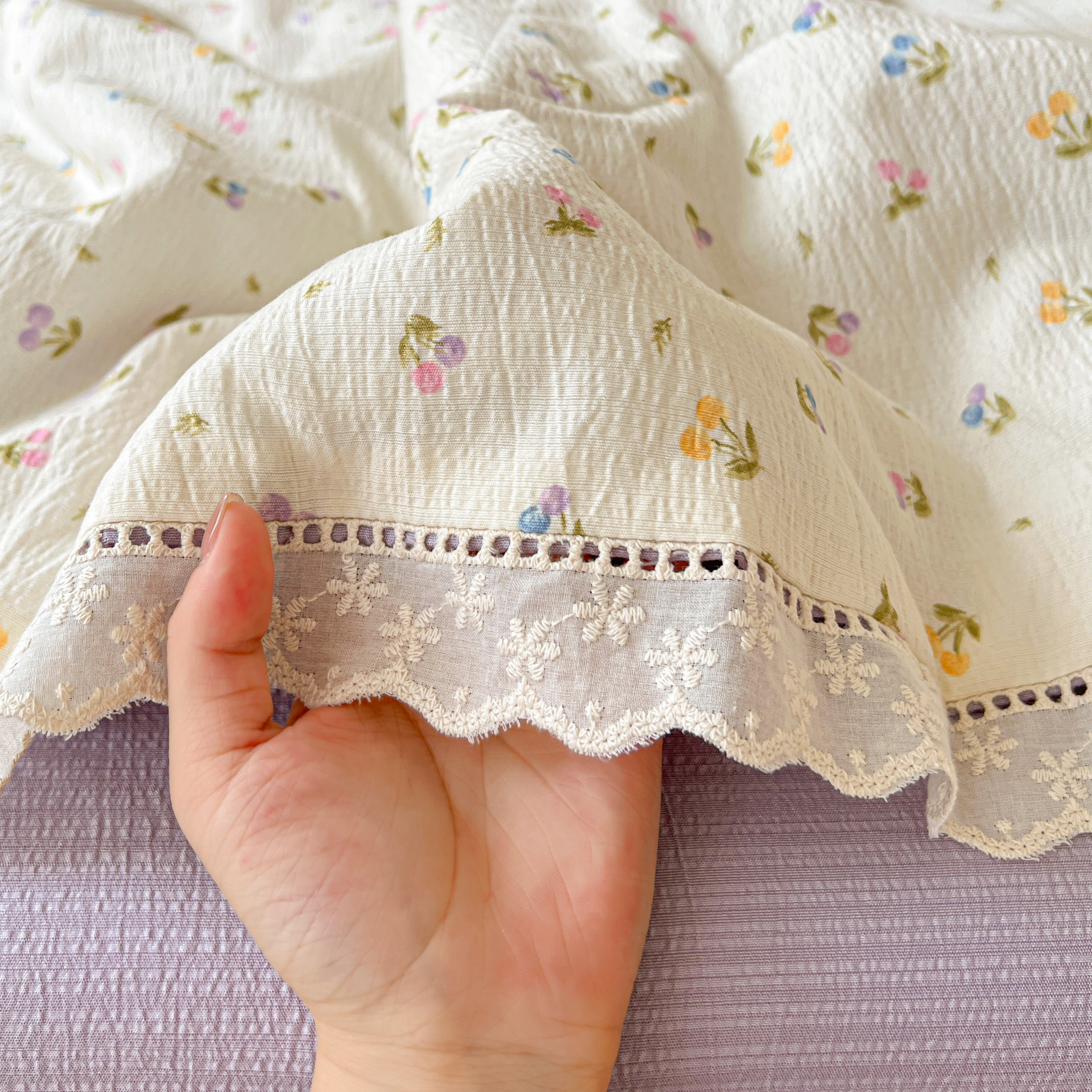 2025新款云感皱皱纱全棉花边款夏被四件套 甜茶