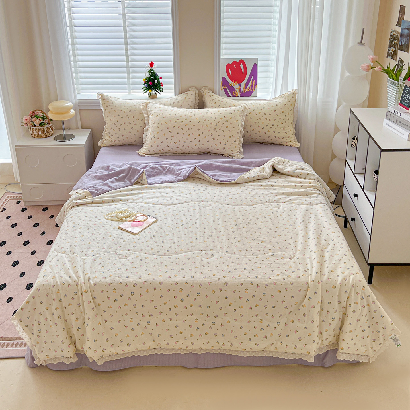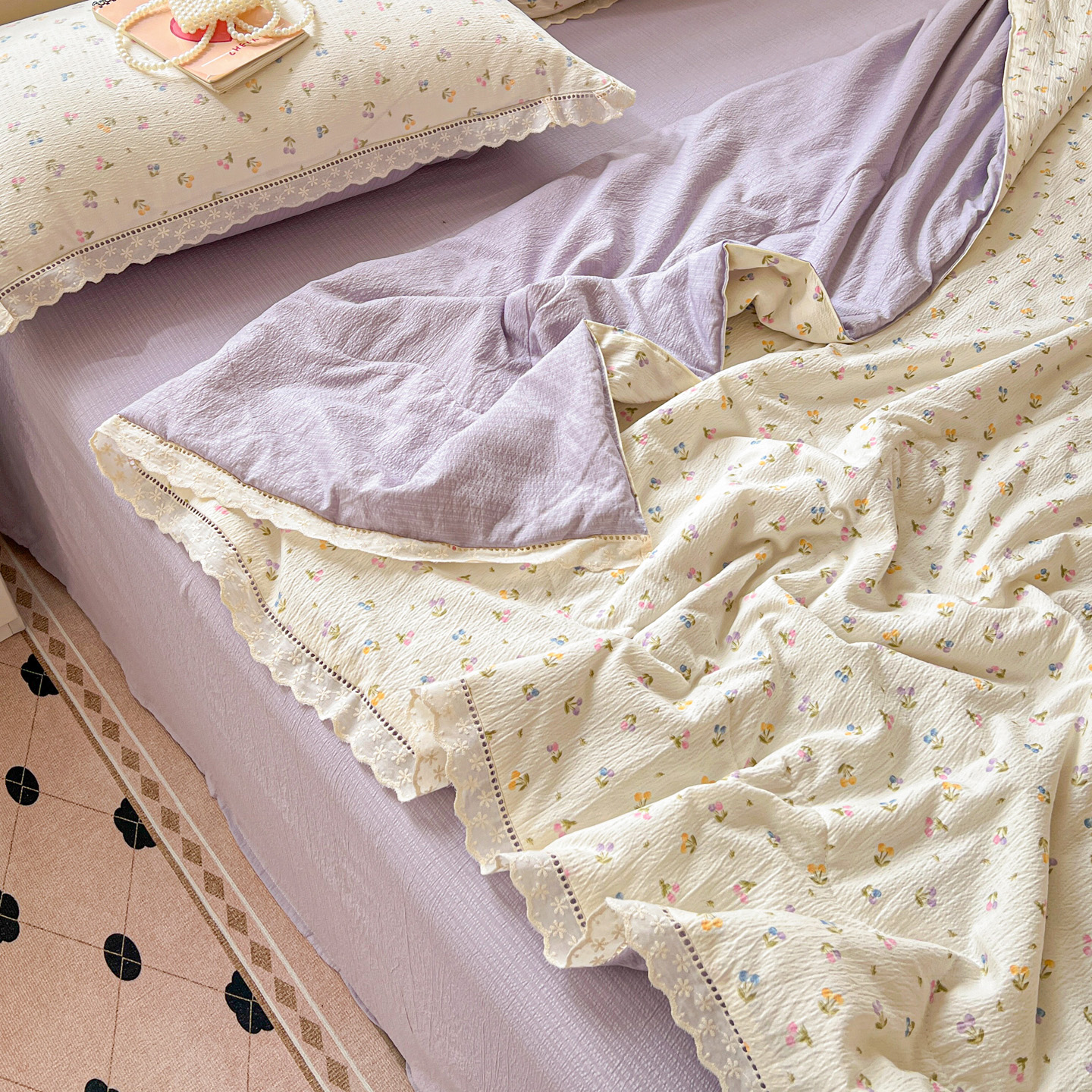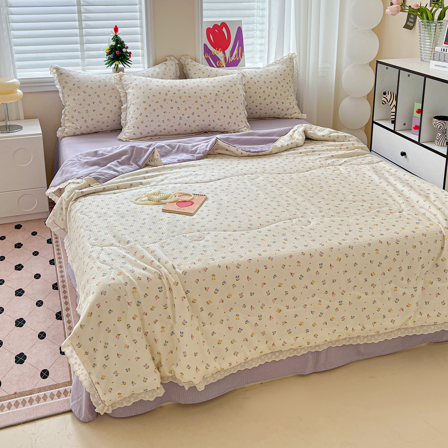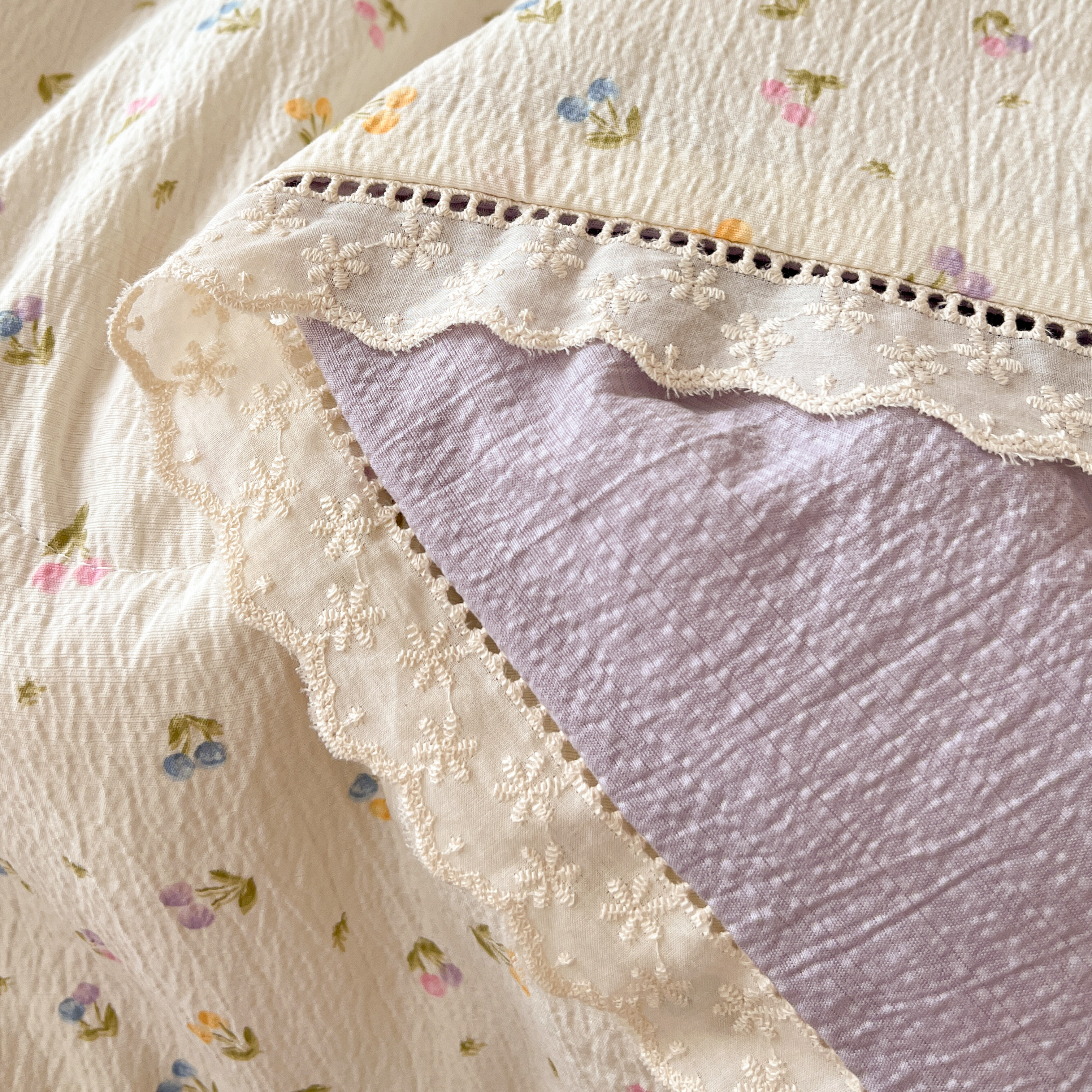 2025新款云感皱皱纱全棉花边款夏被四件套 甜茶