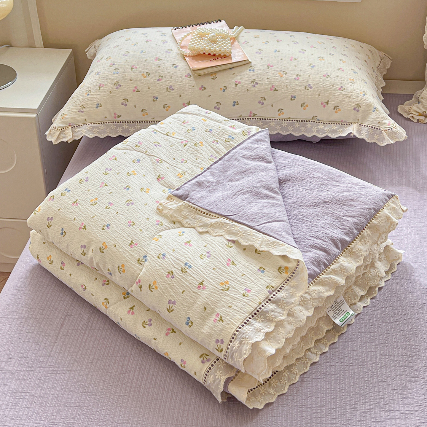商品名称:2025新款云感皱皱纱全棉花边款夏被四件套 甜茶