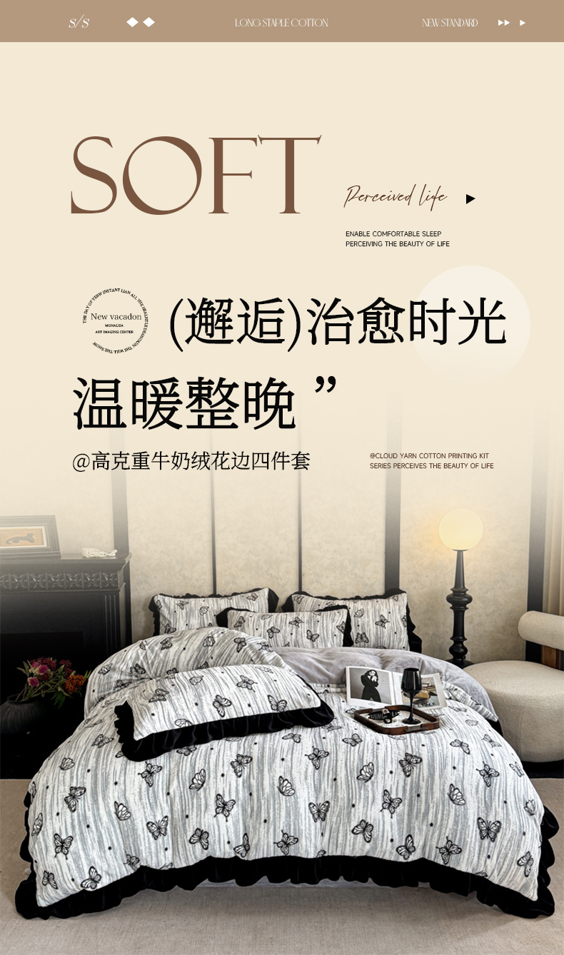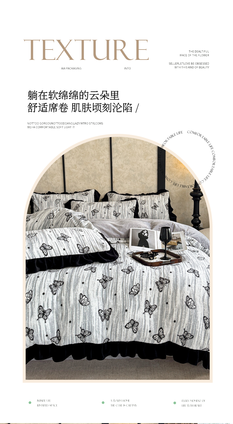 当前位置: 91家纺网 > 商品网购 > 床品套件 > 四件套 > 牛奶绒四件套 > (总)大米家居 2025新款韩版美拉德风高克重雕花牛奶绒四件套-梦蝶系列