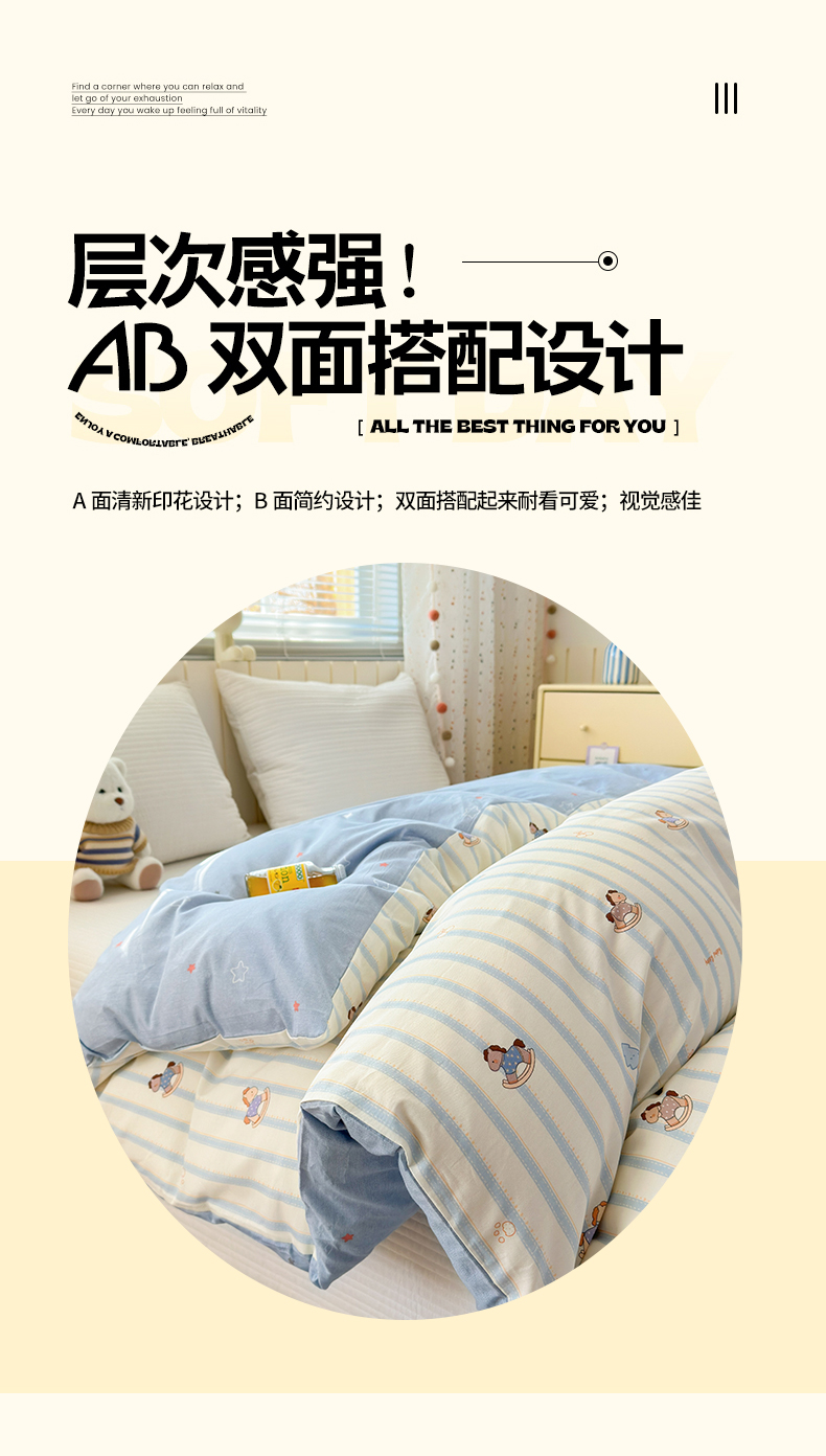 当前位置: 91家纺网 > 商品网购 > 床上用品 > 被套 > 清雅福 2026春夏新款INS小清新40支全棉13372单被套第二批 跷跷马