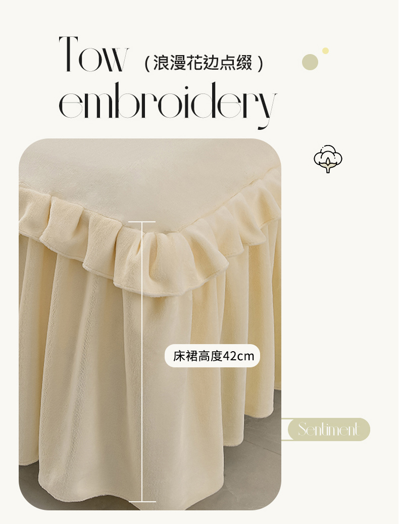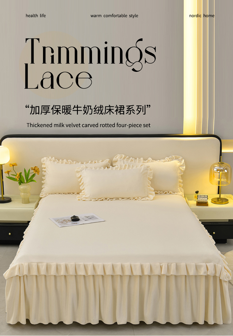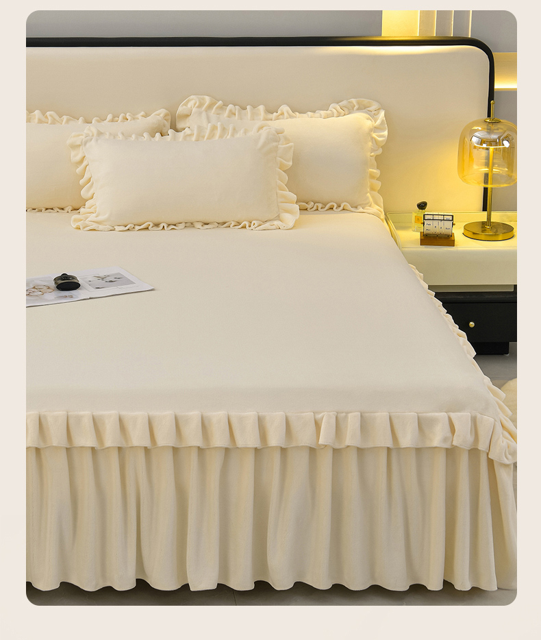 优家居工厂店 2026新款纯色韩版花边牛奶绒床裙床罩加厚直播外贸可定做 盛世-米白