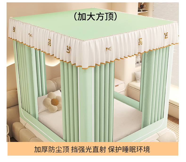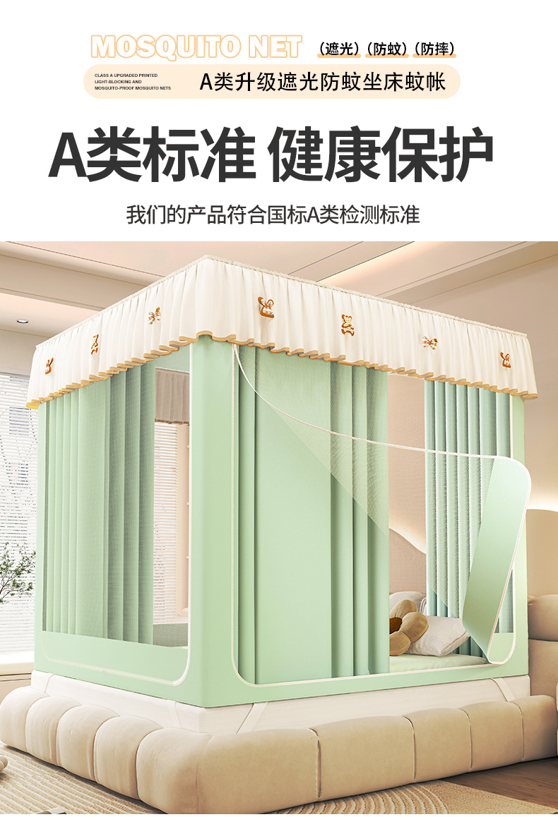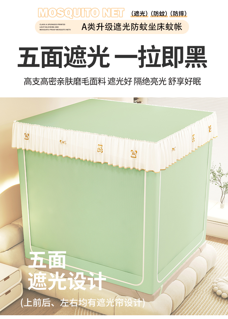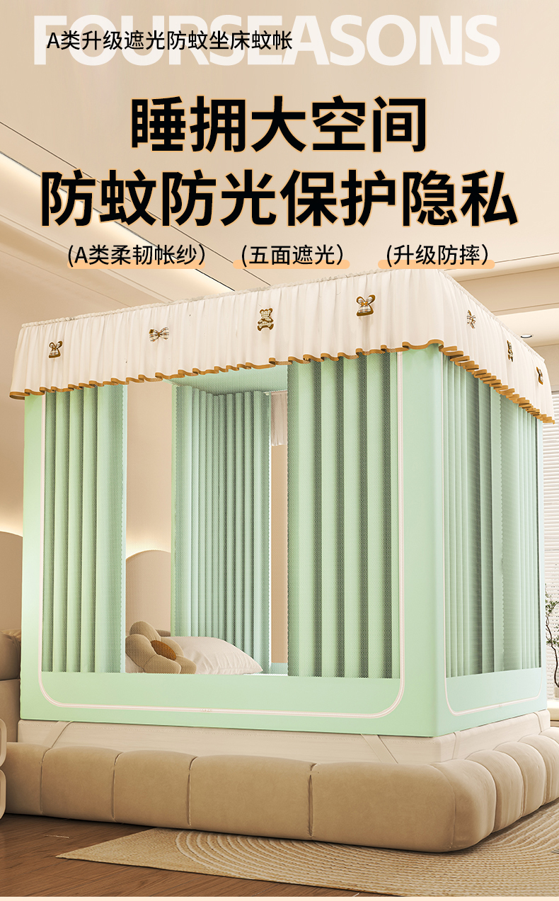 • 91家纺网 家纺一手货源 找家纺 初心家纺 2026新款时尚ins拉链式防摔坐床 床帘款遮光蚊帐 果绿(带帘)