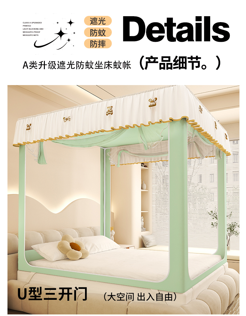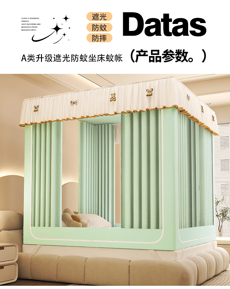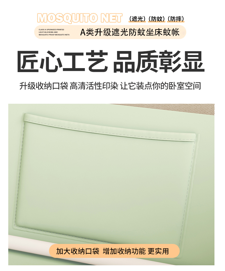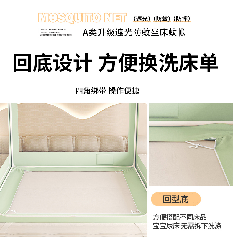 • 91家纺网 家纺一手货源 找家纺 初心家纺 2026新款时尚ins拉链式防摔坐床 床帘款遮光蚊帐 果绿(带帘)