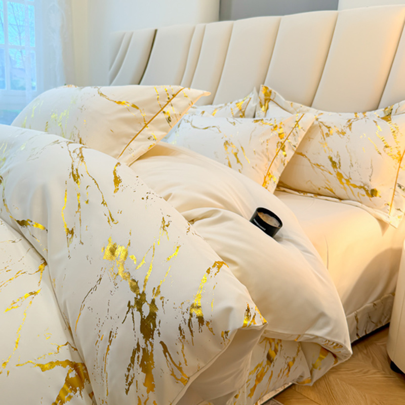 棠颂家纺 2026新款直播热款沐光天丝烫金四件套吊边床单一字绣(礼盒款) 鎏金岁月-白金