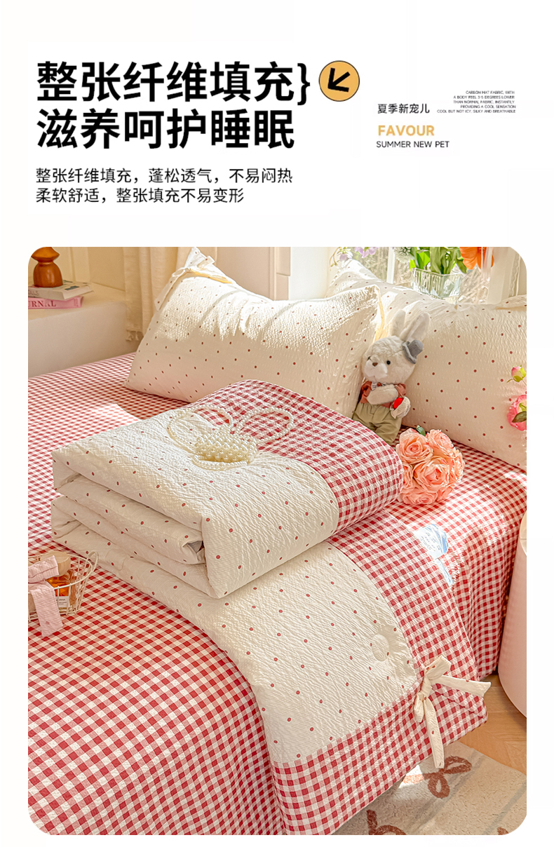 • 91家纺网 家纺一手货源 找家纺 爱彼家纺 2026春夏新款提花泡芙棉拼角蝴蝶结软乎乎的撸猫感单夏被夏被四件套-甜莓气泡 泡芙夏被--奶红波点