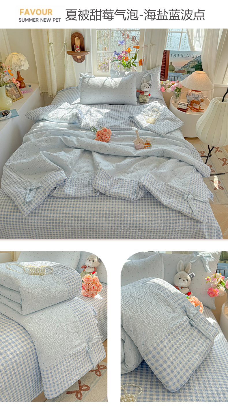 (总)爱彼家纺 2026春夏新款提花泡芙棉拼角蝴蝶结软乎乎的撸猫感单夏被夏被四件套-甜莓气泡,泡芙夏被-海盐蓝波点,泡芙夏被-奶粉波点,泡芙夏被--奶红波点,泡芙夏被--奶灰波点,组合图仅供参考不可下单