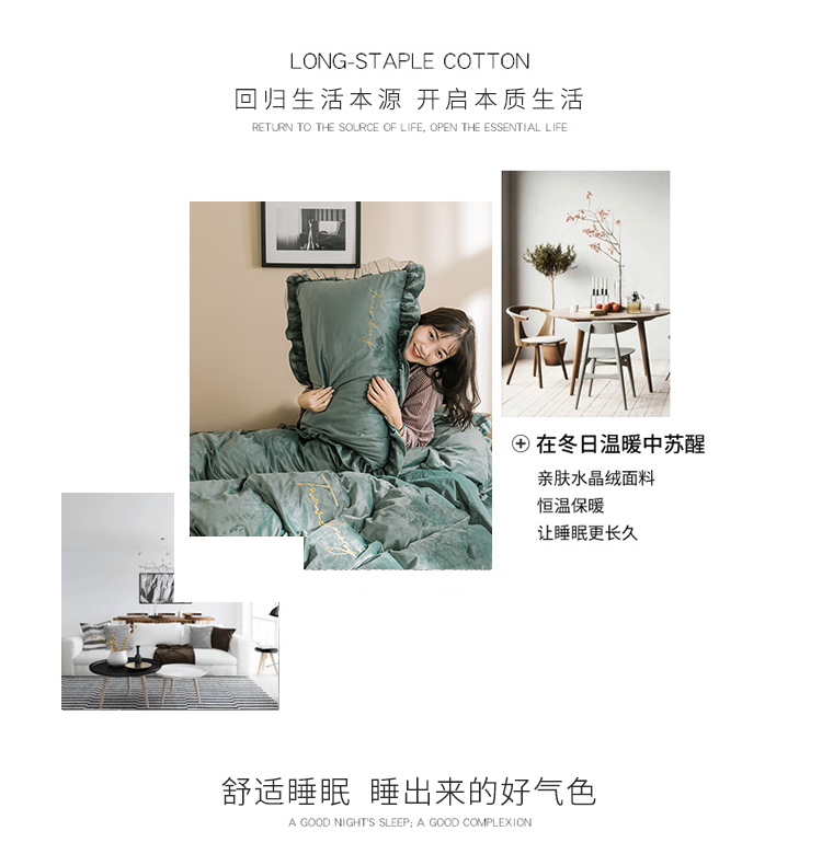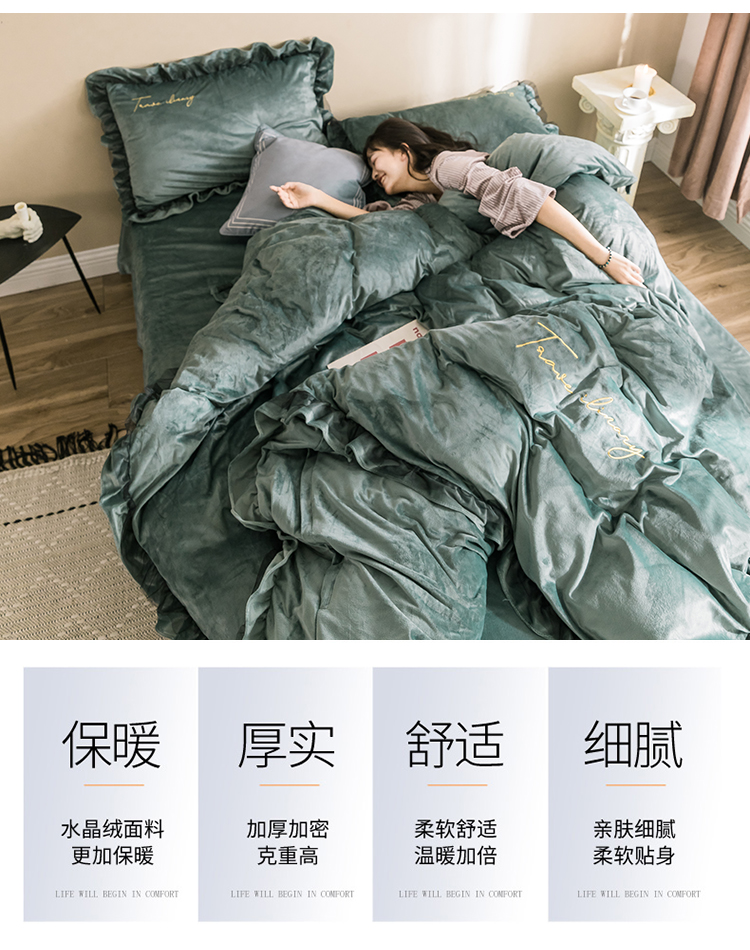 润缦 2019新款水晶绒蕾丝边四件套 蕾丝-英伦绿